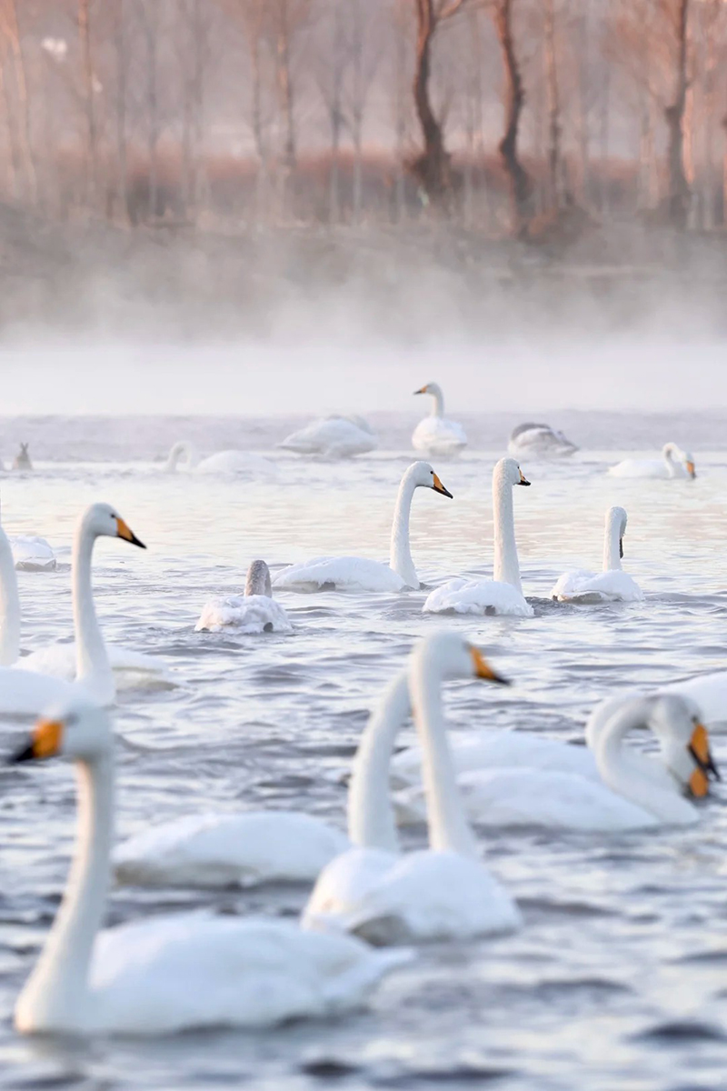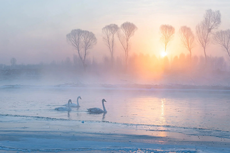 - 早起集合前往『杨柳湾天鹅湖』,这里的日出、天鹅、晨雾非常出片,运气好的话还能欣赏到这里绝美的雾凇美景!