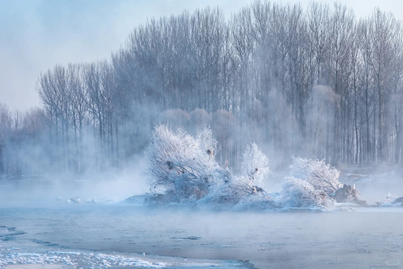 雾松岛是松花江上冲击而成的江中小岛,因雾凇多且美丽而得名,常能拍出风光大片,受到大批摄影爱好者的追捧。每到寒冬,不冻的江水中升腾的水雾遇冷,在树上凝结为霜花,从远处看正是传说中的玉树琼花,美不胜言。
