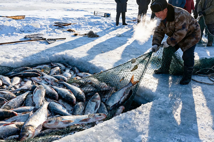 查干湖冬捕是吉林省前郭尔罗斯蒙古族自治县传统冬季渔业生产方式,起源于辽金时期,以祭湖、醒网、凿冰、撒网等流程形成独特渔猎文化。该习俗于2008年被列入国家级非物质文化遗产名录!装满鱼的网肚无法拉出冰面,只能从狭小的出网口逐条捞出。当渔网被一点点出,“冰湖腾鱼”的盛景再次呈现。