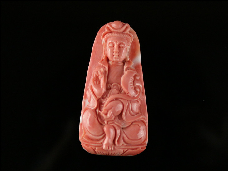 珊瑚如意观音挂坠,观音右手持如意,象征事事如意,立于莲花上,安定人心。雕件立体饱满,线条柔和,顶部开孔,可搭配各类材质珠链与挂绳。