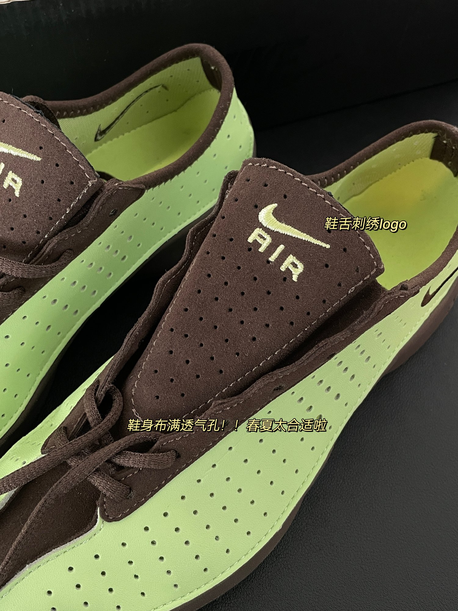 全皮鞋面,内里复合一层薄薄的织物,鞋舌位置是绒面革 全鞋布满透气孔!!春夏太合适了