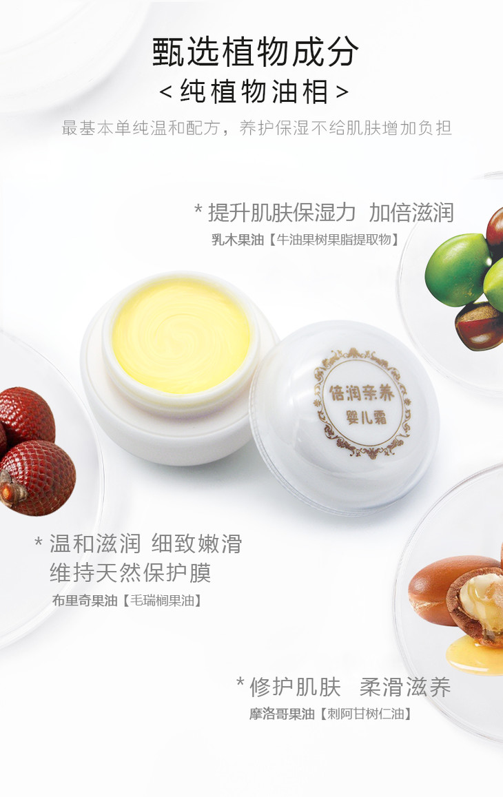 这款婴儿霜(布里奇果油倍润霜前身)是大家很早就要求做的东西,宝宝皮肤娇嫩,要做到温和滋养,安全无刺激,研发总监做了无数次实验才做出了此款婴儿霜,最基本单纯温和配方,养护保湿不给肌肤增加负担!蕴含珍贵的亚马逊产布里奇树提取的布里奇果油,能温和的滋润小婴儿的细皮肤,使皮肤保持细致嫩滑,维持天然的保护膜