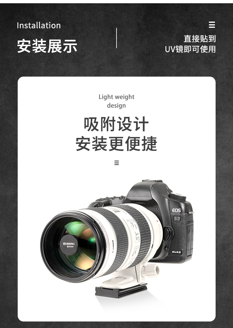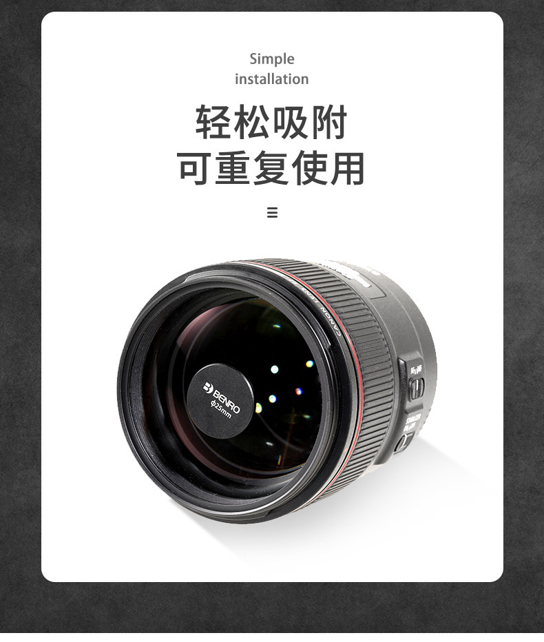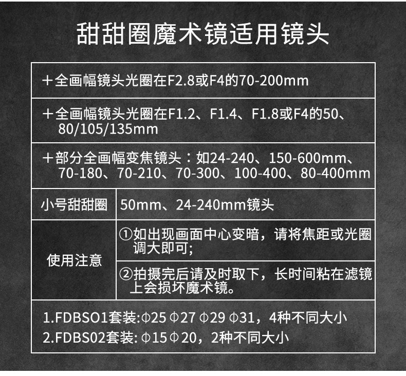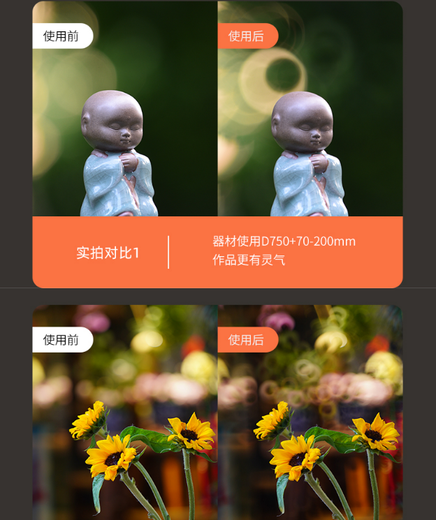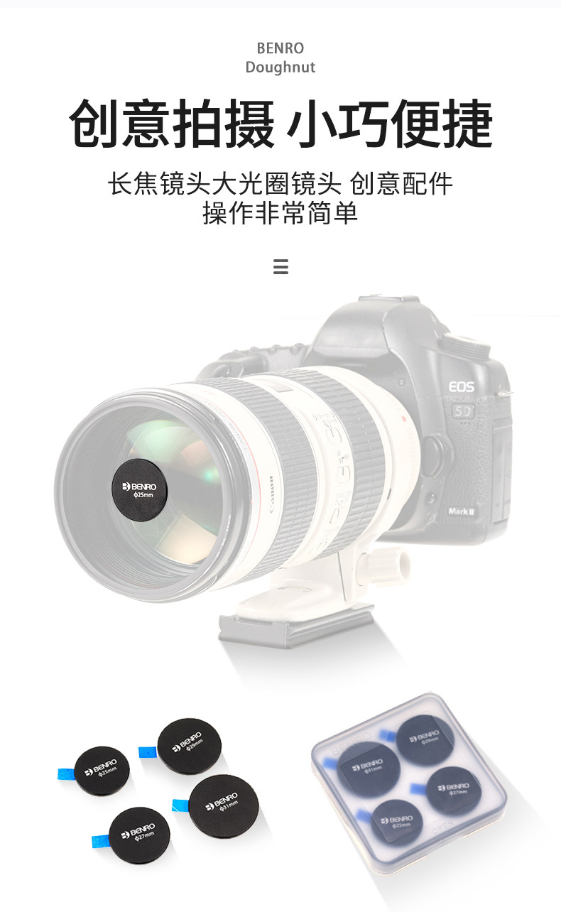 现在有提供了专用的产品,适用于不同焦段的镜头。也比较便宜,解决了上面的两个问题。使用更加的方便,关键是适用于不同的镜头。专用的吸附设计,安装超方便。比自己制作的要好很多。