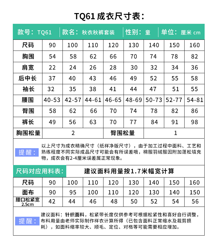 裁缝学苑TQ61中低领儿童秋衣秋裤纸样童装内衣套装服装打板衣服图