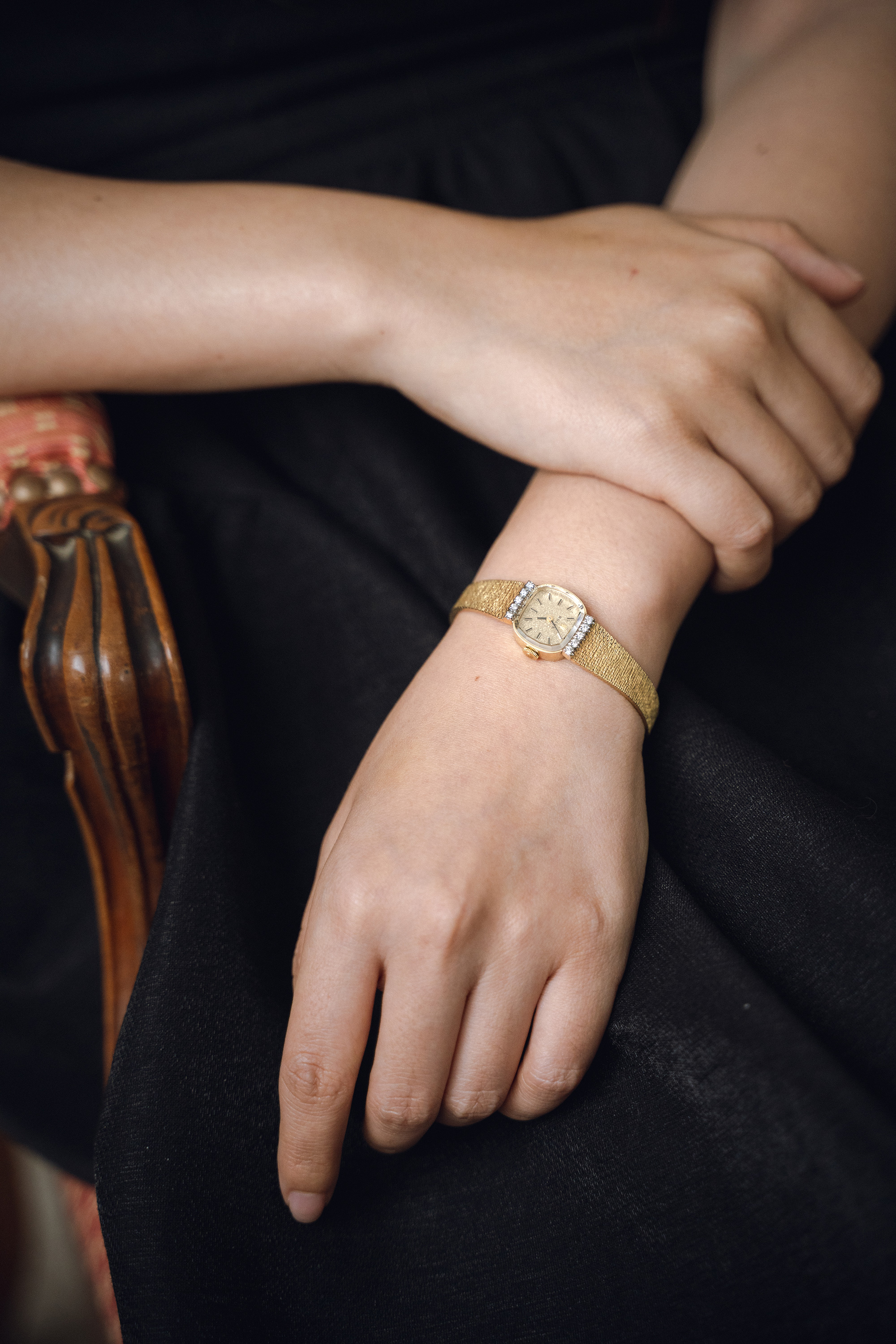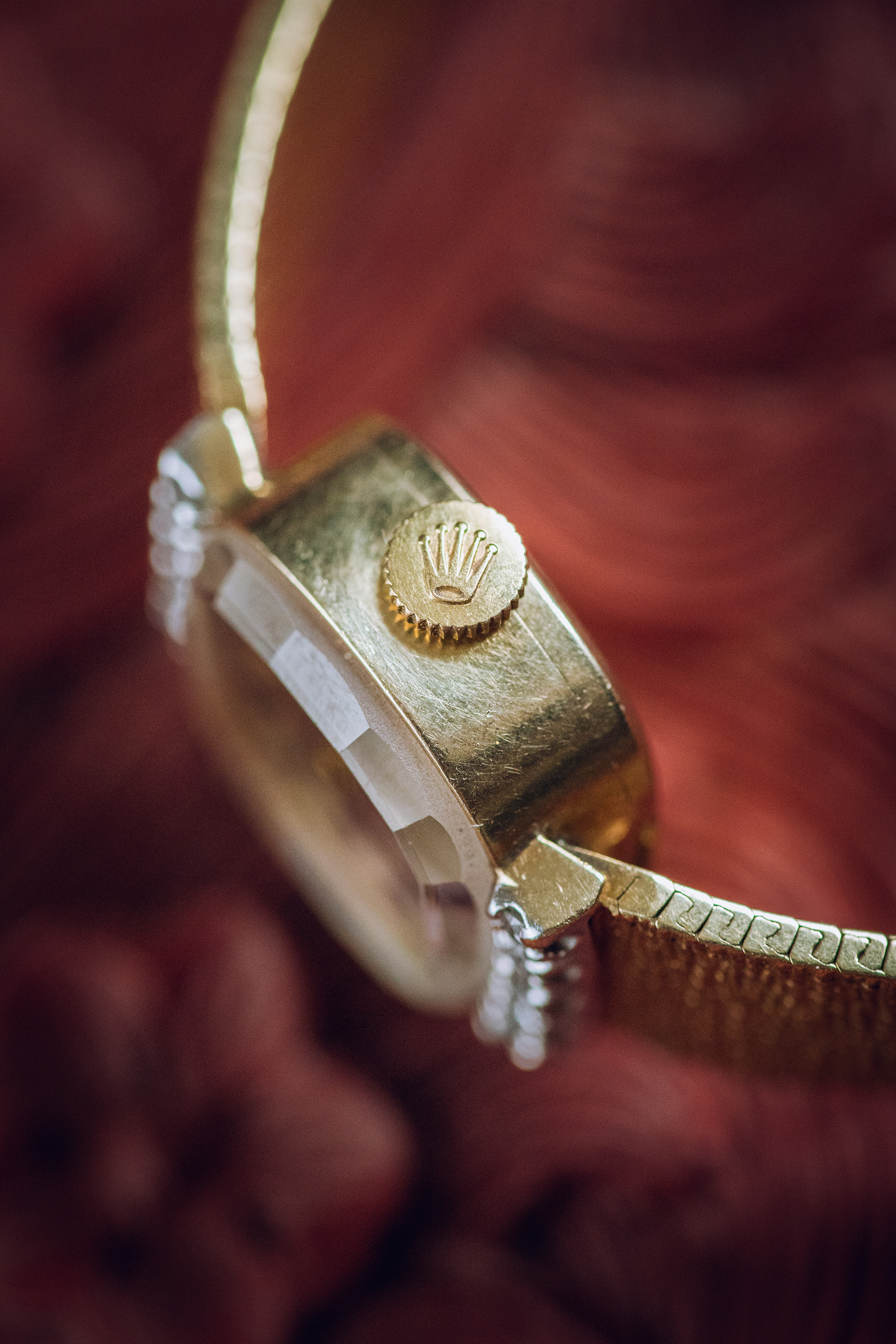 独角鹿西洋古董1970年代瑞士顶级钟表品牌劳力士Rolex出品编织纹理14K黄金表带水晶镶嵌钻石表盘女士腕表