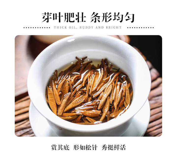 茶条油润饱满少茸毛,紧条状,叶底茶脉清晰,泡后光泽、油亮