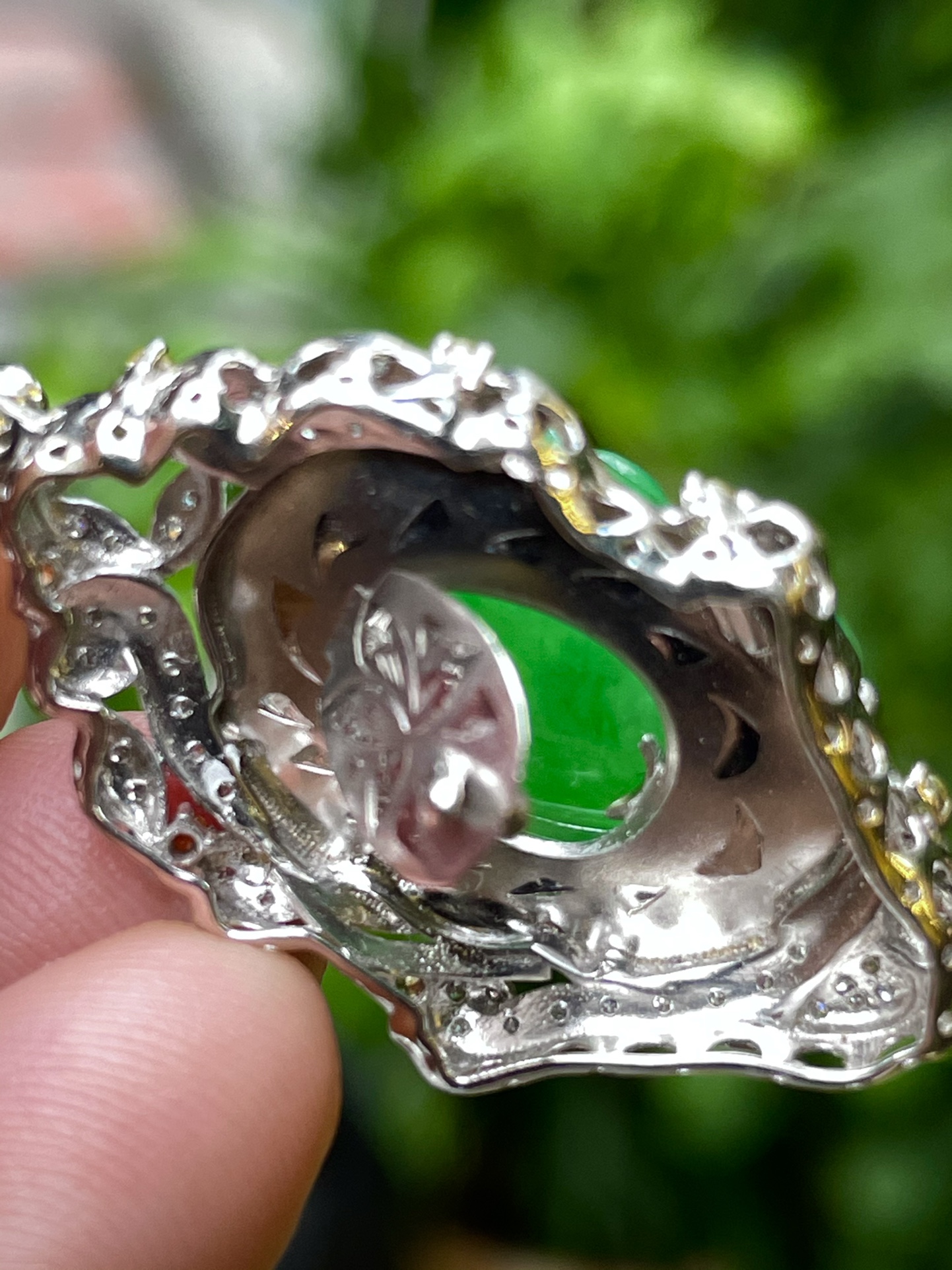 大件饱满,通透水润,玉质细腻,翠色鲜艳,18k金奢华钻石镶嵌