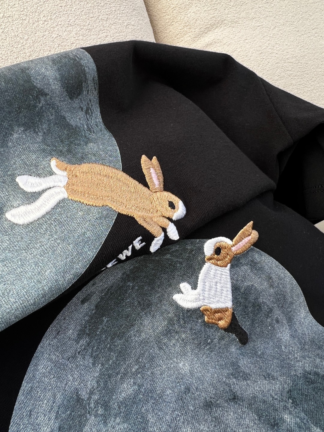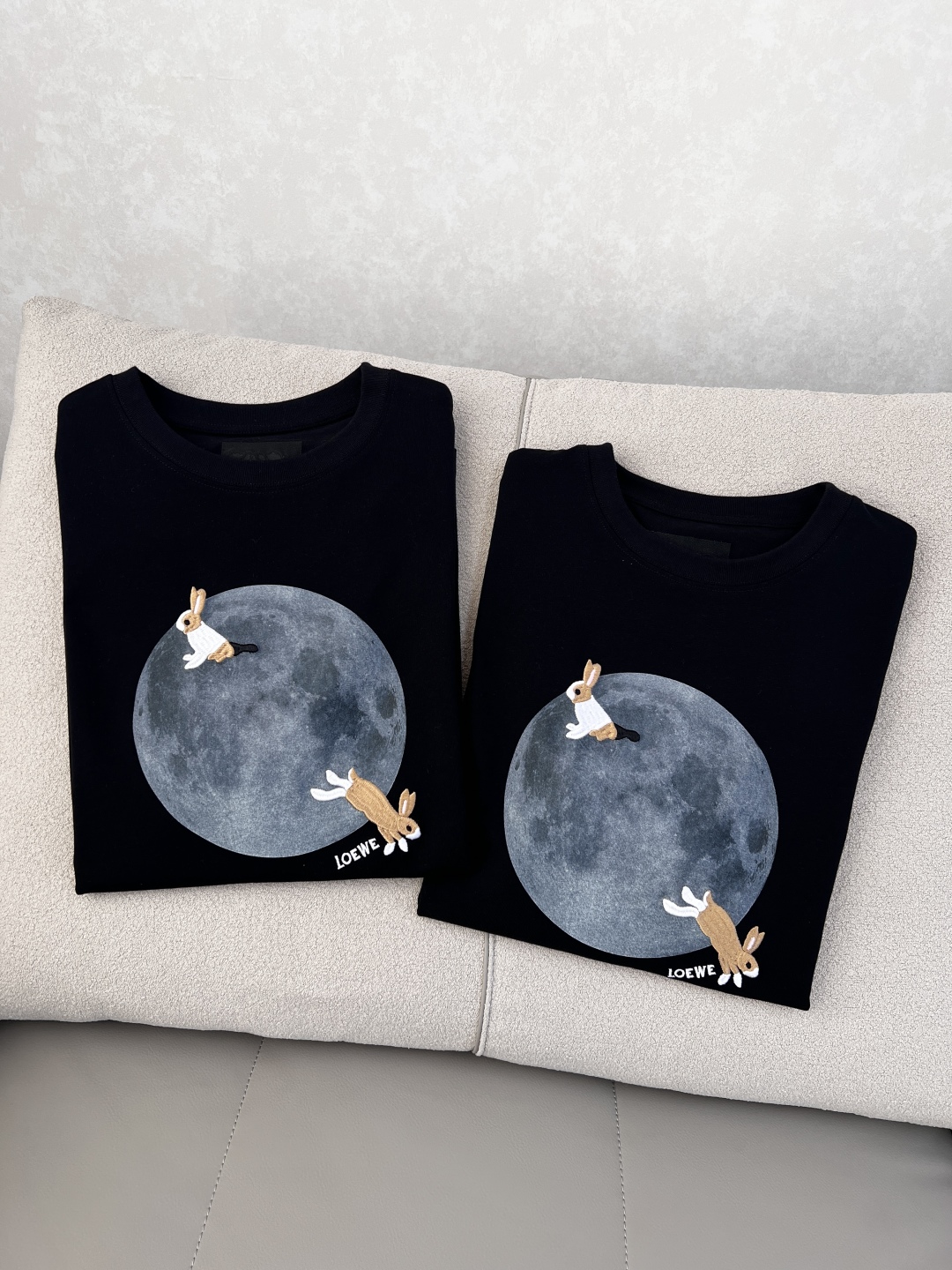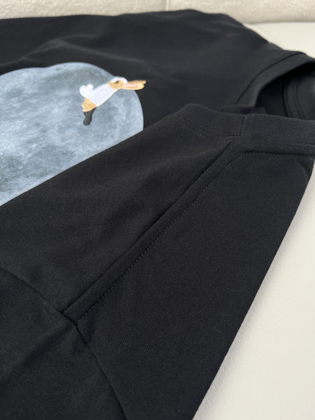 1⃣面料:客供定制进口纱 280g双纱半丝光 精梳面料,手感丝滑 细腻有质感 2⃣胸前🌕月球印花:采用进口机 白墨直喷,油画艺术,视觉效果逼真、层次清晰!原版一比一复刻✌➕跳跃的兔子🐰:进口特种机🪡立体刺绣 层次分明 定位精准、生动活泼3⃣后领Logo徽章标识设计,立体刺绣图案!反面烫衬布纯人工工艺到位,处处微小细节拉满4⃣廓形剪裁设计,宽松版型
