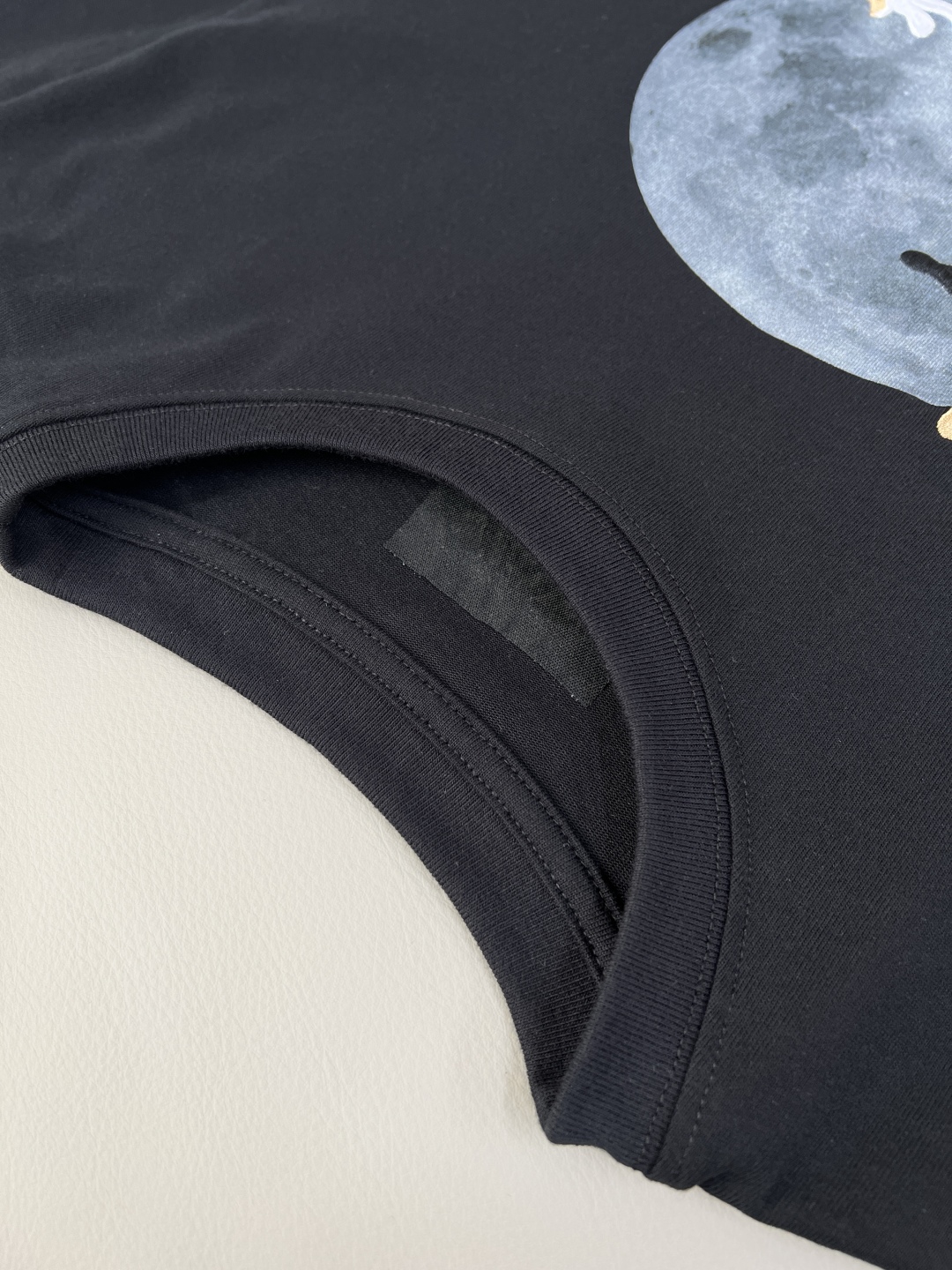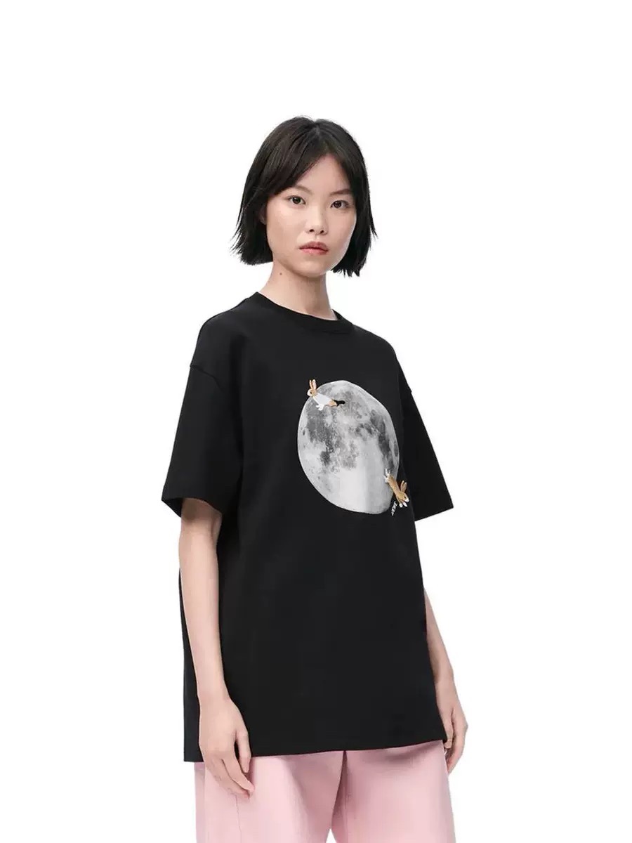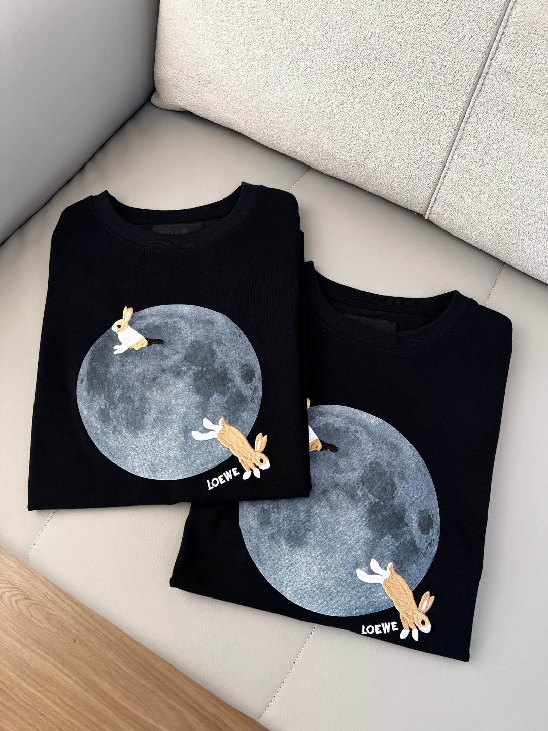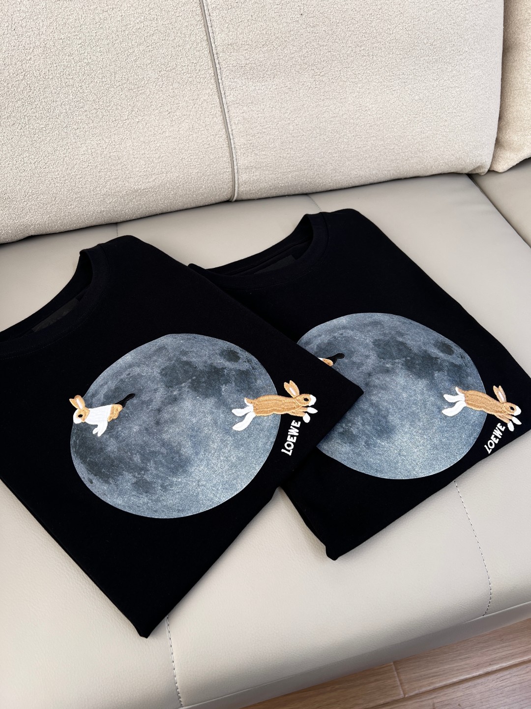 1⃣面料:客供定制进口纱 280g双纱半丝光 精梳面料,手感丝滑 细腻有质感 2⃣胸前🌕月球印花:采用进口机 白墨直喷,油画艺术,视觉效果逼真、层次清晰!原版一比一复刻✌➕跳跃的兔子🐰:进口特种机🪡立体刺绣 层次分明 定位精准、生动活泼3⃣后领Logo徽章标识设计,立体刺绣图案!反面烫衬布纯人工工艺到位,处处微小细节拉满4⃣廓形剪裁设计,宽松版型