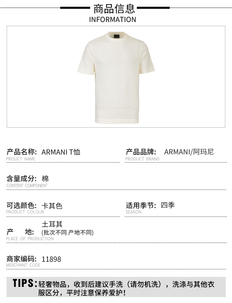 【特惠秒】Emporio Armani 男士全棉针织雕花logo商务休闲短袖T恤 11898