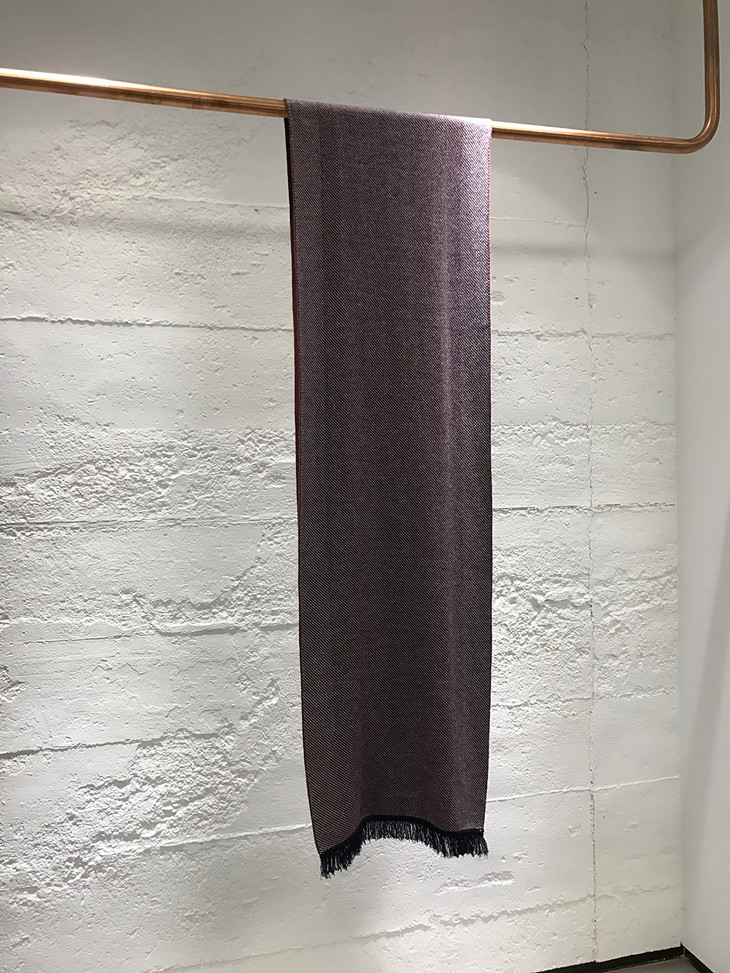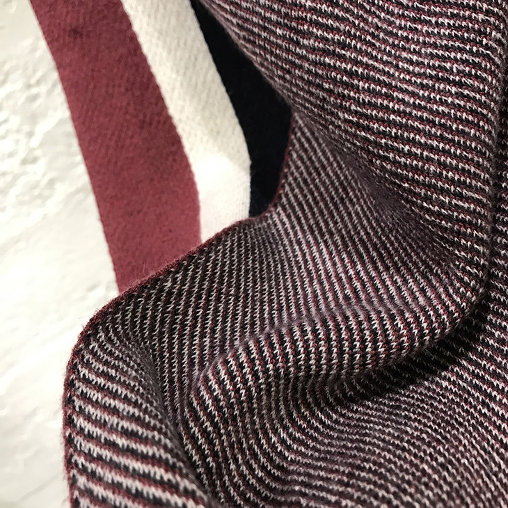 采用2/60全羊绒纱线,运用德国斯托尔机器16针4色斜纹提花。这种针法相当复杂,和以往的平纹提花相比耗时更长,且提花底部不会出会明显痕迹。