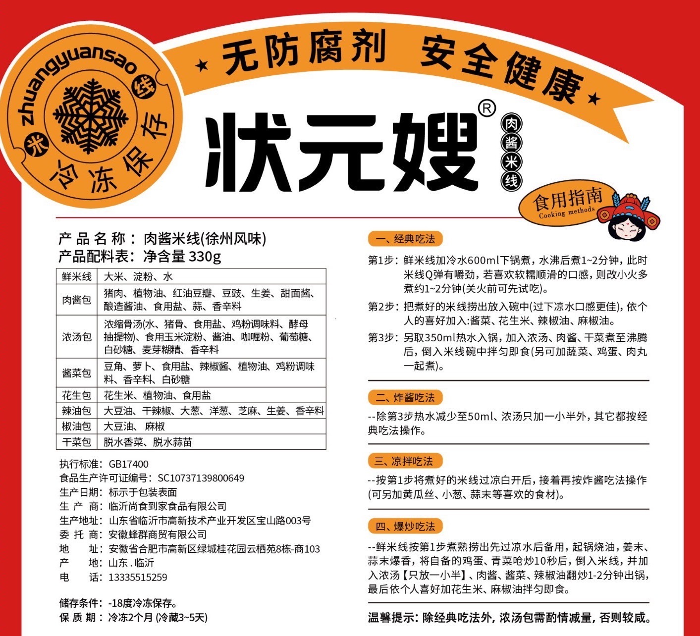规格:状元嫂净重330g /袋 (米线180g+料包150g) 发货快递:顺丰快递 发货时效:72小时内发出 不发货地区:新疆、西藏、港澳台 补运费地区:内蒙、青海、云南、黑龙江首件补12元 每多1件补10元 保存方式:冷冻保存60天,冷藏3到5天,收货后-18度冷冻保存 发货方式:高温灭菌+抽真空+冷冻后发(春秋冬装纸箱) |