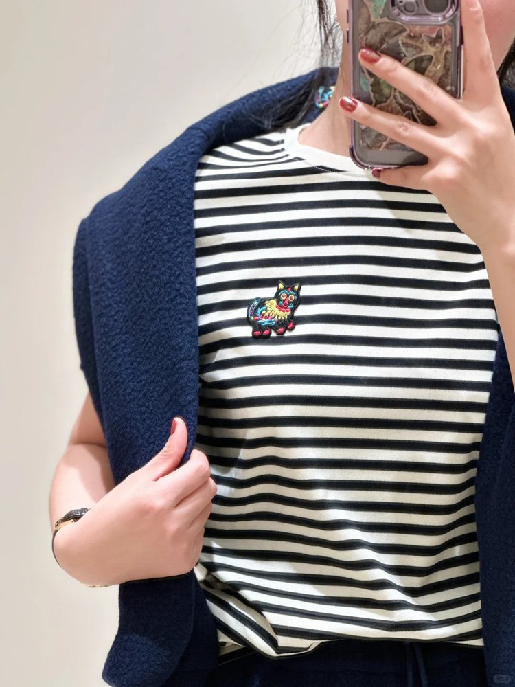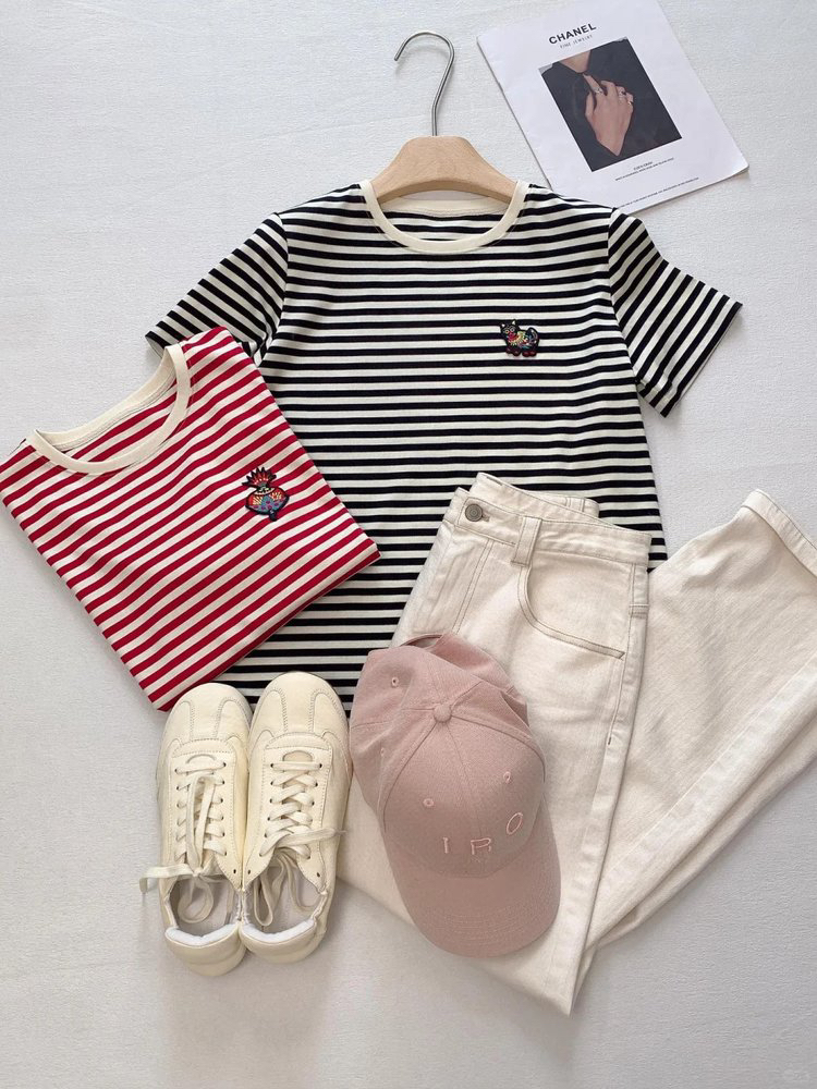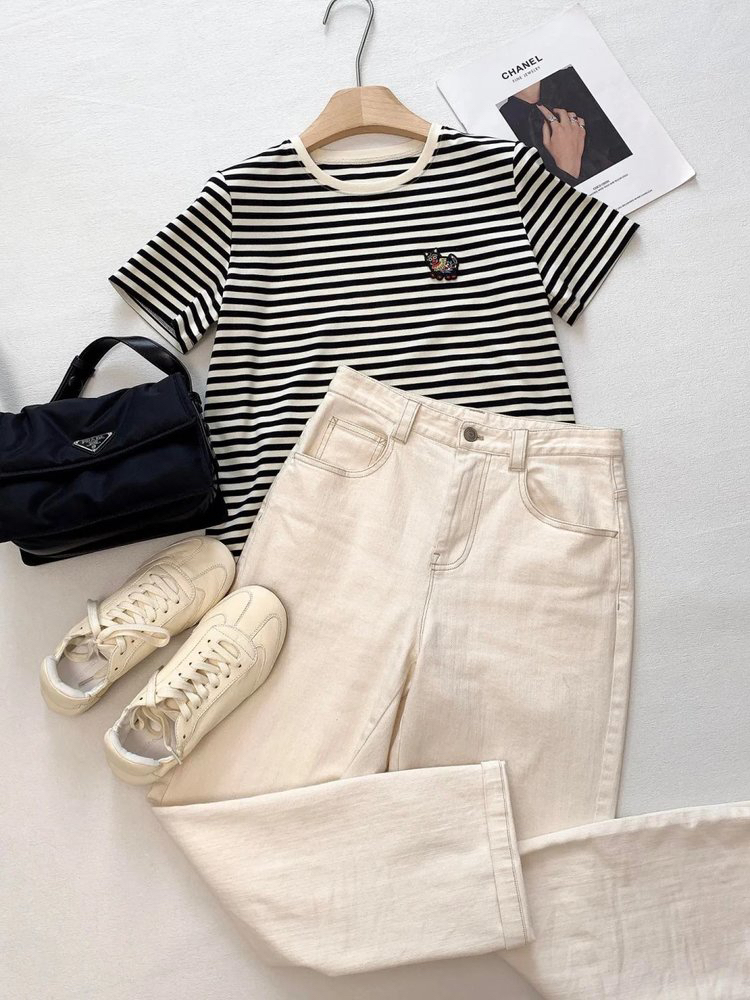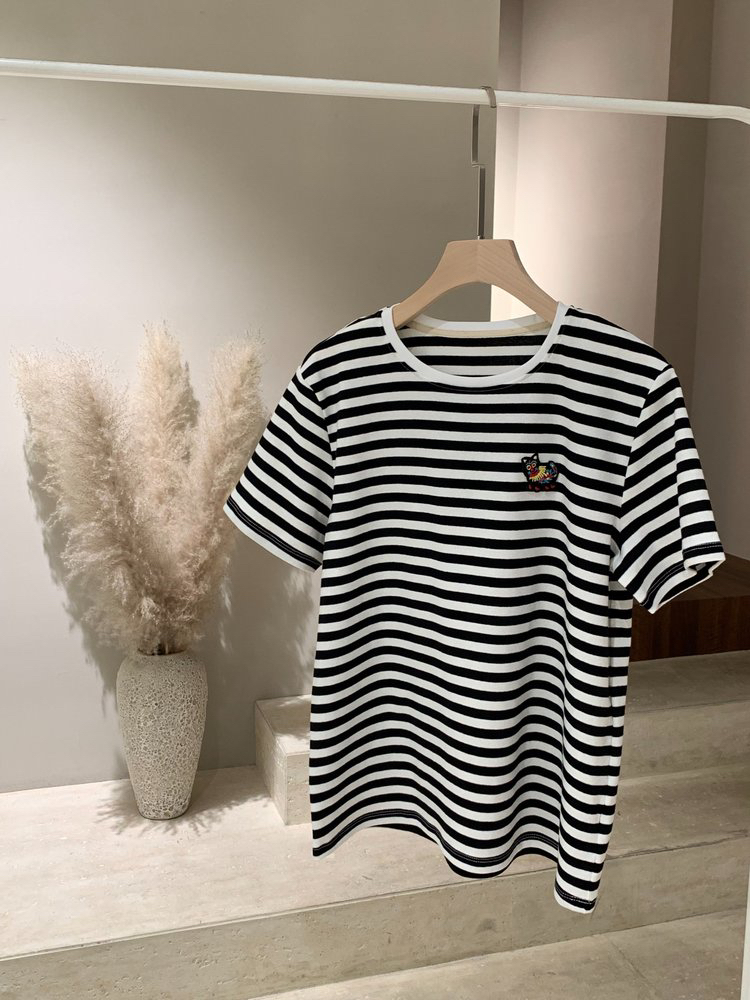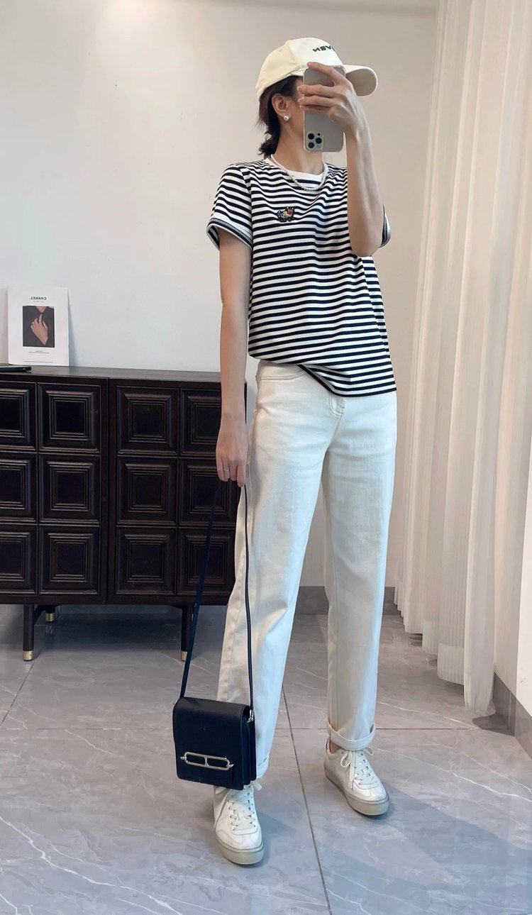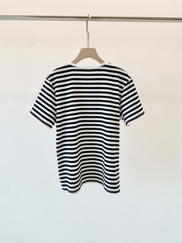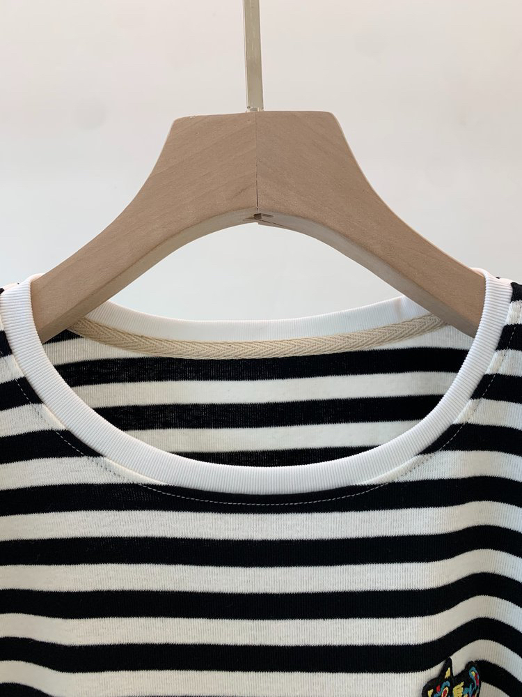 经典的圆领设计,简约又百搭,无论是单穿还是内搭都非常合适。条纹元素更是时尚界的常青树,黑白条纹相间,看起来既简洁又大气,给人一种清新又不失时尚感的视觉效果。