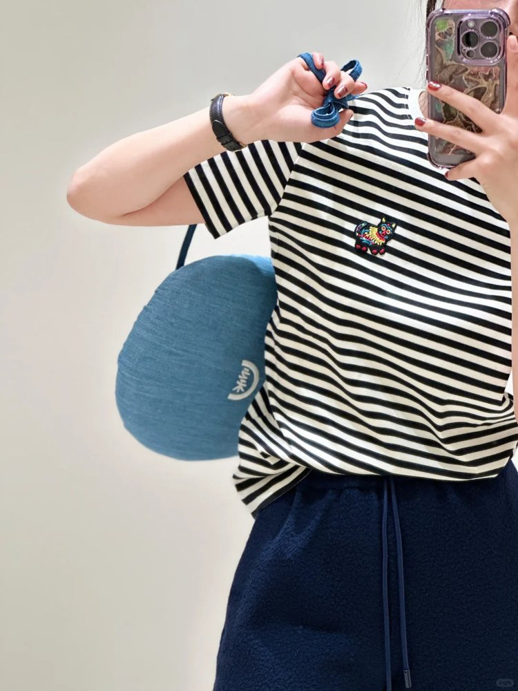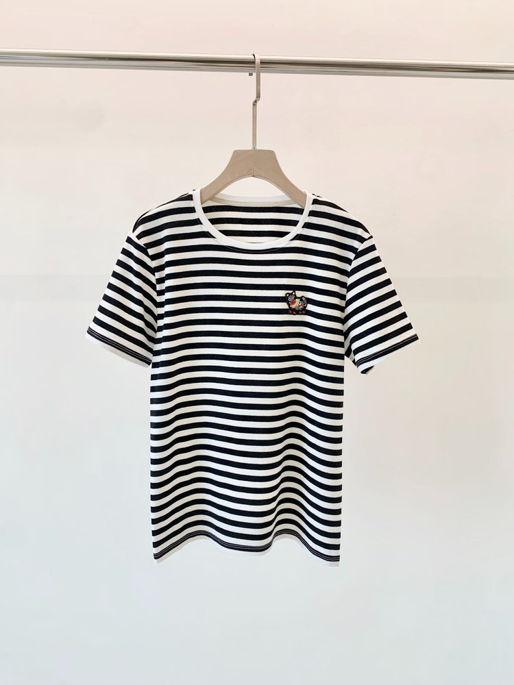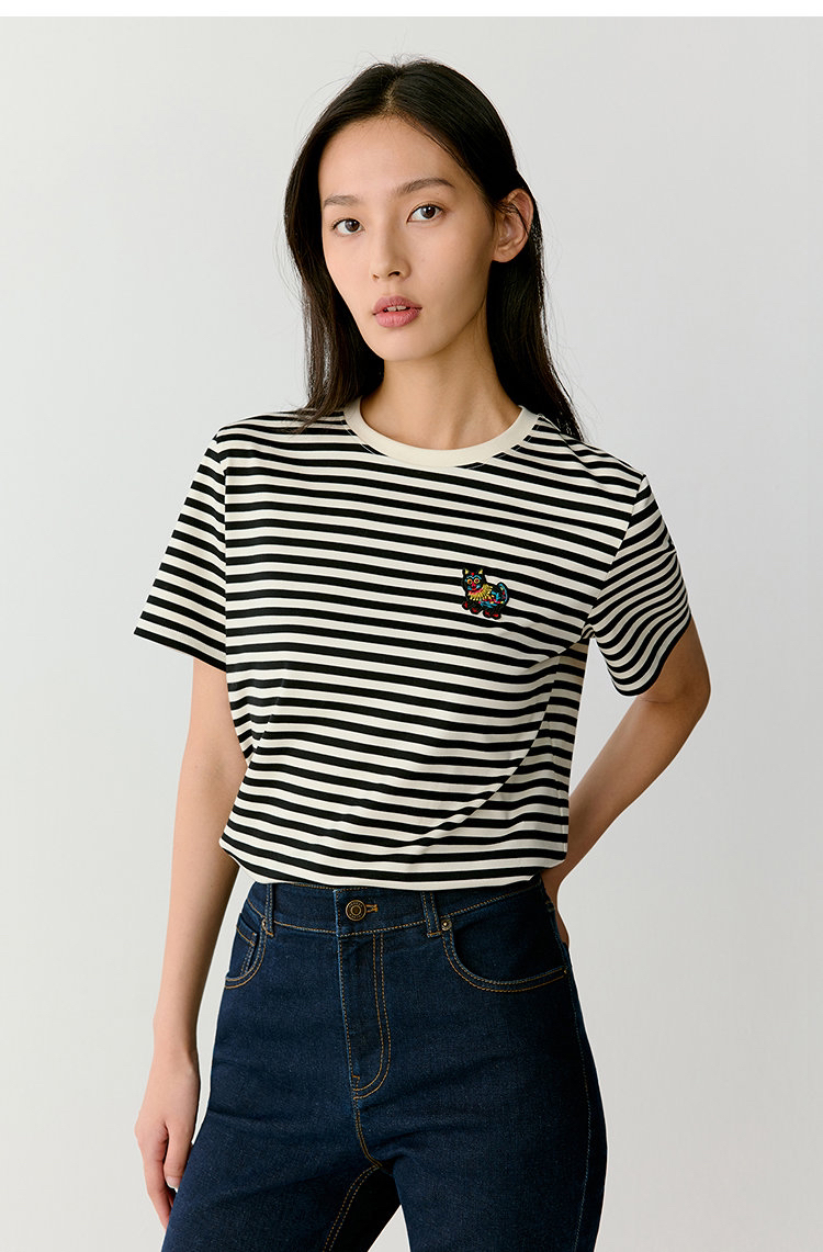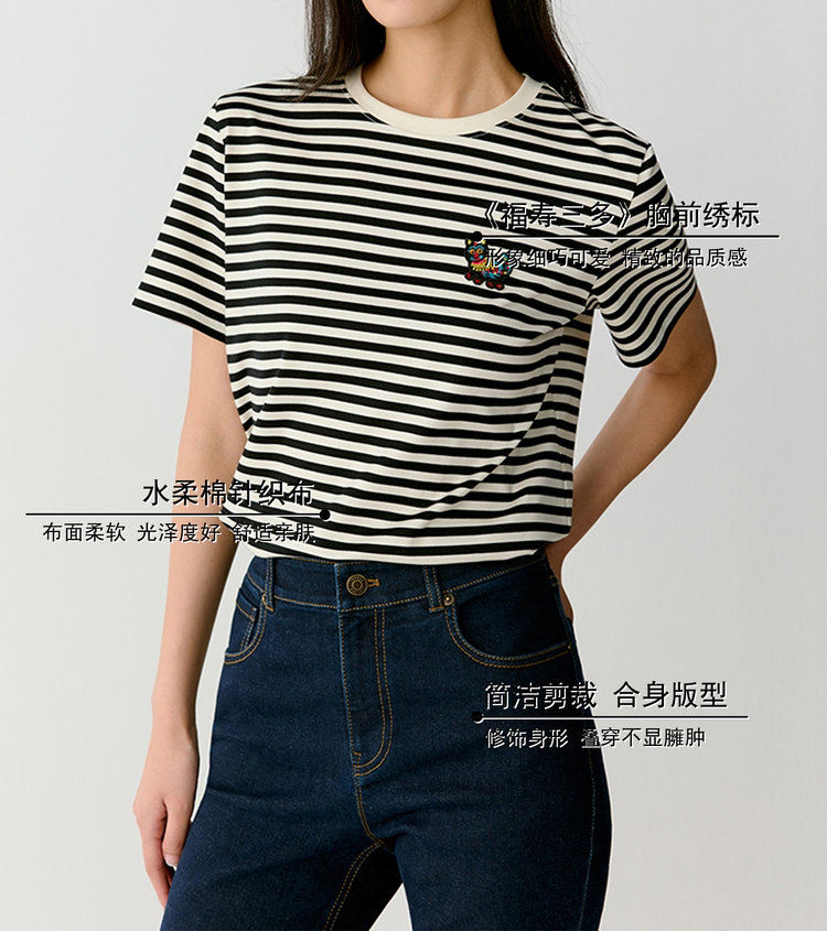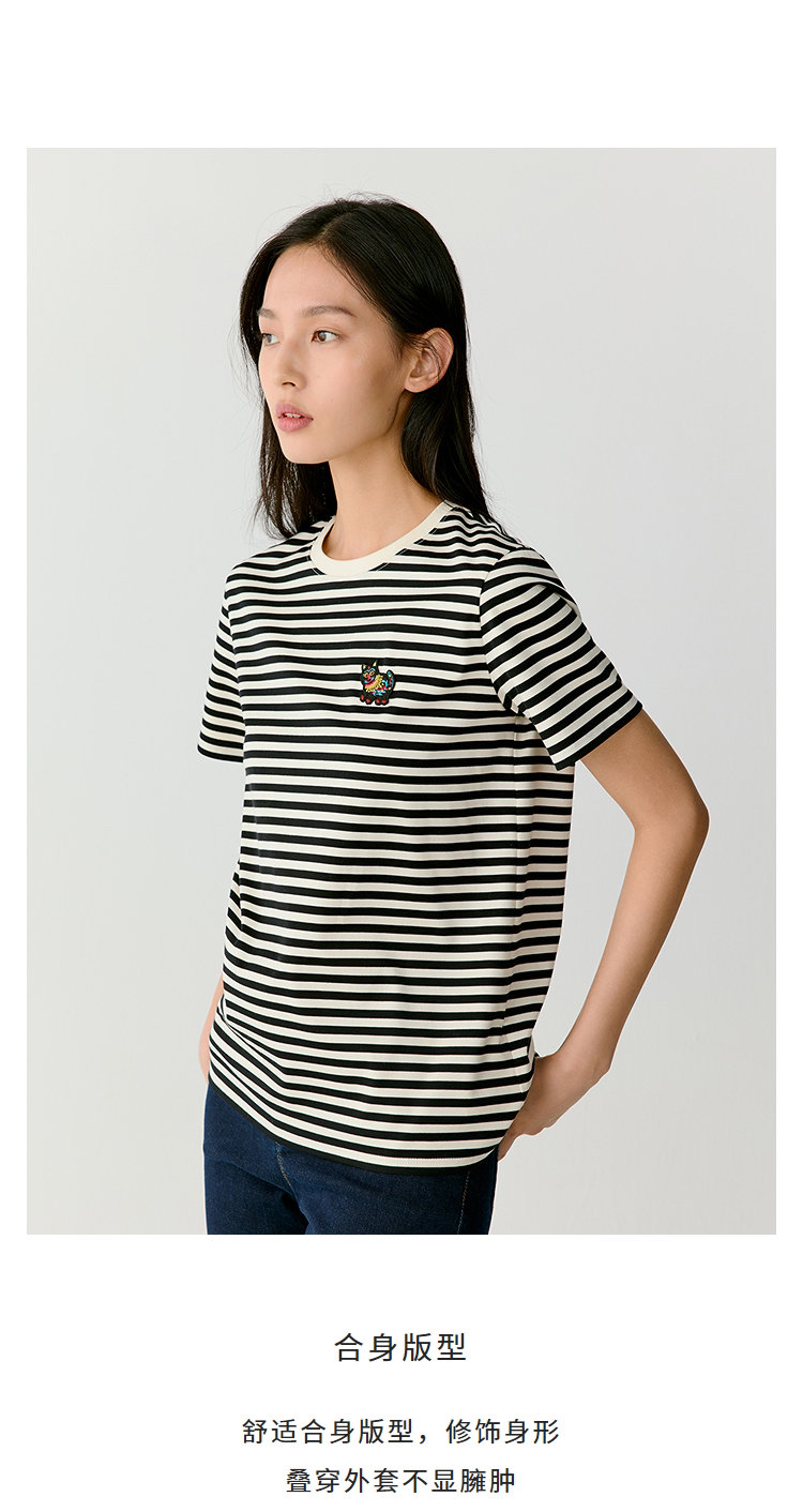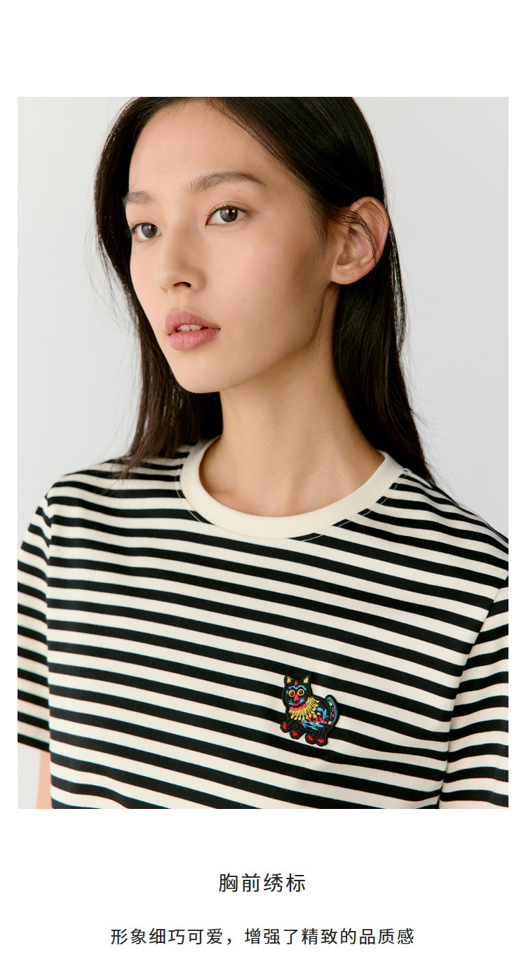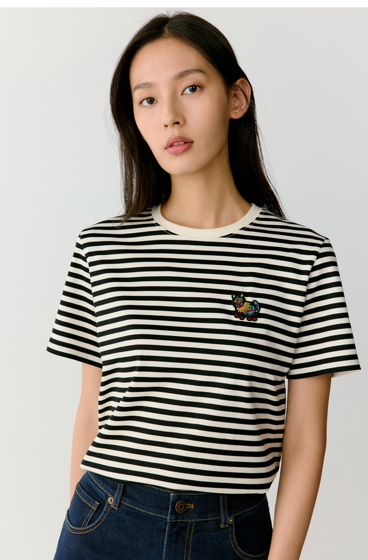 黑白条水柔棉针织布T恤 中国新年胶囊系列 撷取剪纸元素 经典圆领设计 黑白条纹简约大气 全棉面料 手感柔软舒适 精致瑞兽刺绣 直筒版型遮肉显瘦
