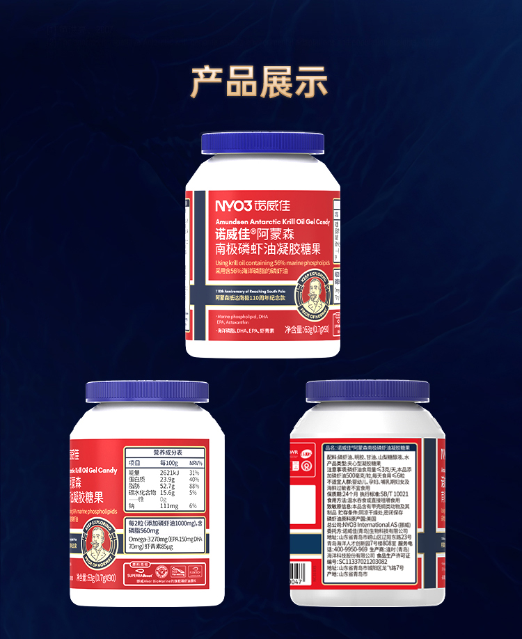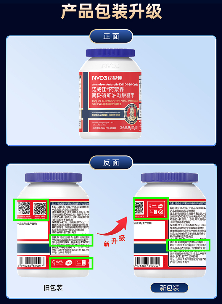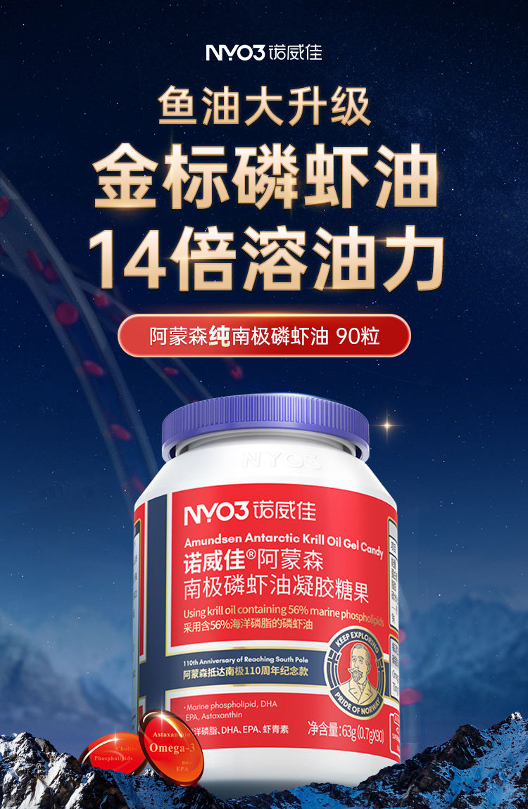 NYO3诺威佳阿蒙森国产线磷虾油和跨境的阿蒙森产品原料、含量、纯度都是一模一样的,都是用的56%磷脂含量的superb boost磷虾油和法国罗赛洛(全球最大胶原蛋白工厂)的胶囊皮,只是一个在国外灌装,一个在国内灌装的区别,原料保证全部进口,效果保证一样。