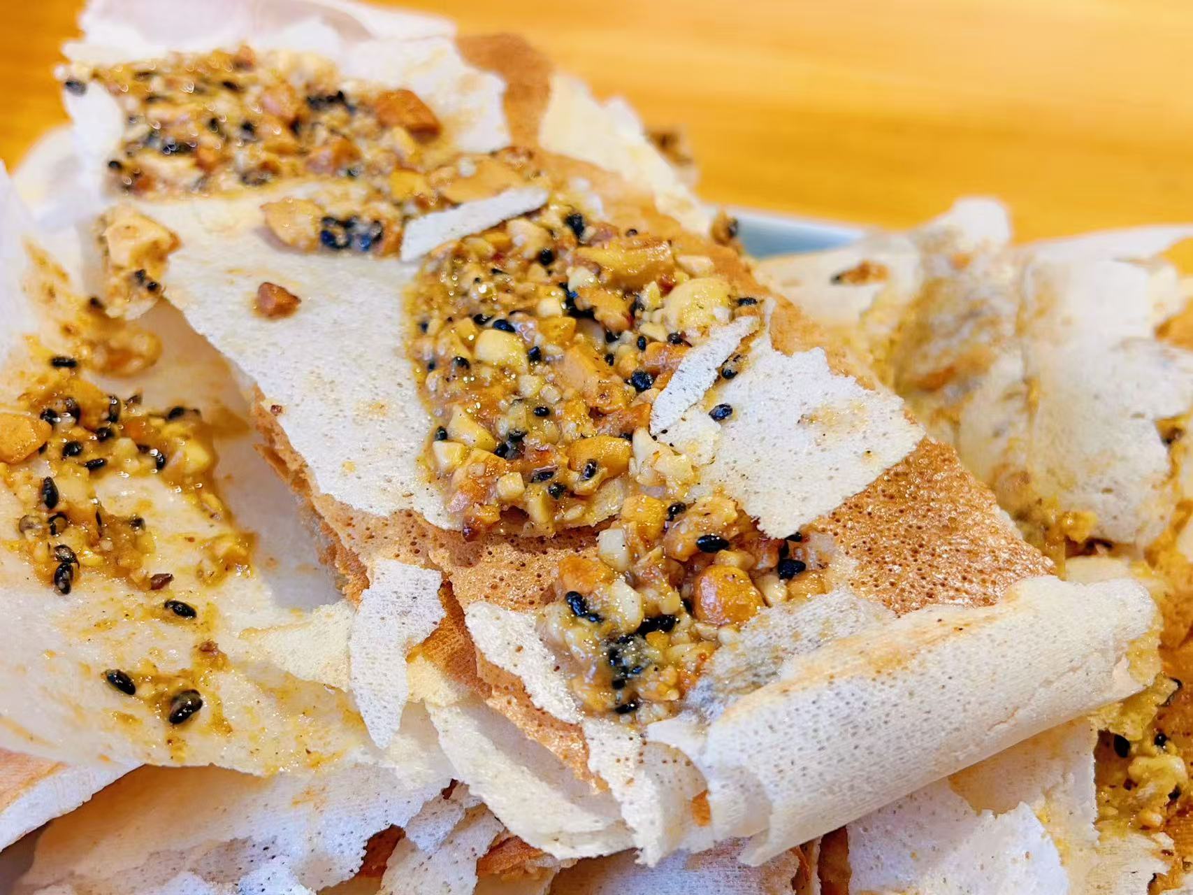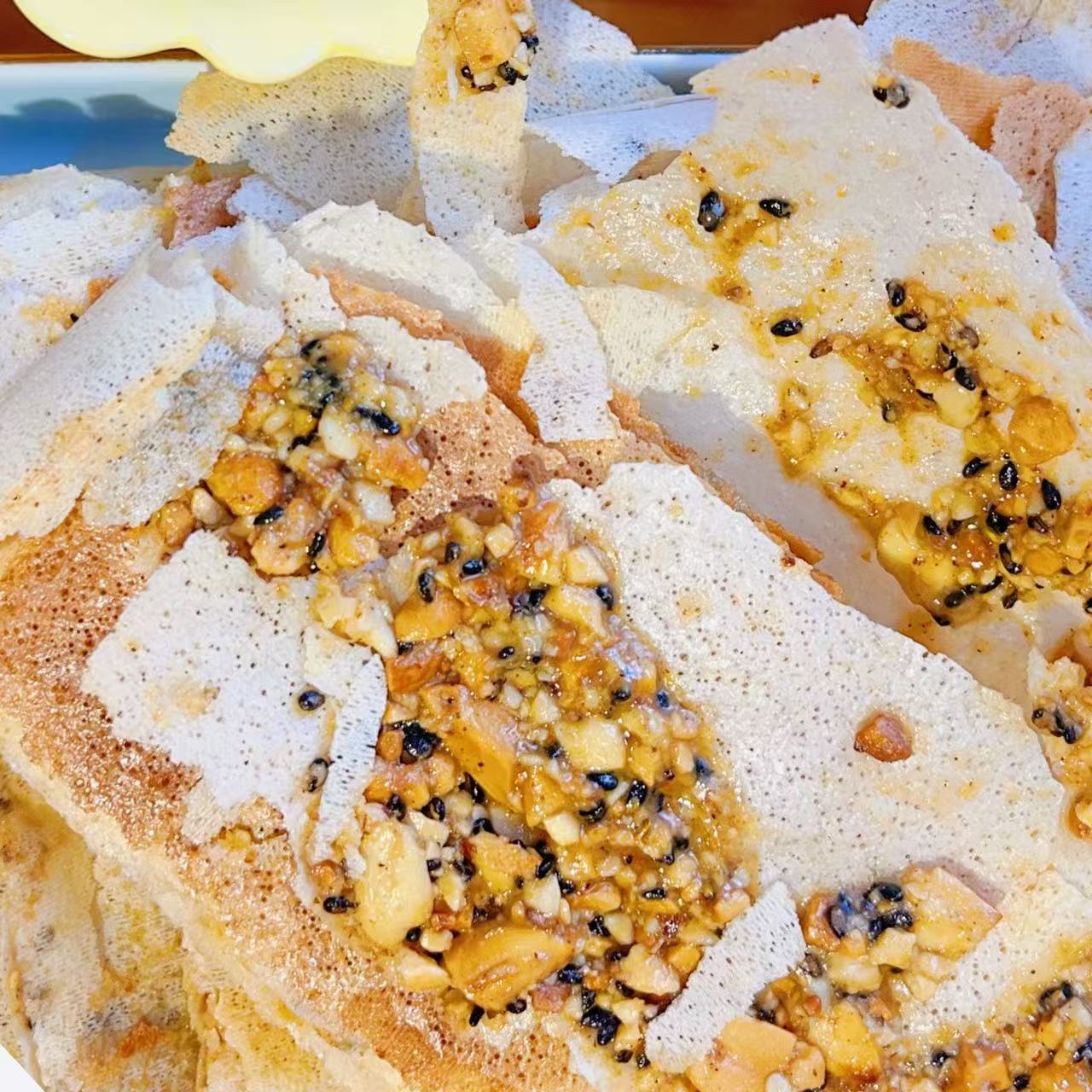 再由老师傅加工成薄脆鲜香的饼皮
