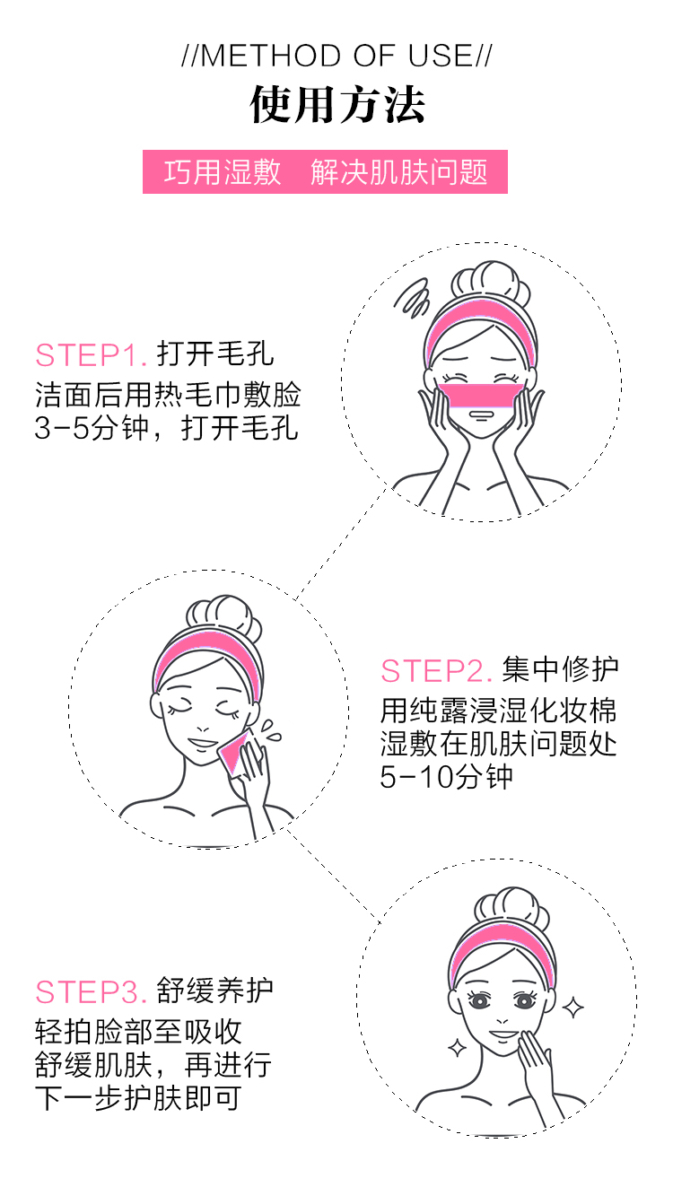 (1)当做爽肤水早晚使用:洁面后,均匀涂抹于脸部及颈部,按摩至吸收;