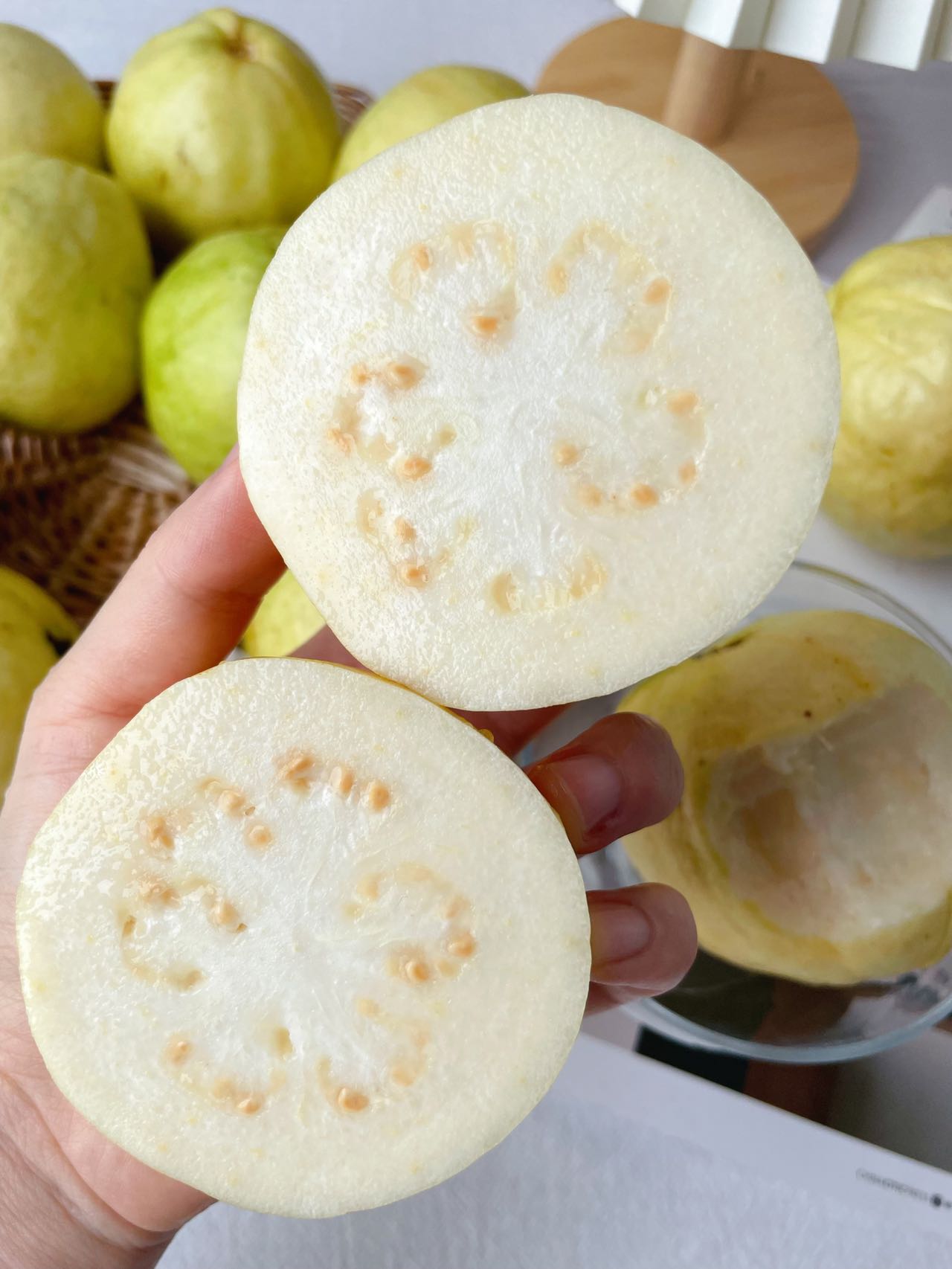 奶油芭乐比较清甜,不用切开,捧在手上就能闻到浓浓的芭乐香味,不用削皮不用吐籽、肉质细嫩、甘甜可口。 硬吃脆爽,软吃香甜糯滑多汁,特殊的果香在嘴里蔓延,值得细细品味。颠覆对传统芭乐寡淡的认知。