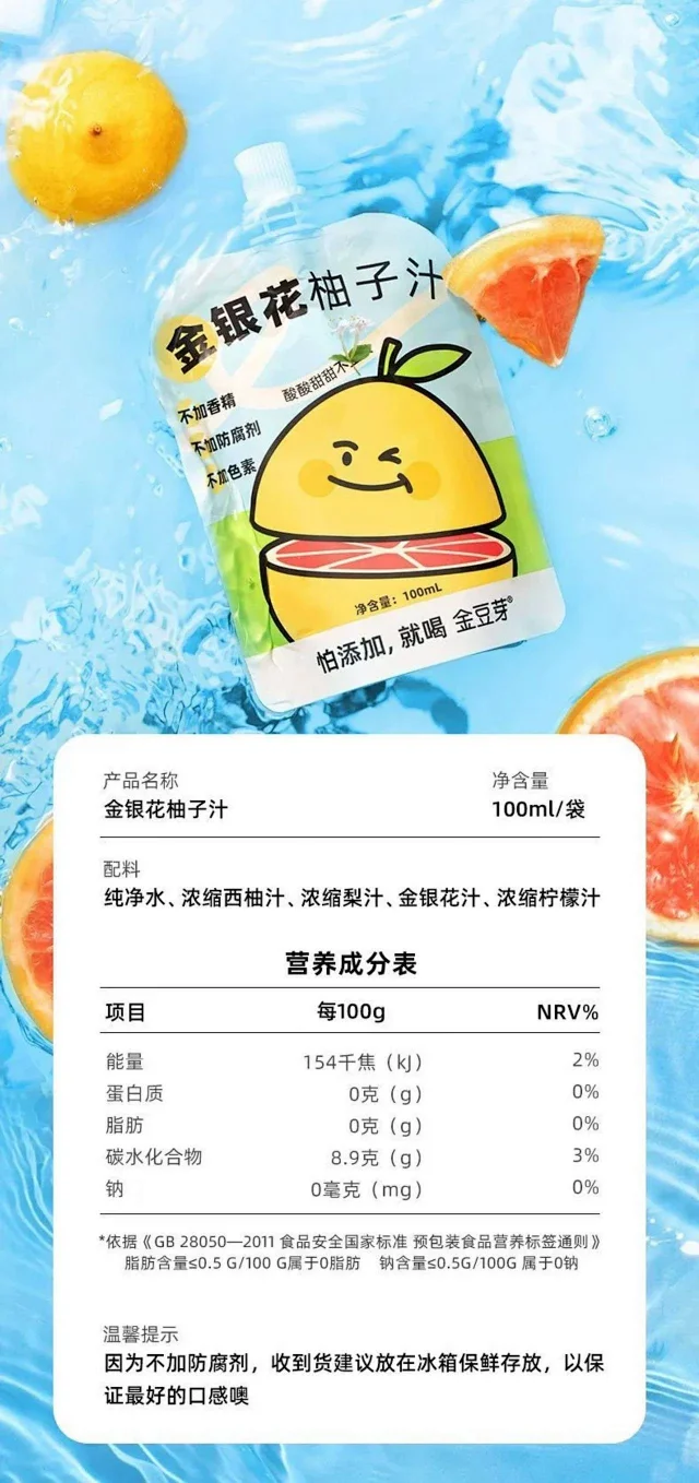 【产品名称】金银花柚子汁【产品规格】12袋/份(100ml/袋)