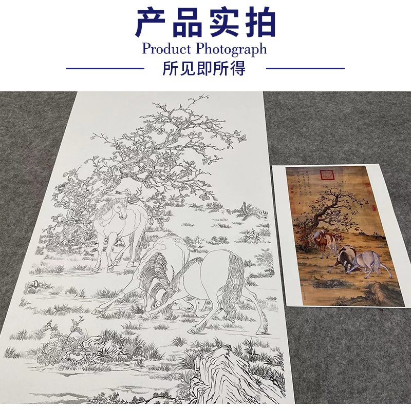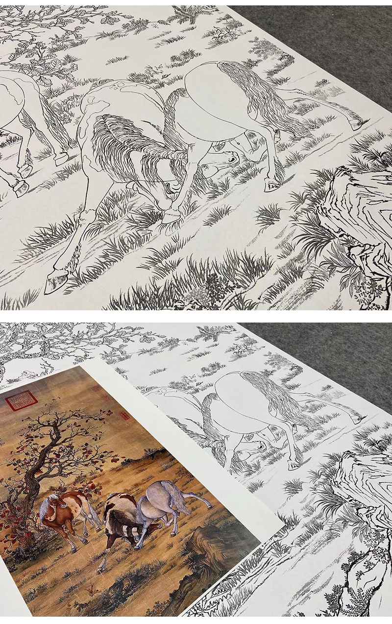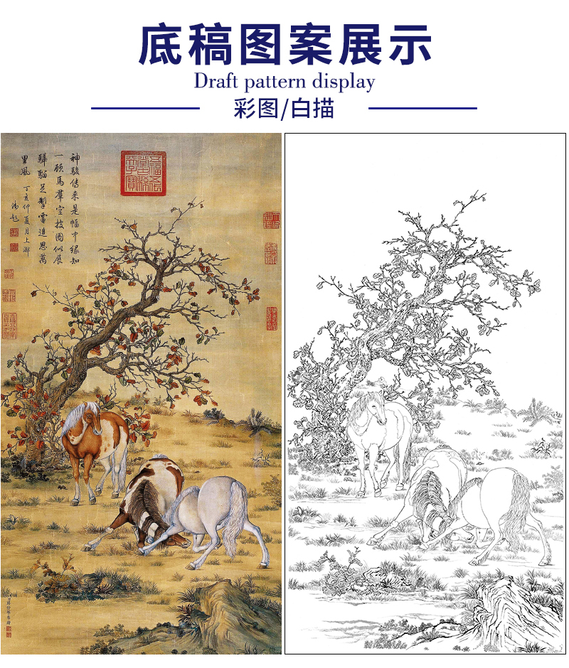 【大彩图】郎世宁工笔画白描底稿《神骏图》骏马临摹勾线高清打印稿LS14