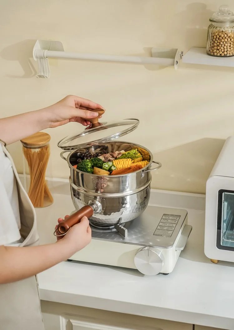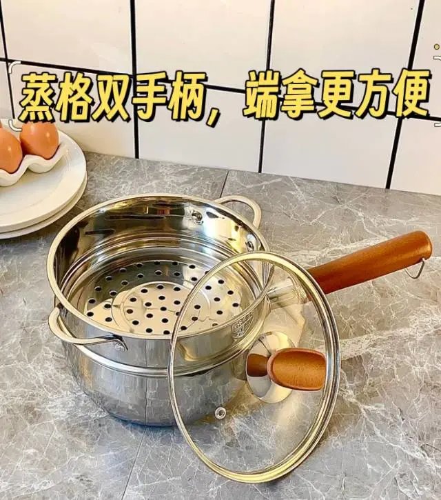 还有啊,这个锅还能搭配蒸格使用呢!上蒸下煮,简直太方便了。早上起来,下面煮个粥,上面蒸点包子、玉米啥的,一顿营养丰富的早餐就轻松搞定了。