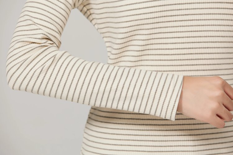 面料采用精梳40支有机彩棉,230g,4*2组合罗纹柔软细腻,弹性超大,毫无束缚感,不论是秋冬打底、叠穿都可以轻松掌握。袖口的长度刚刚好到虎口,很好的照顾到秋冬季节手部保暖。