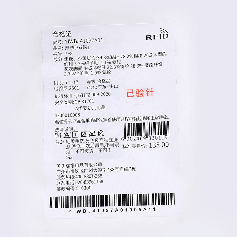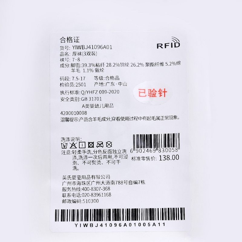 英氏婴儿加厚羊毛保暖袜子儿童3双装棉袜YIWBJ41096A01 YIWBJ41097A01