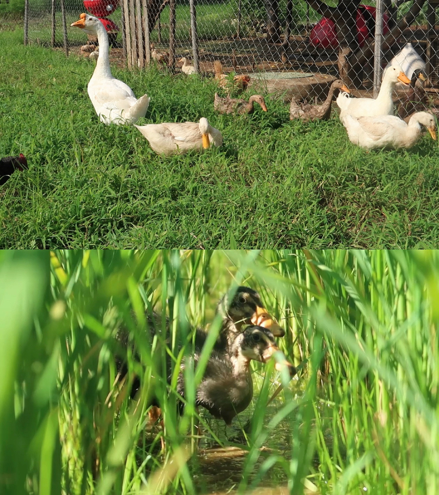 而我们的管家也开始慢慢把农场自产的玉米磨成粉,混合瓜秧菜叶喂食给鸭子们。水塘里的小杂鱼也会成为鸭子自己的食物。