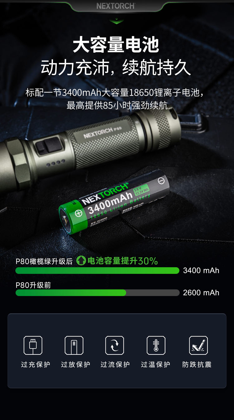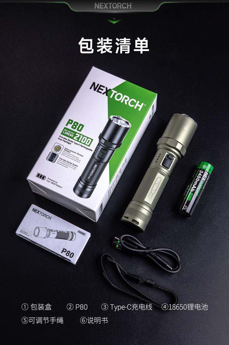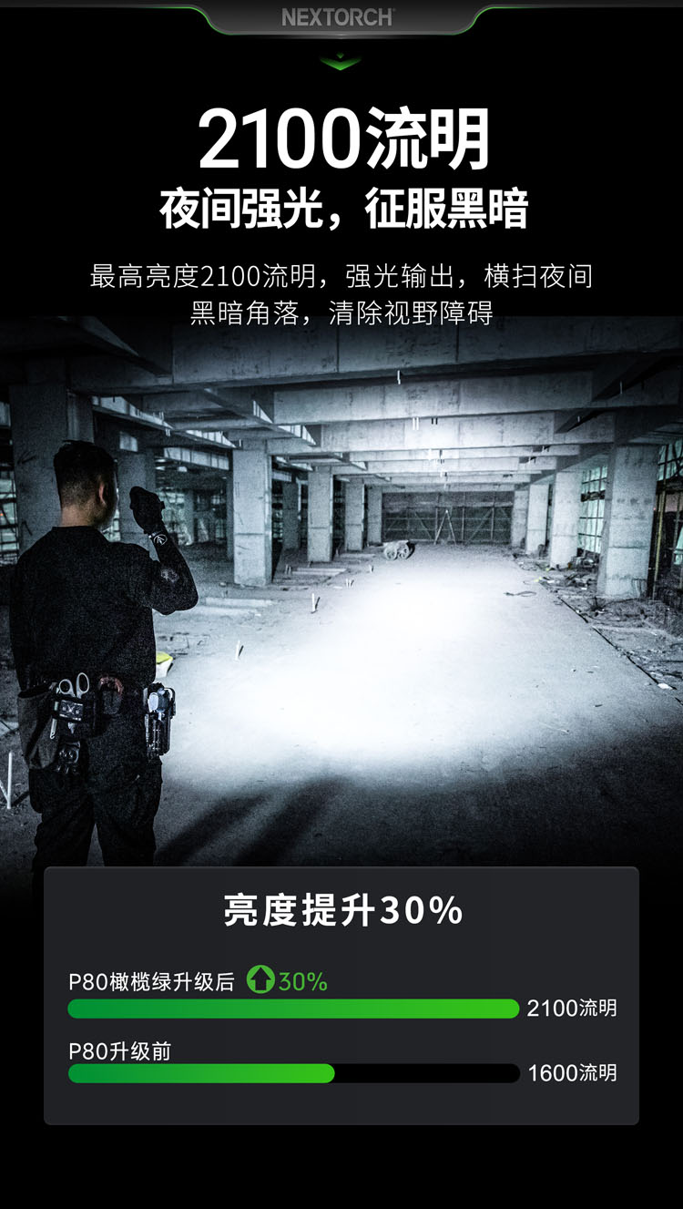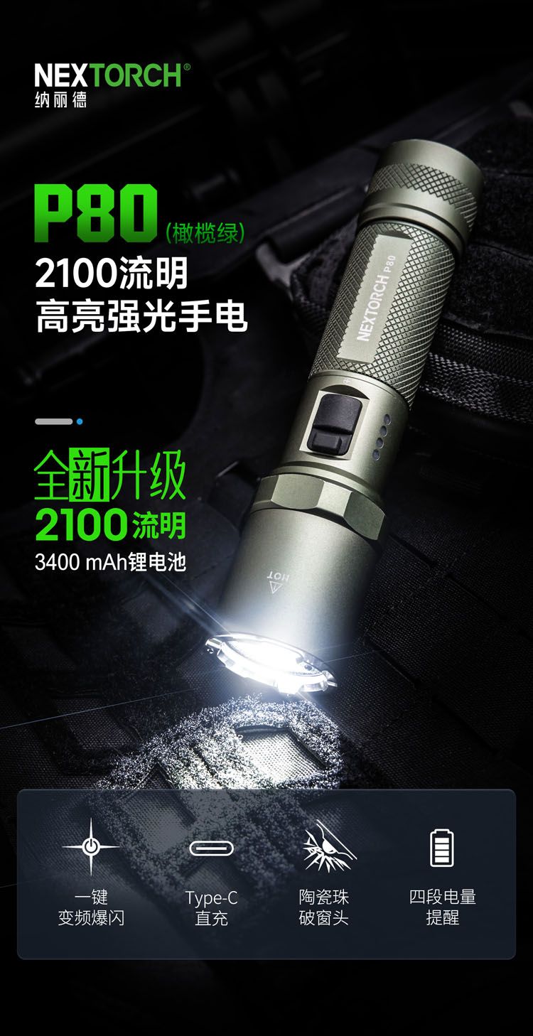 纳丽德(新品上市)P80橄榄绿迷彩色·2100流明3400mAh电池升级版户外强光勤务手电筒