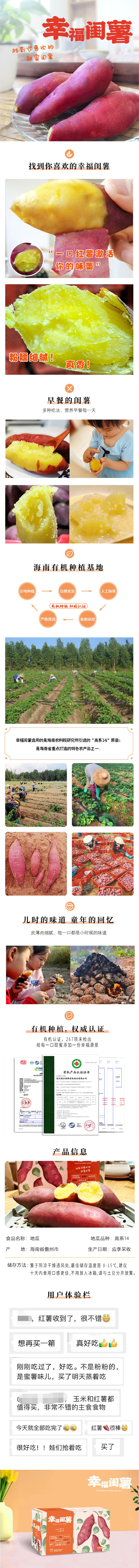 【产品介绍】:幸福闺薯选用的是海南农科院研究培育的“高系14”原苗;是海南省重点打造的特色农产品之一;口感粉糯香甜,肉质细腻无筋,非常适合粗粮代餐,宝宝辅食,健康送礼有机农特产品。