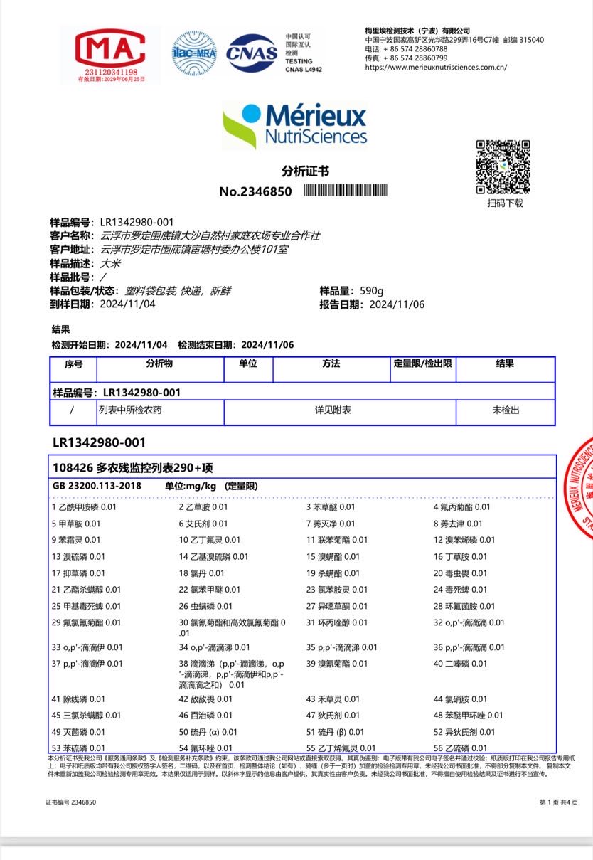 以下是2024晚稻原料290多项无农残检测报告: