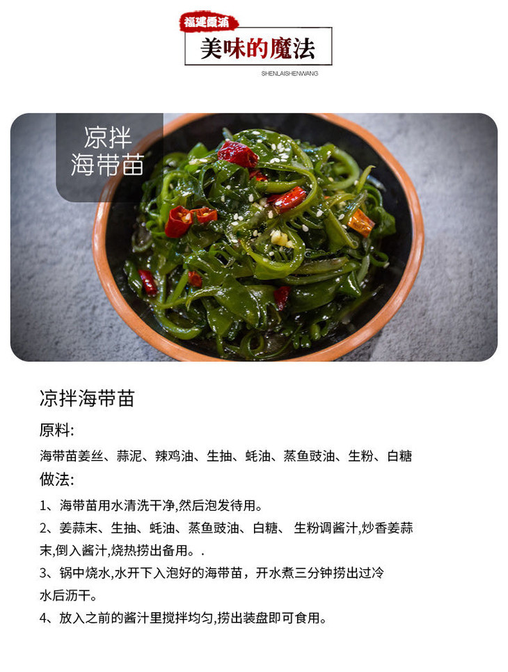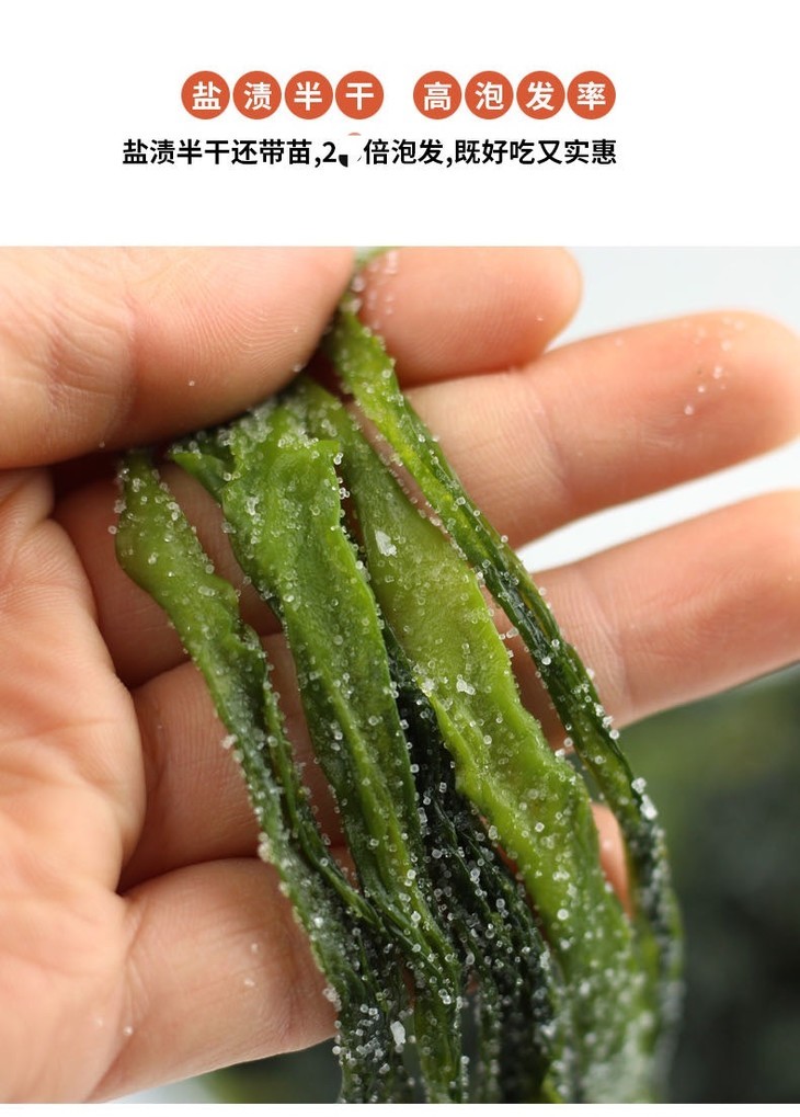 我们定制的这款海带苗,泡发率可以达到2倍,也就是1斤海带苗可以泡发出2斤成品,而市面上的海带苗很多只能泡发出半斤。