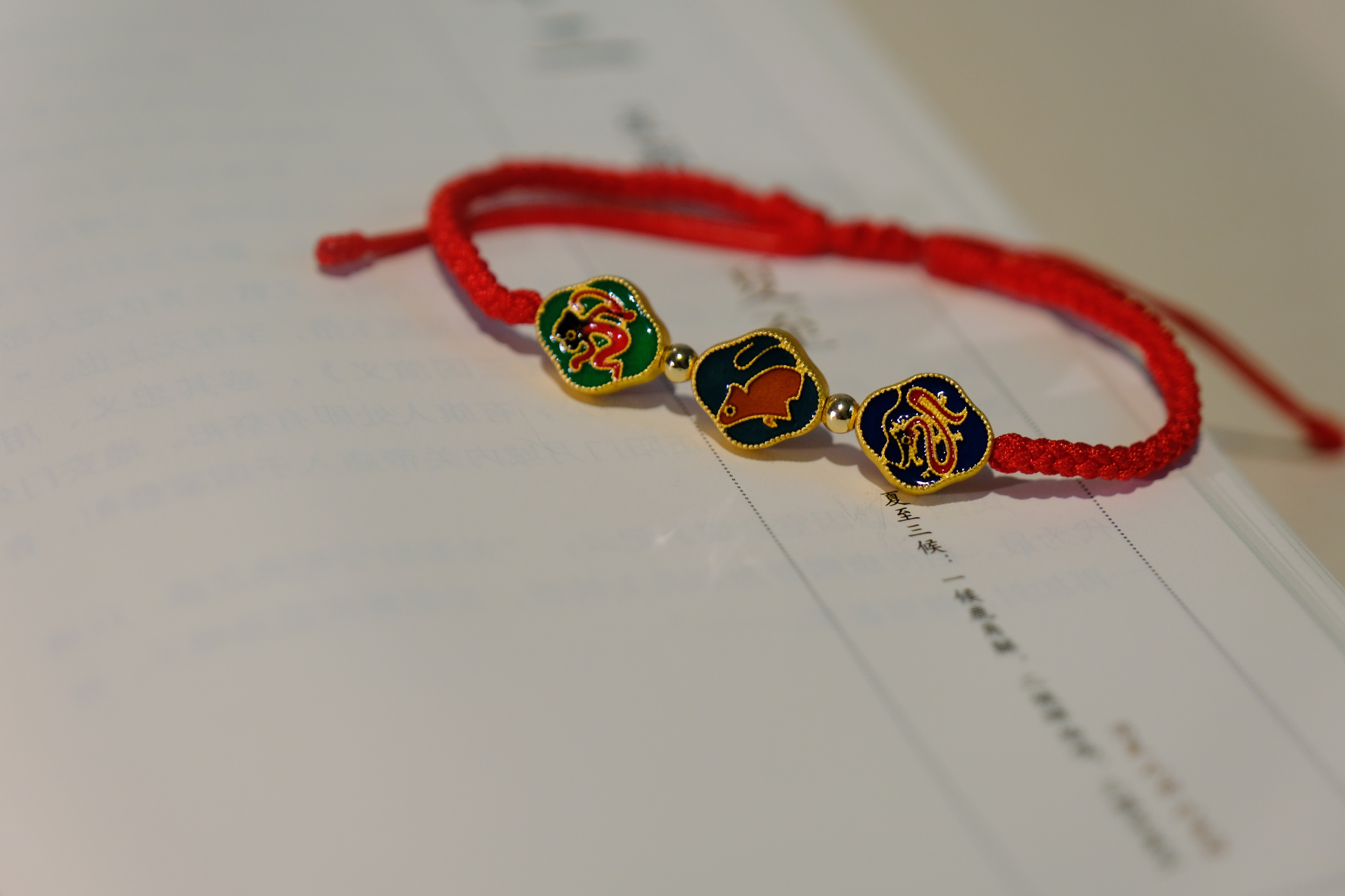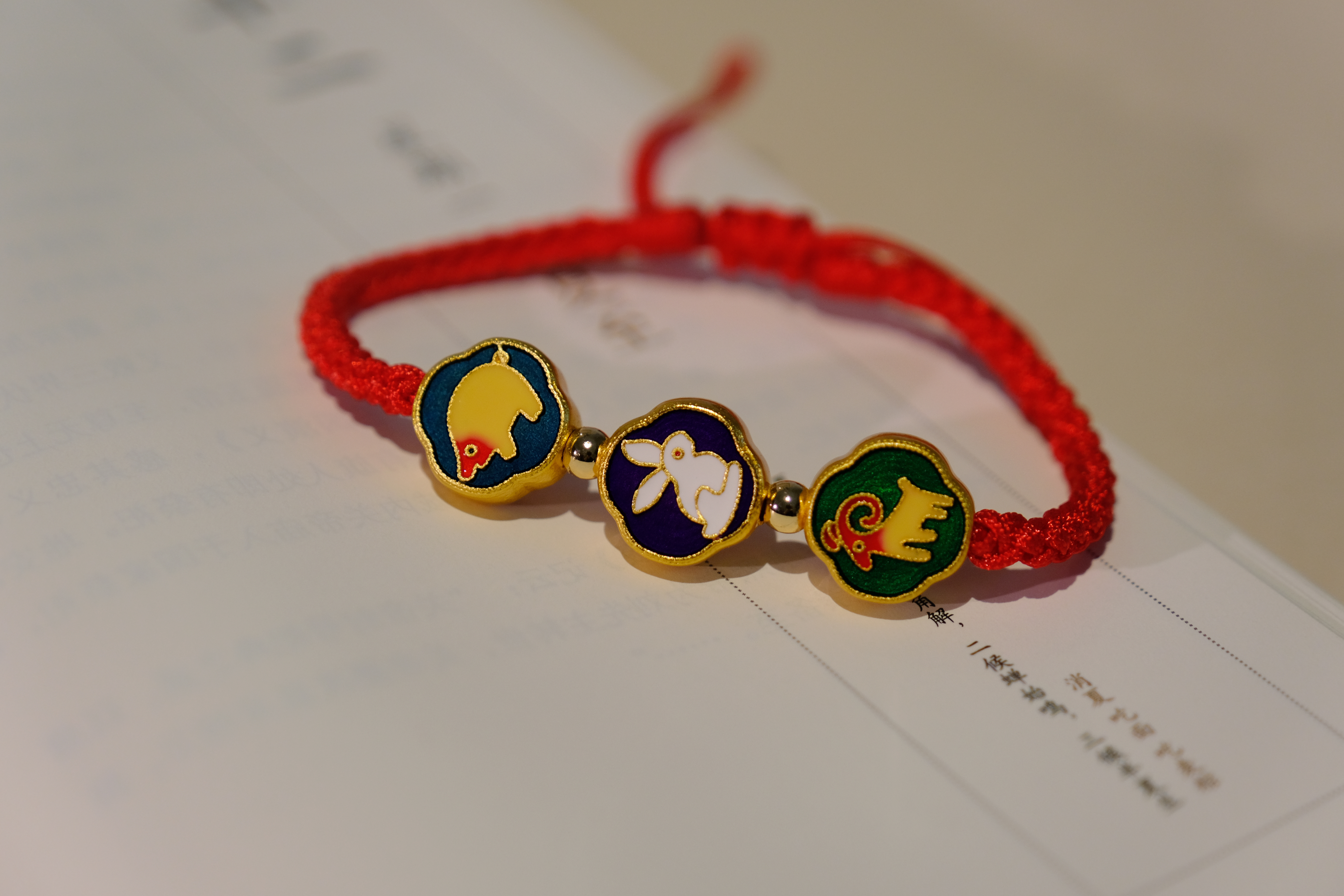 材质:铜镀18K金珐琅,进口红绳,进口14k包金配件