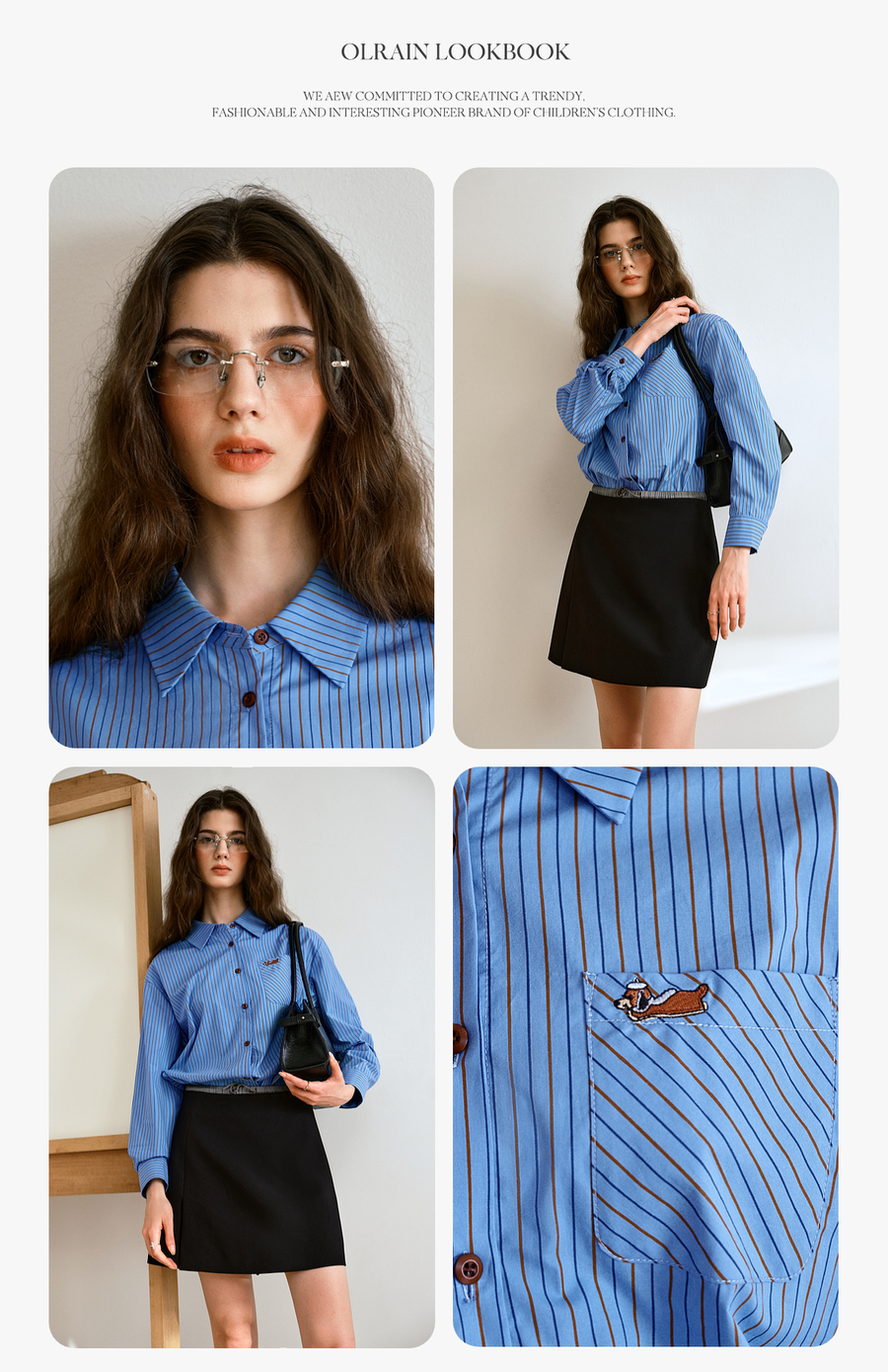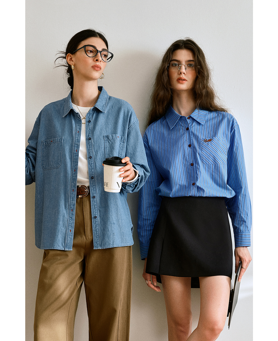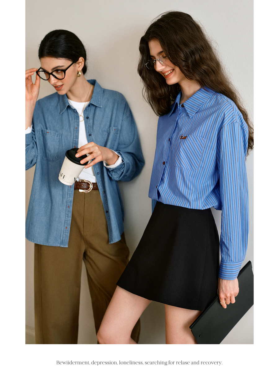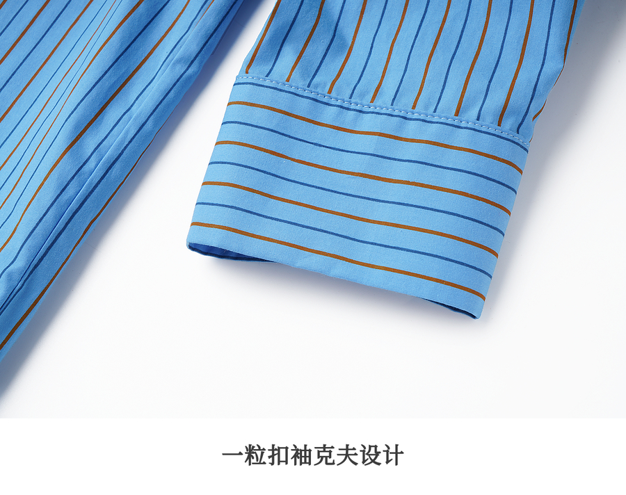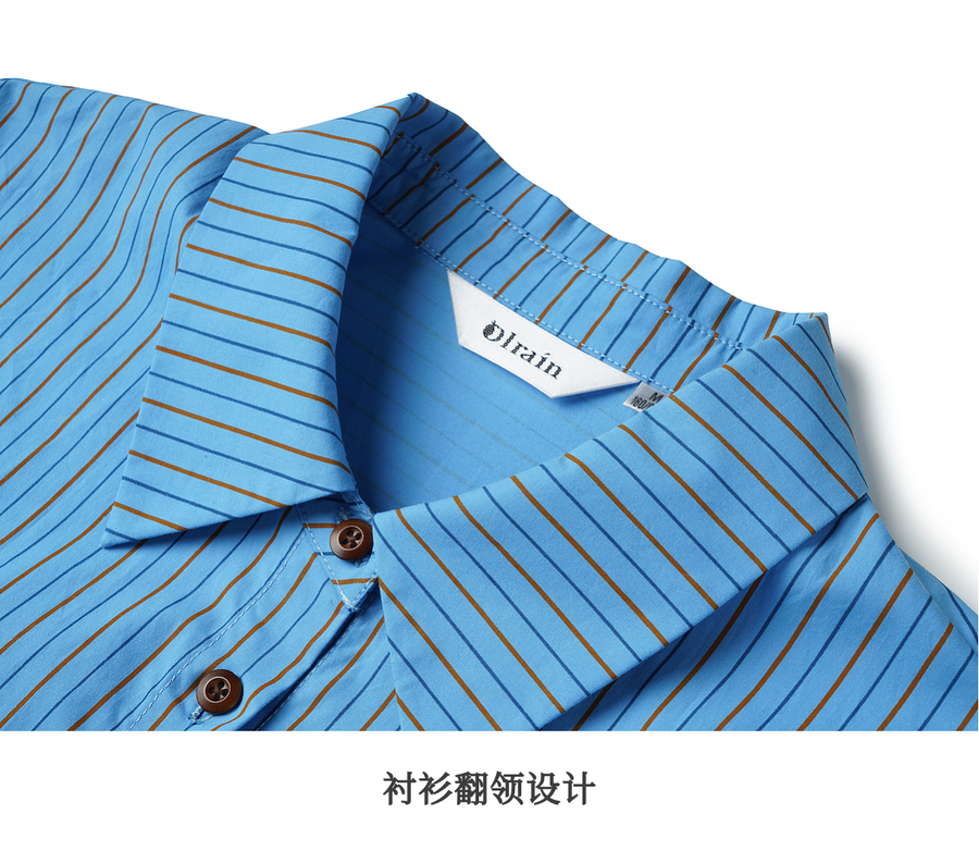 OLrain欧芮儿2025新款女秋季复古通勤蓝色条纹衬衣翻领长袖衬衫