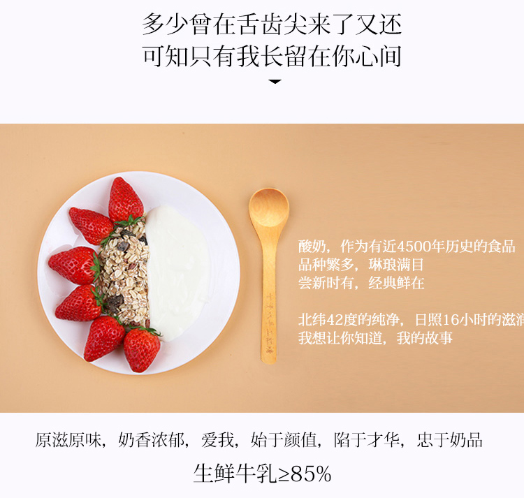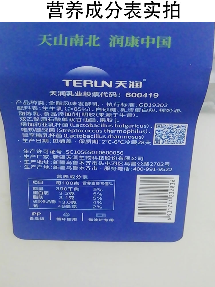 【配料表】生牛乳(≥85%)、白砂糖、乳清蛋白粉、稀奶油、甜炼乳、食品添加剂[明胶(来源于牛骨)、双乙酰酒石酸单双甘油酯、果胶]、保加利亚乳杆菌(Lactobacillus bulgaricus)、嗜热链球菌(Streptococcus thermophilus)、鼠李糖乳杆菌(Lactobacillus rhamnosus)