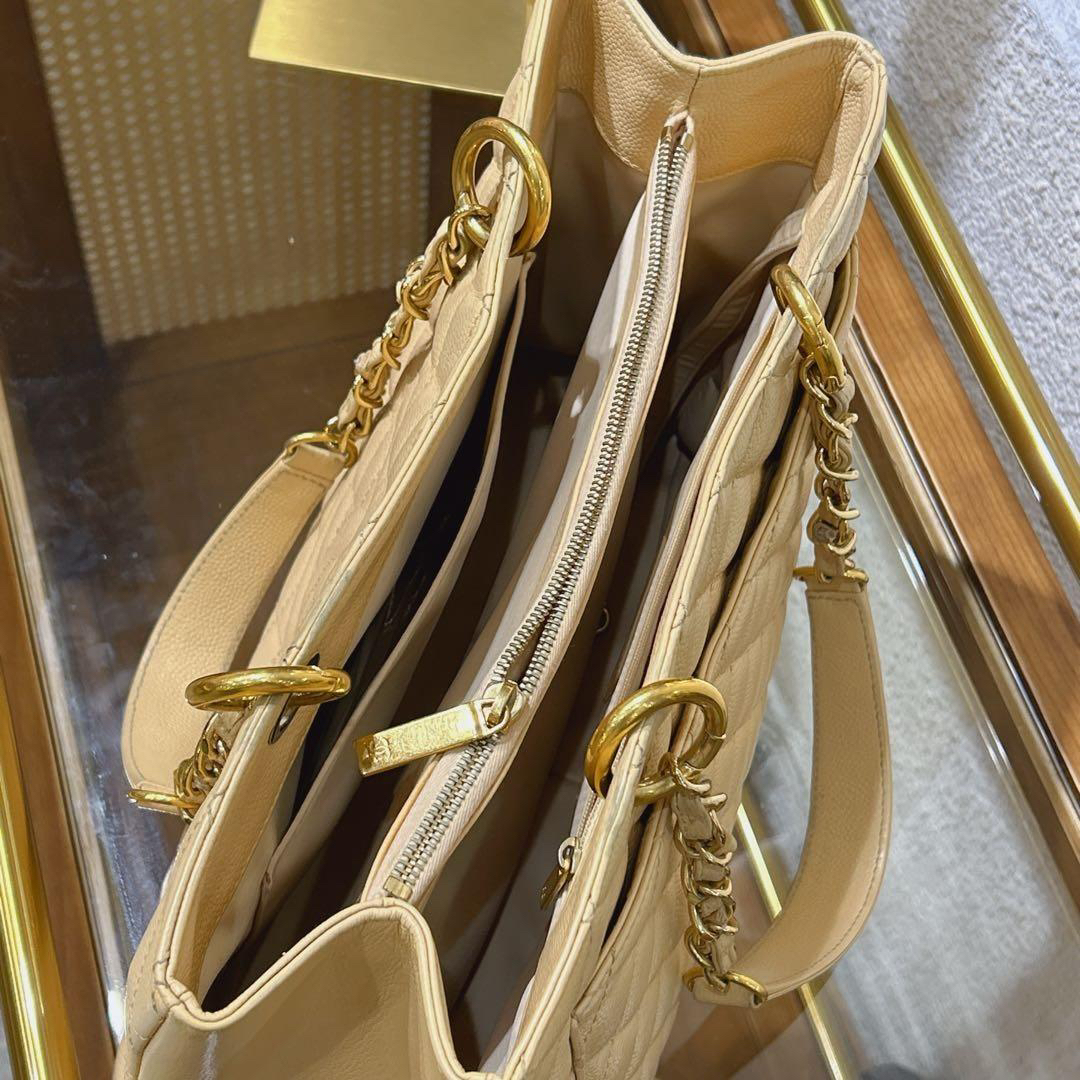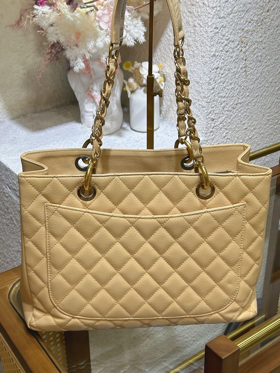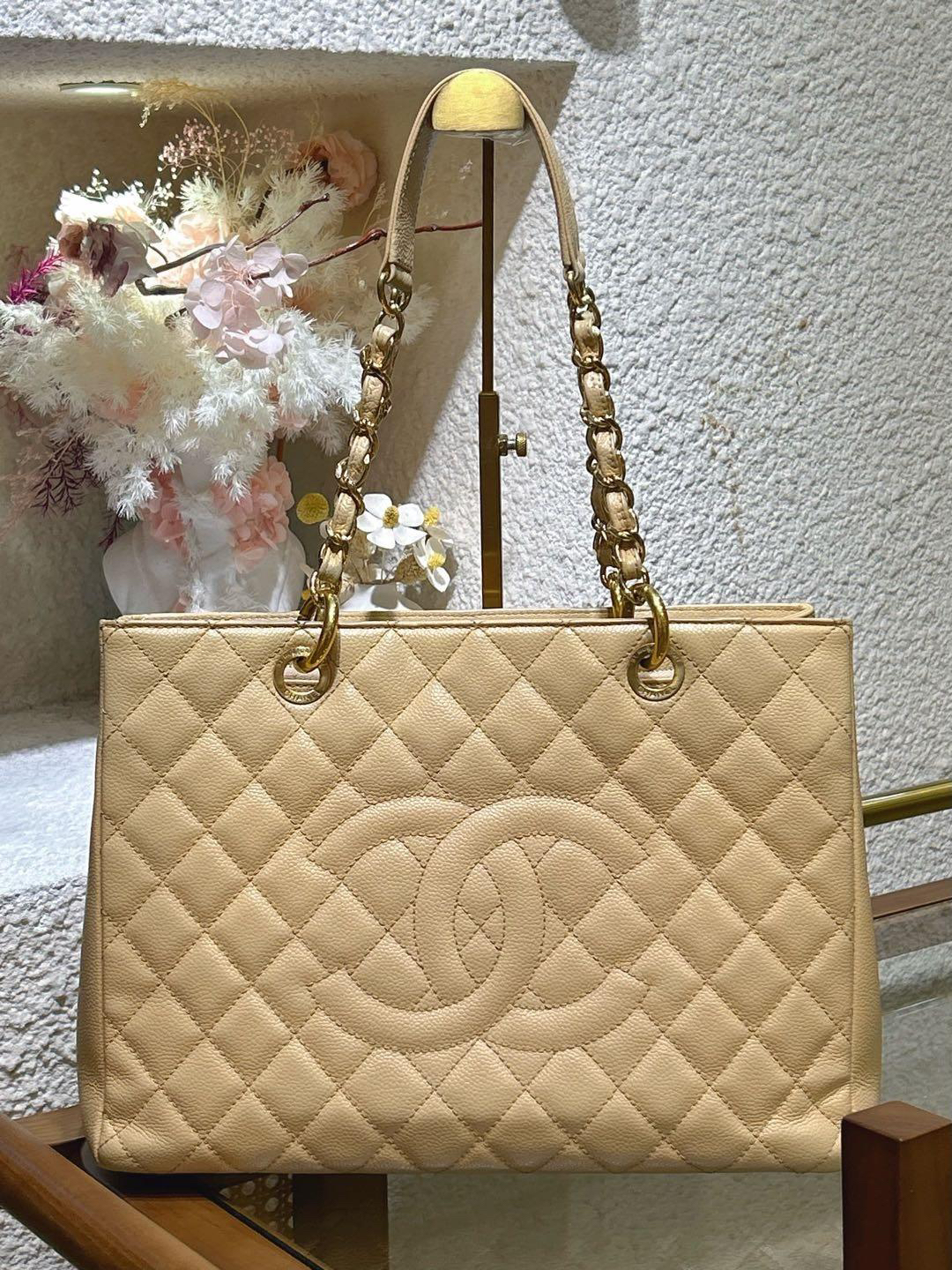 【商品詳情】正品二手 Chanel GST 荔枝纹牛皮 奶茶金 购物袋 🎊95新 34*24 镭射18开 配件:卡 说明书盒子。包口正常使用感。经典耐用能装!