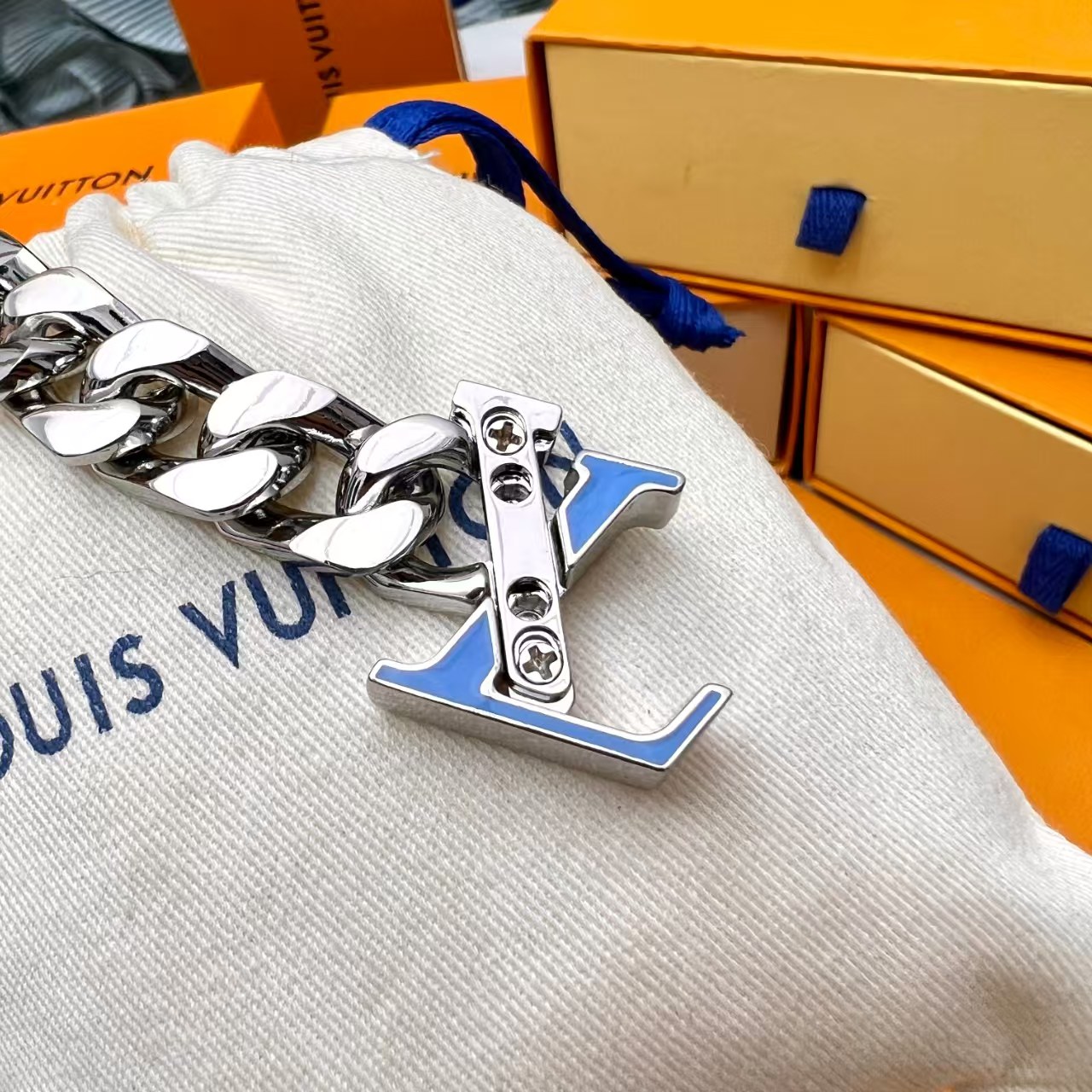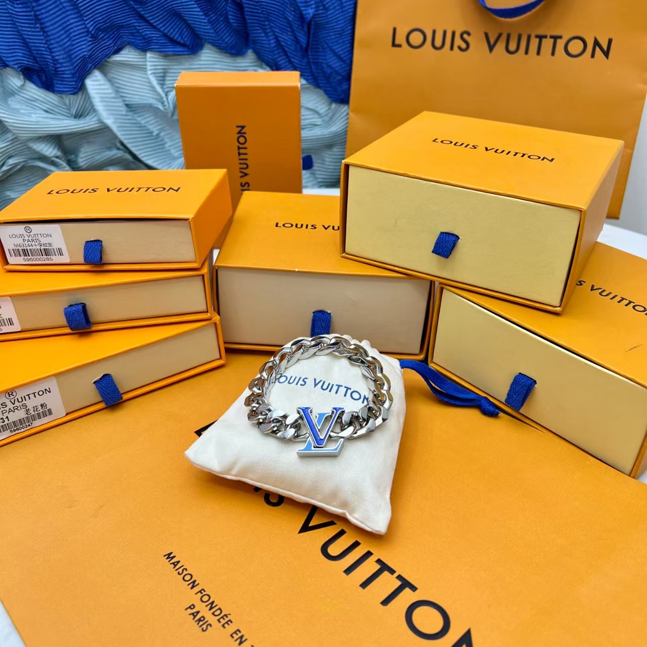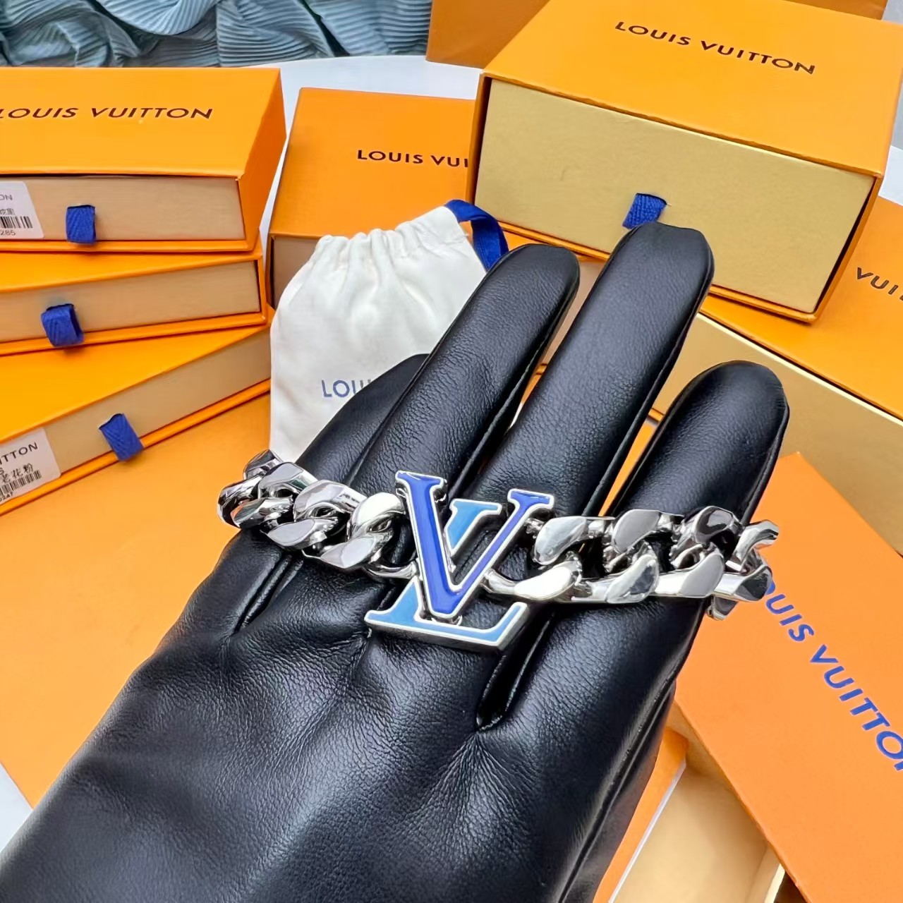 路易威登Logo字母时尚潮流手链男款银色,LV CHAIN 手链-编码:M0919M-官网在售价¥5,400RMB,本款 LV Chain 手链以鲜明珐琅创意塑造 LV 字母开合,占据视线焦点的同时可灵活调节长度,与抛光金属粗链环共同释放瞩目意趣。详细特征:金属-珐琅-LV 标识开合-可调节,意大利制造!