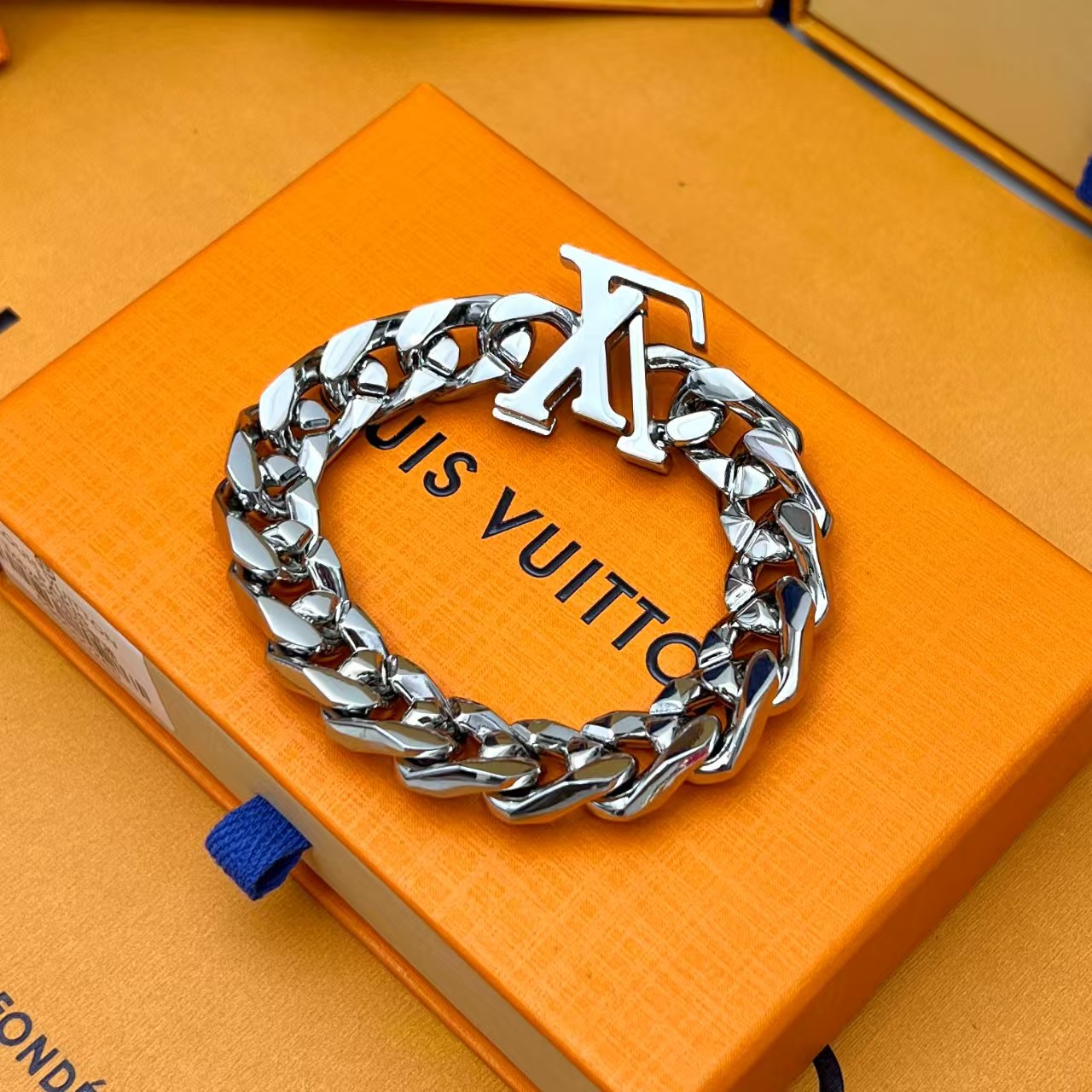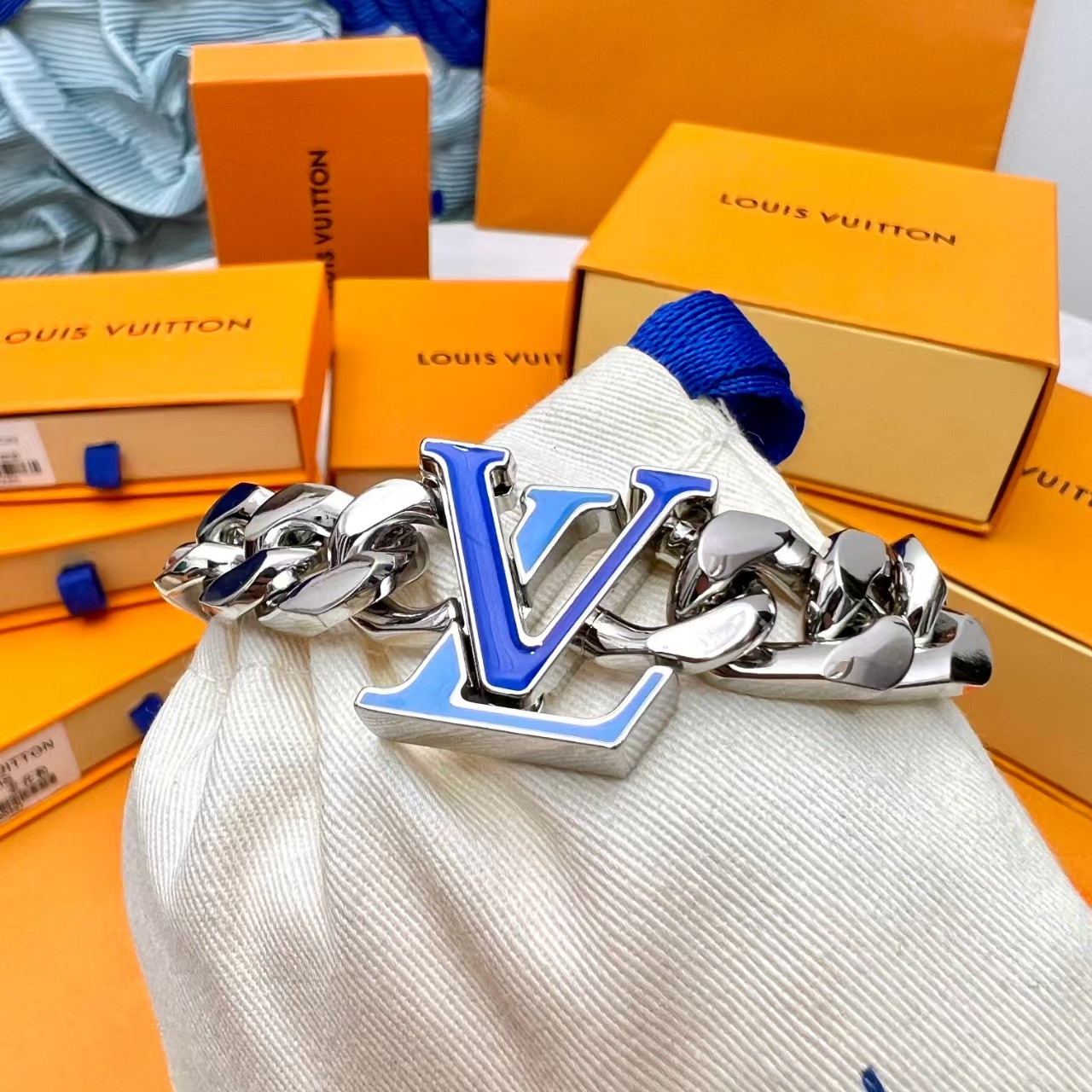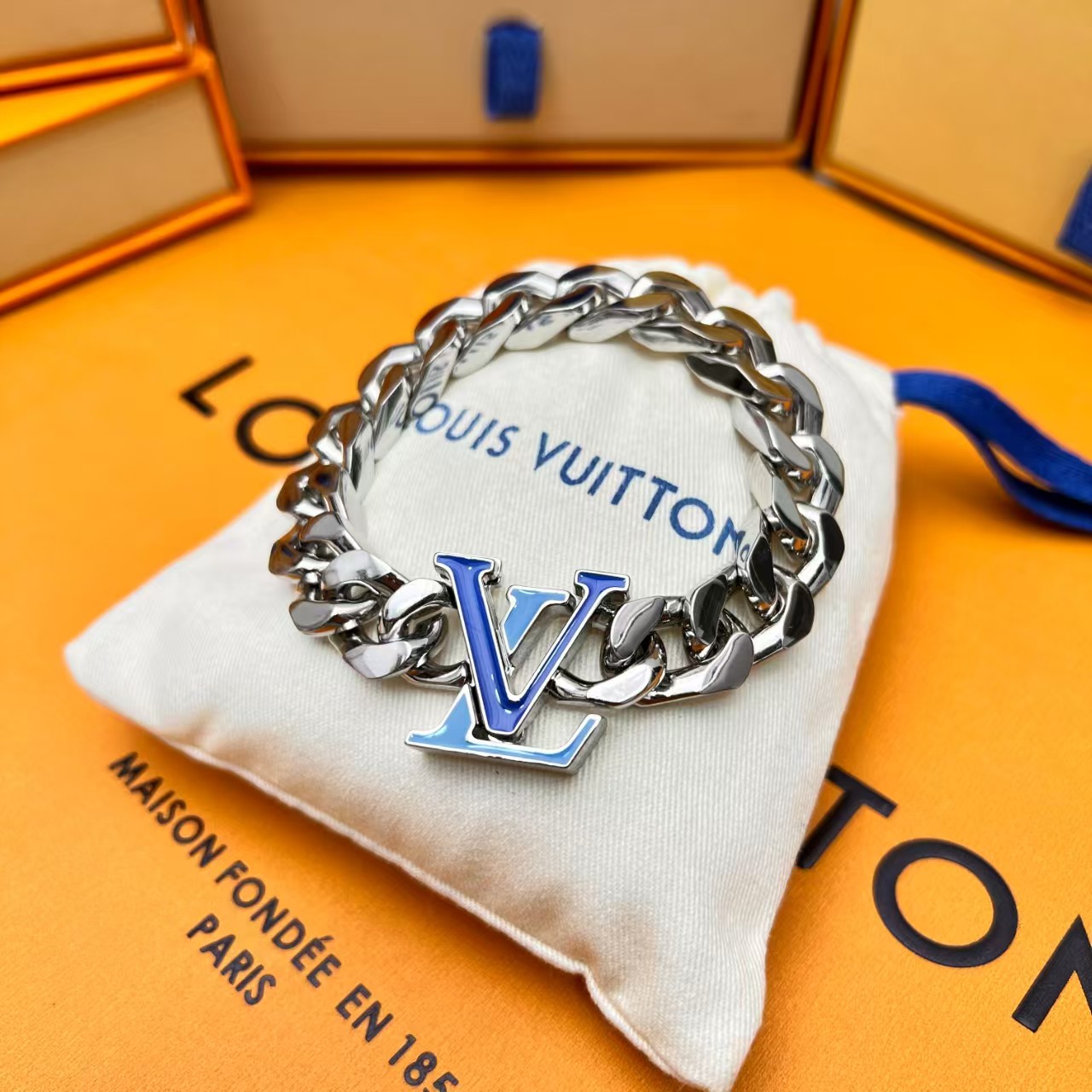 路易威登Logo字母时尚潮流手链男款银色,LV CHAIN 手链-编码:M0919M-官网在售价¥5,400RMB,本款 LV Chain 手链以鲜明珐琅创意塑造 LV 字母开合,占据视线焦点的同时可灵活调节长度,与抛光金属粗链环共同释放瞩目意趣。详细特征:金属-珐琅-LV 标识开合-可调节,意大利制造!