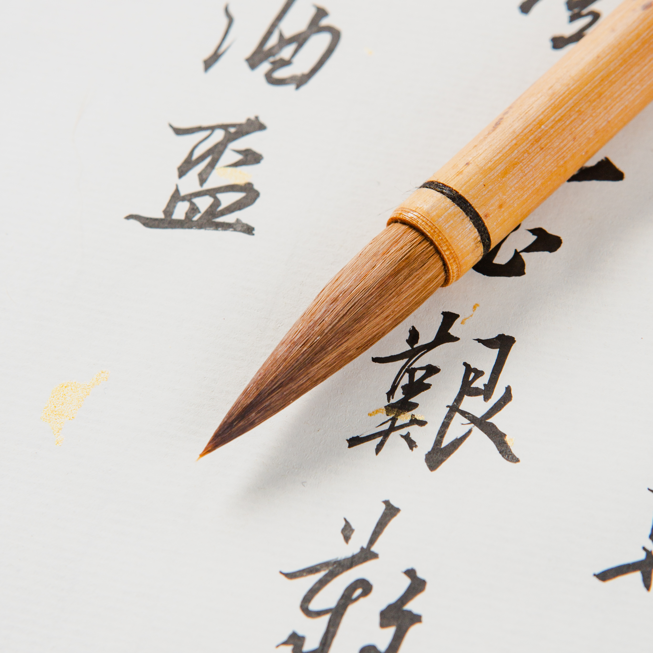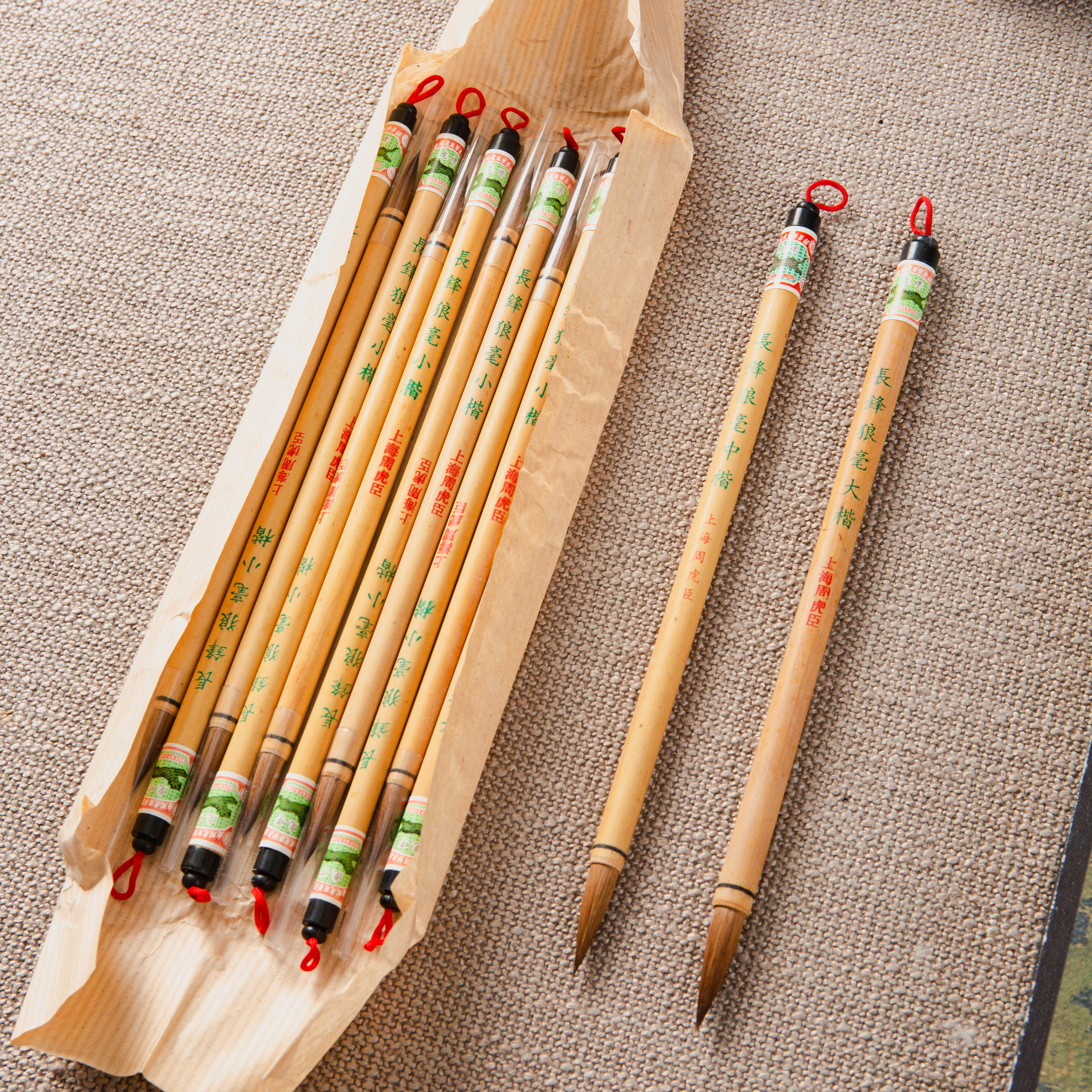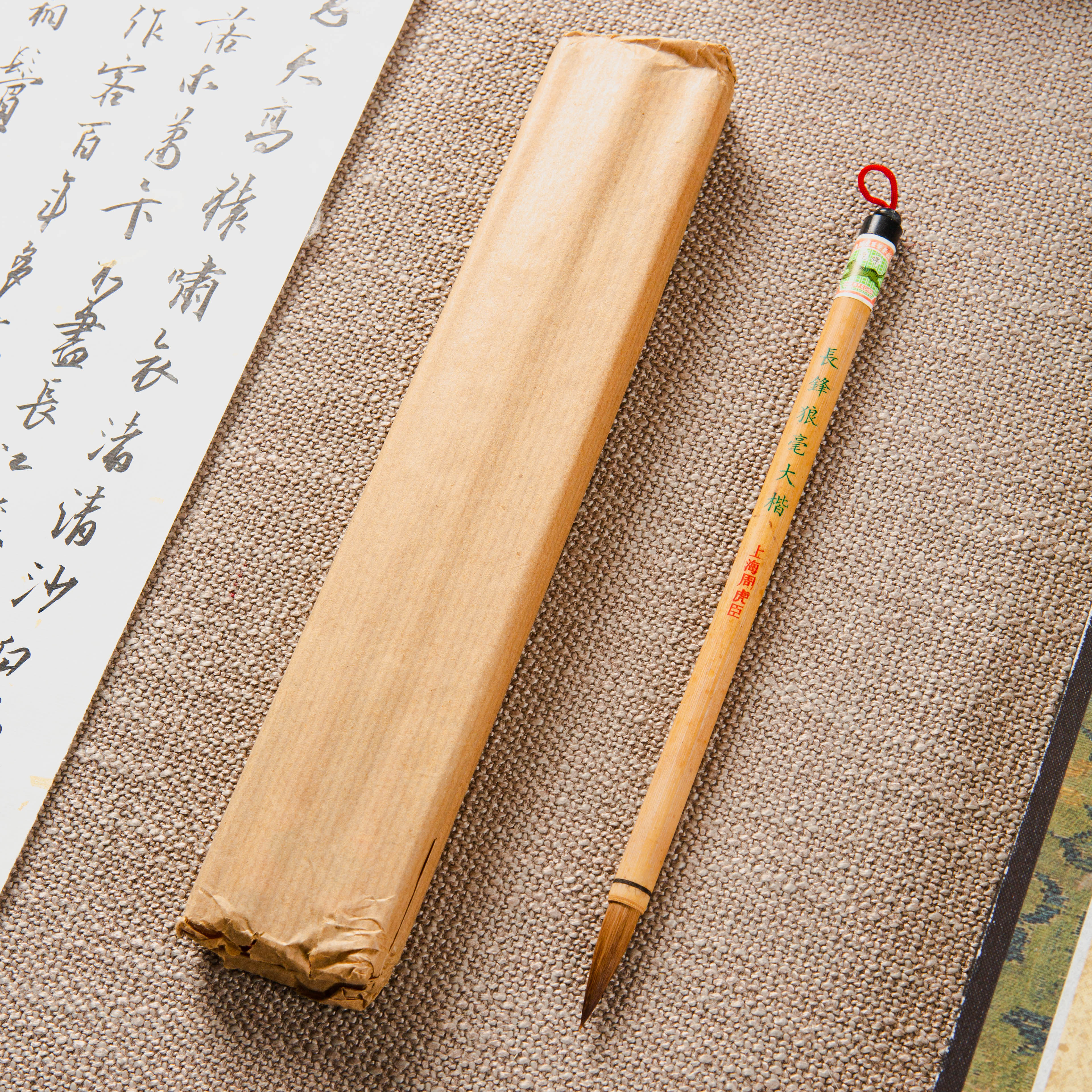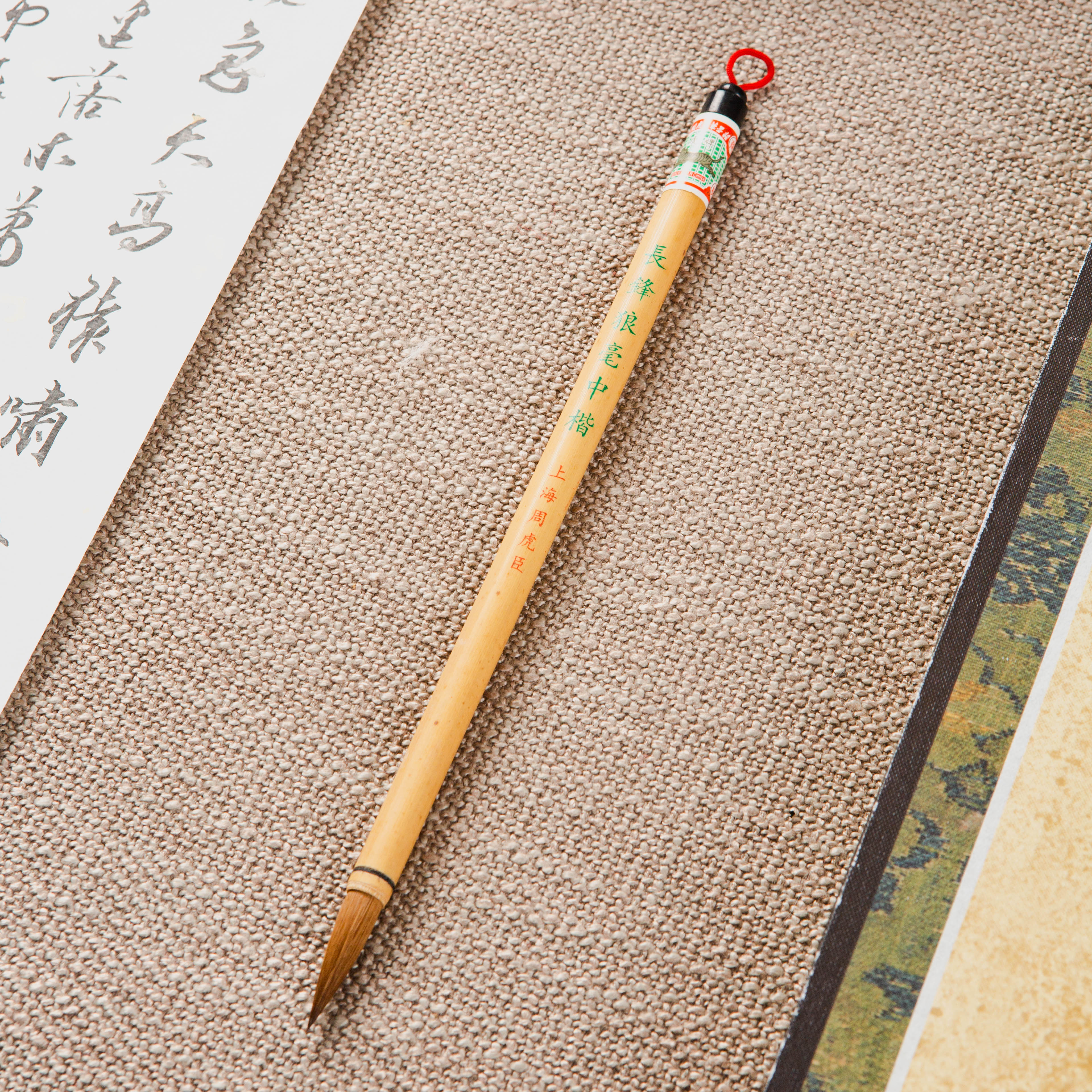 此笔为库存20年的上海老周虎臣制长锋狼毫毛笔,纯动物毛制作,不添加尼龙等人造材料,弹性好,续墨量足。