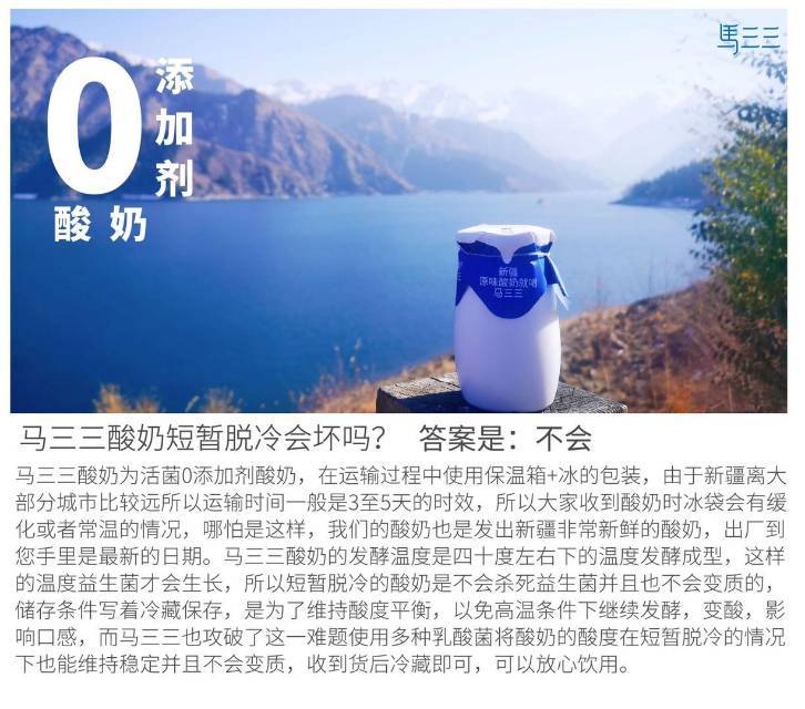 关于食品添加剂的问题,我们认为0添加是一种态度。马三三酸奶拒绝使用任何添加剂,我们对客户的健康怀有敬畏之心,我们对食材本身怀有敬畏之心,我们对大自然怀有敬畏之心。