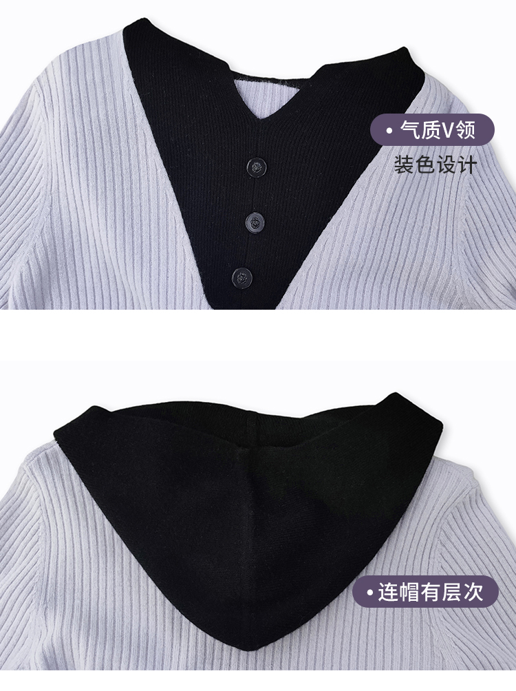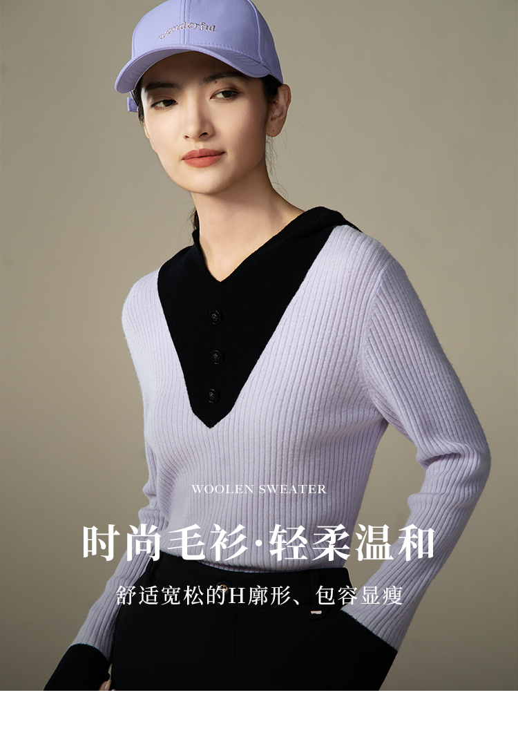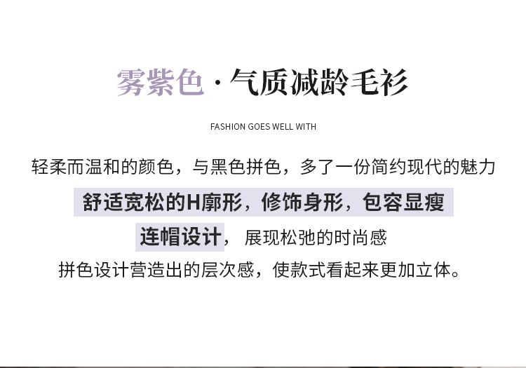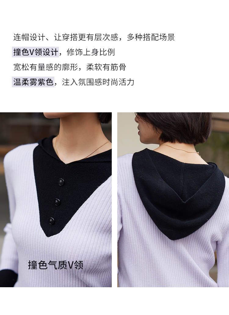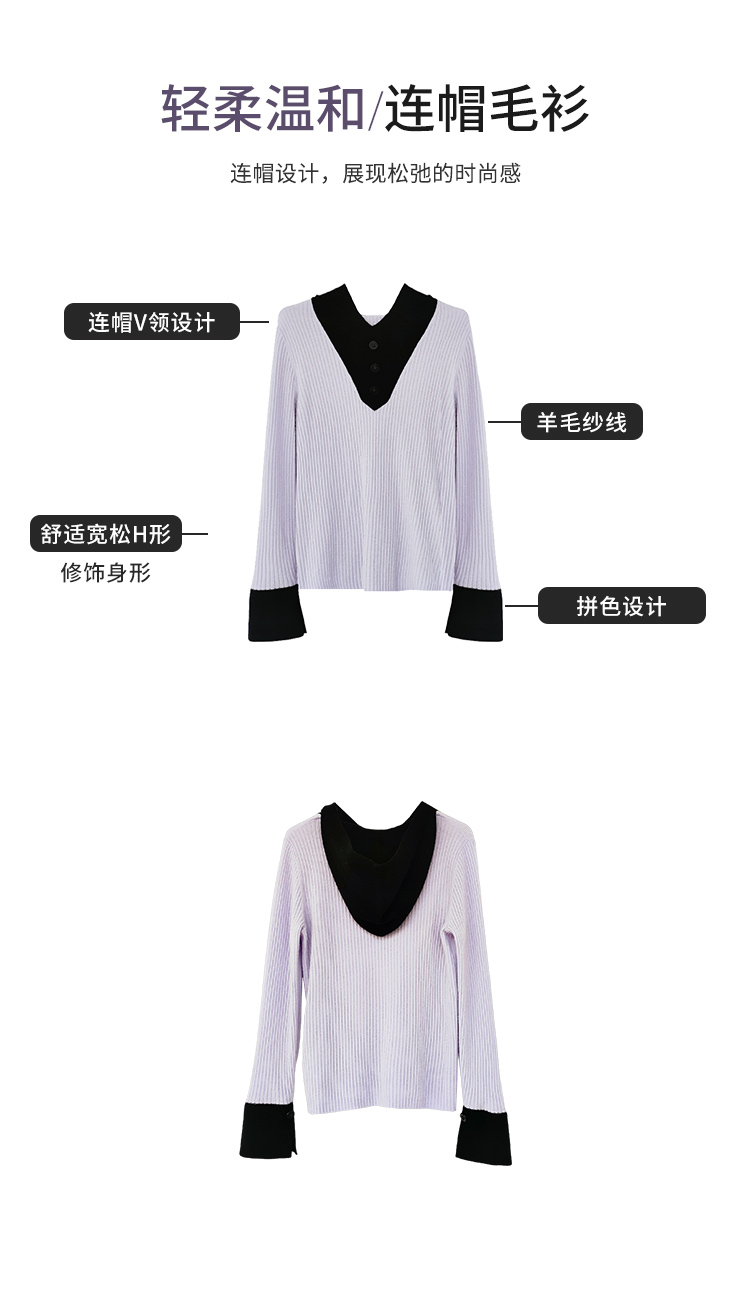 【商场同款】CNK4055雾紫色“气质减龄毛衫” 拼色设计营造层次感 H廓形包容显瘦 连帽V领松弛时尚 绵羊毛纱线舒适亲肤毛衣