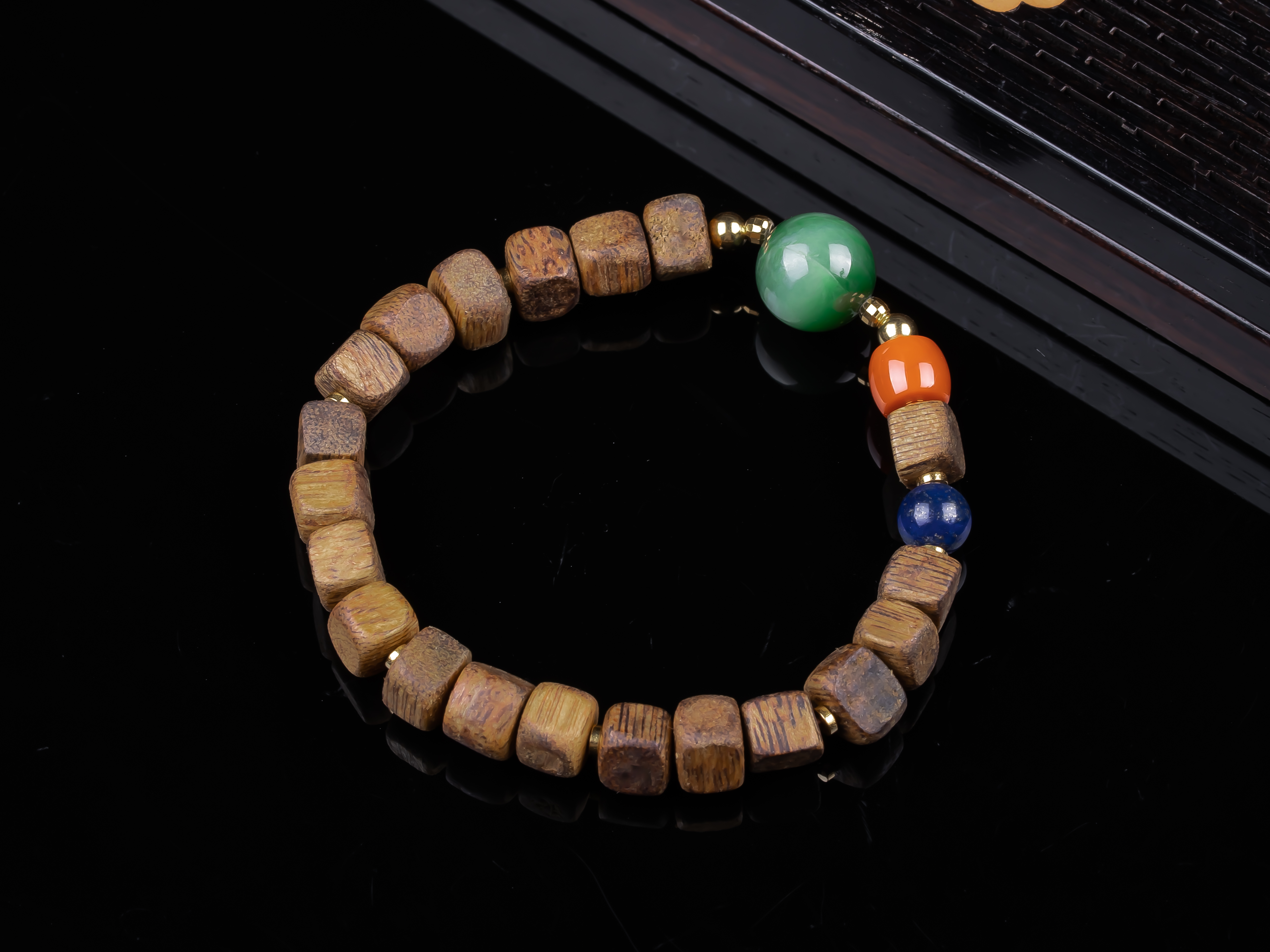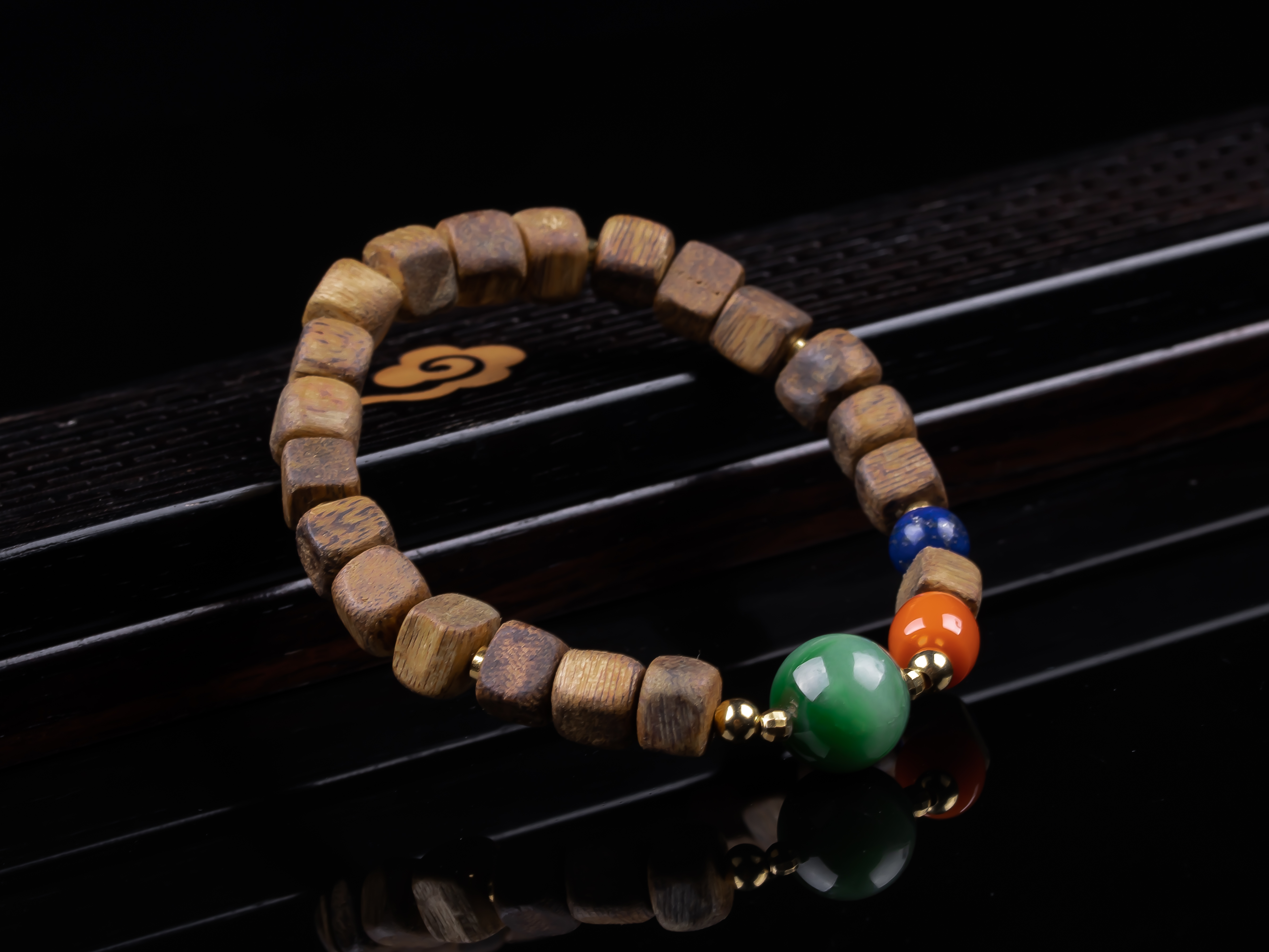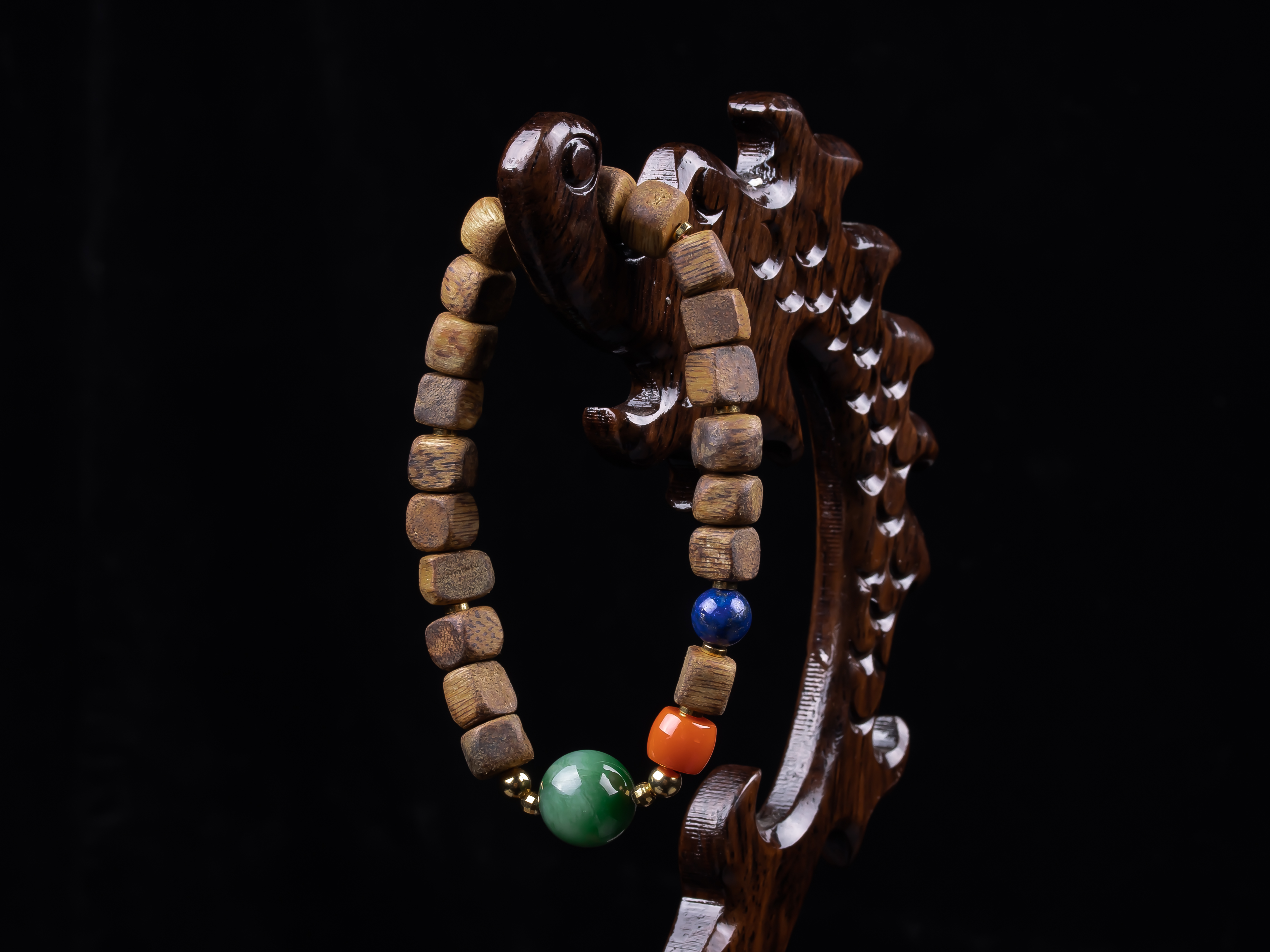 XY0350沉香+碧玉南红青金石方形珠手串.银,天然沉香约10.5mm,原色原味,香味自然清甜,一颗猫眼色彩的碧玉12mm,再加南红青金石搭配方形沉香珠子,更显古风韵味。