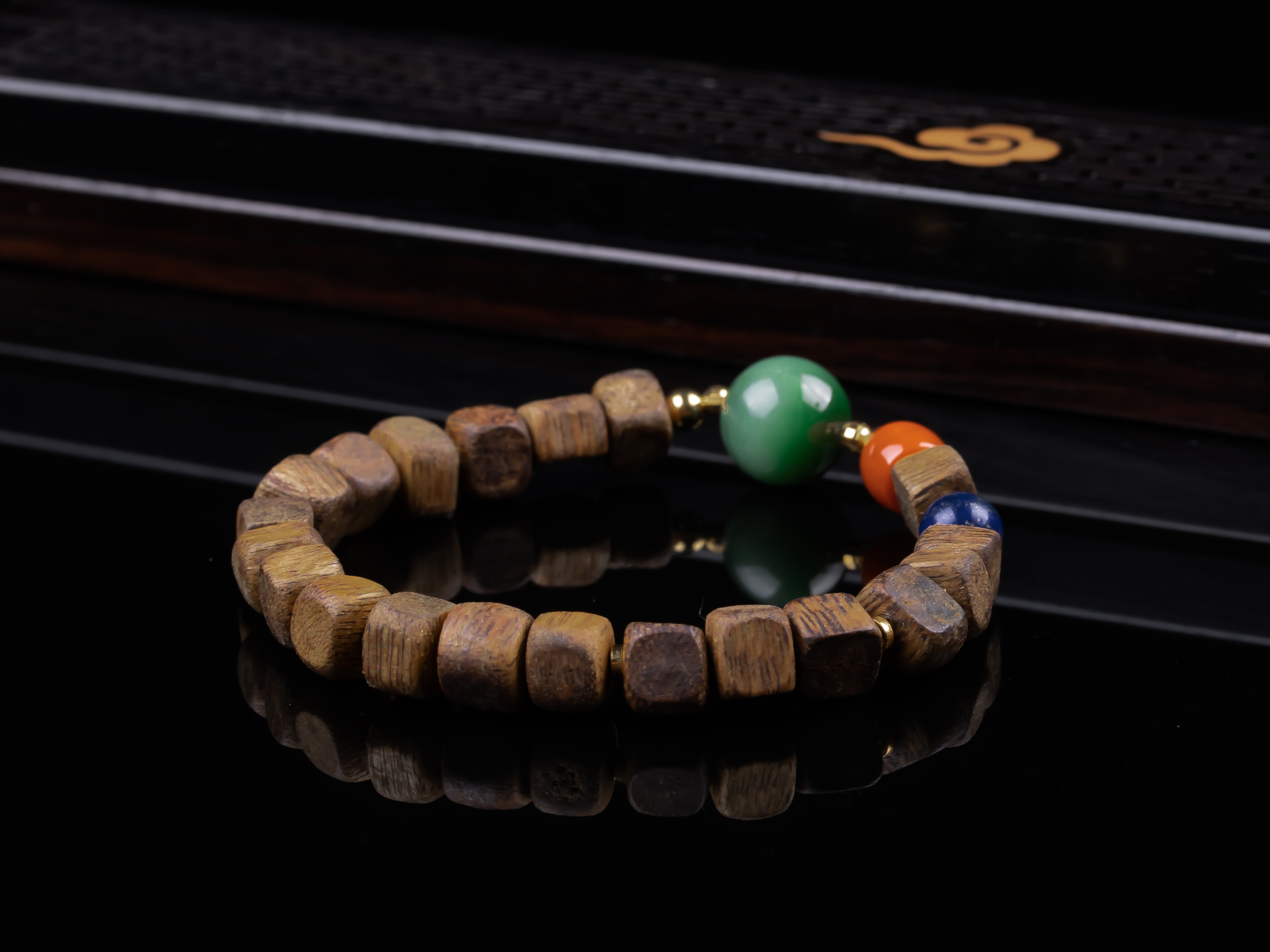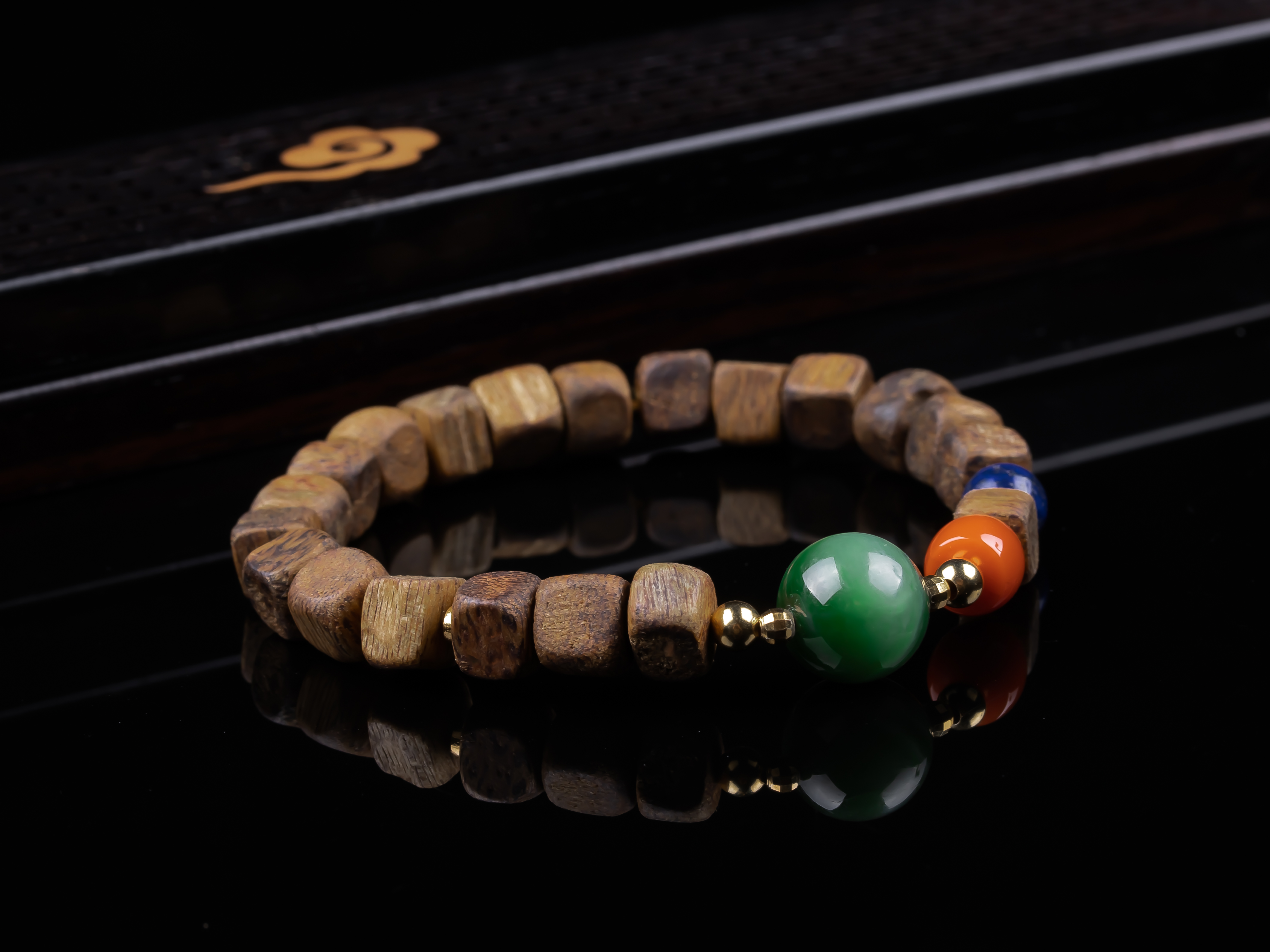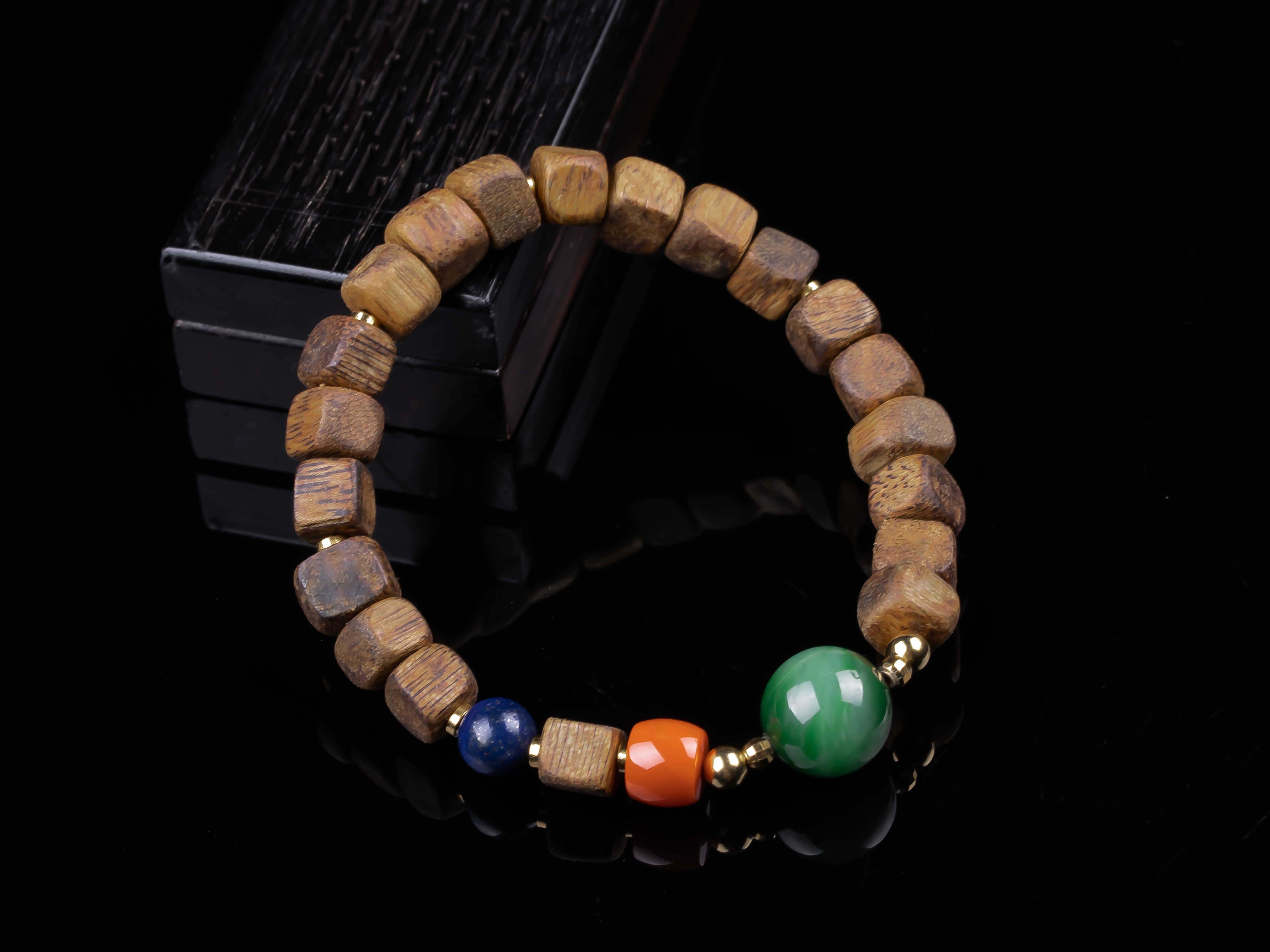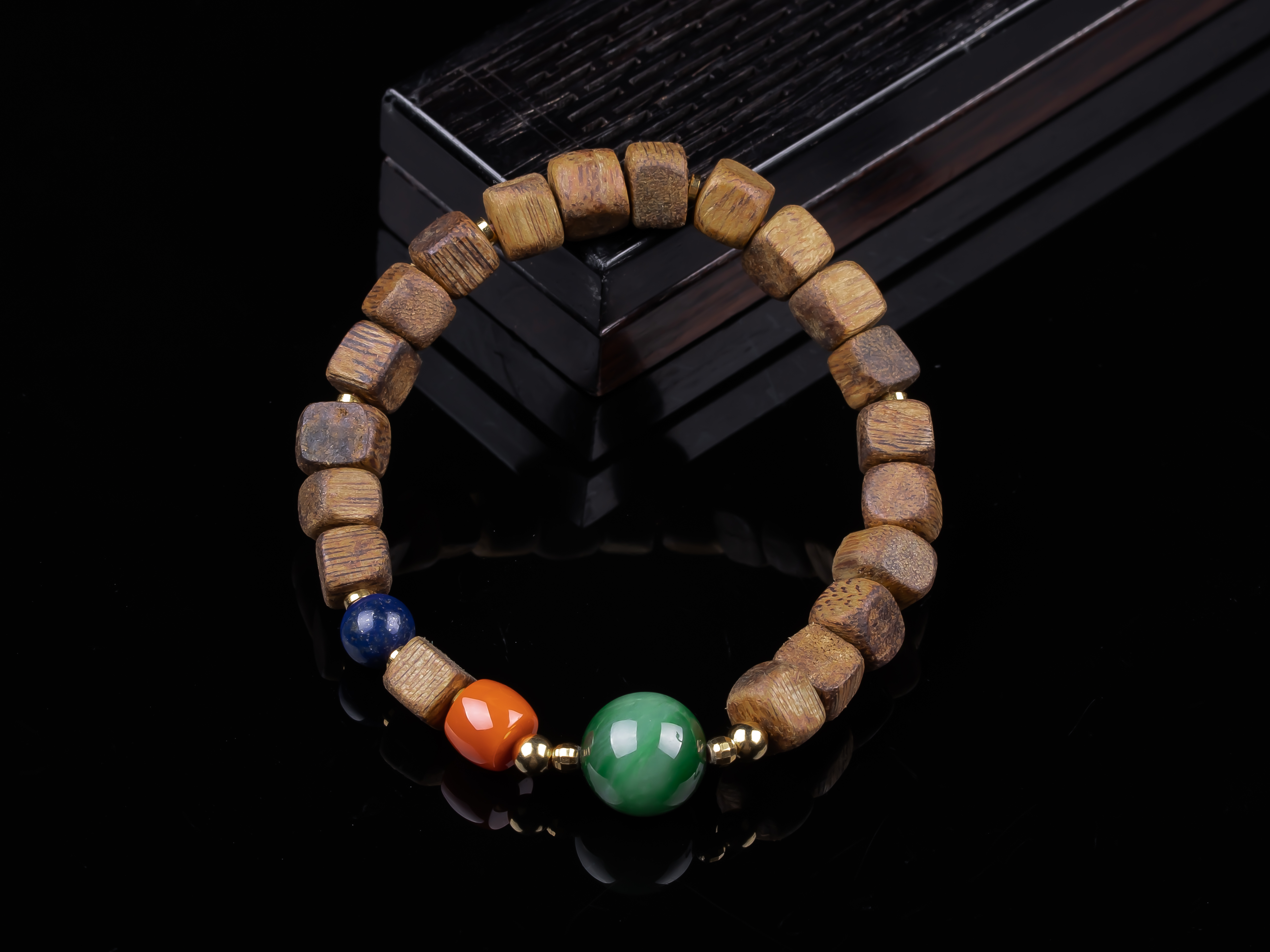 XY0350沉香+碧玉南红青金石方形珠手串.银,天然沉香约10.5mm,原色原味,香味自然清甜,一颗猫眼色彩的碧玉12mm,再加南红青金石搭配方形沉香珠子,更显古风韵味。