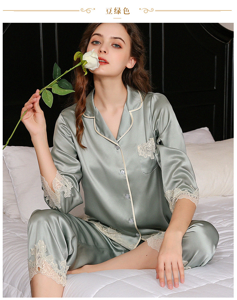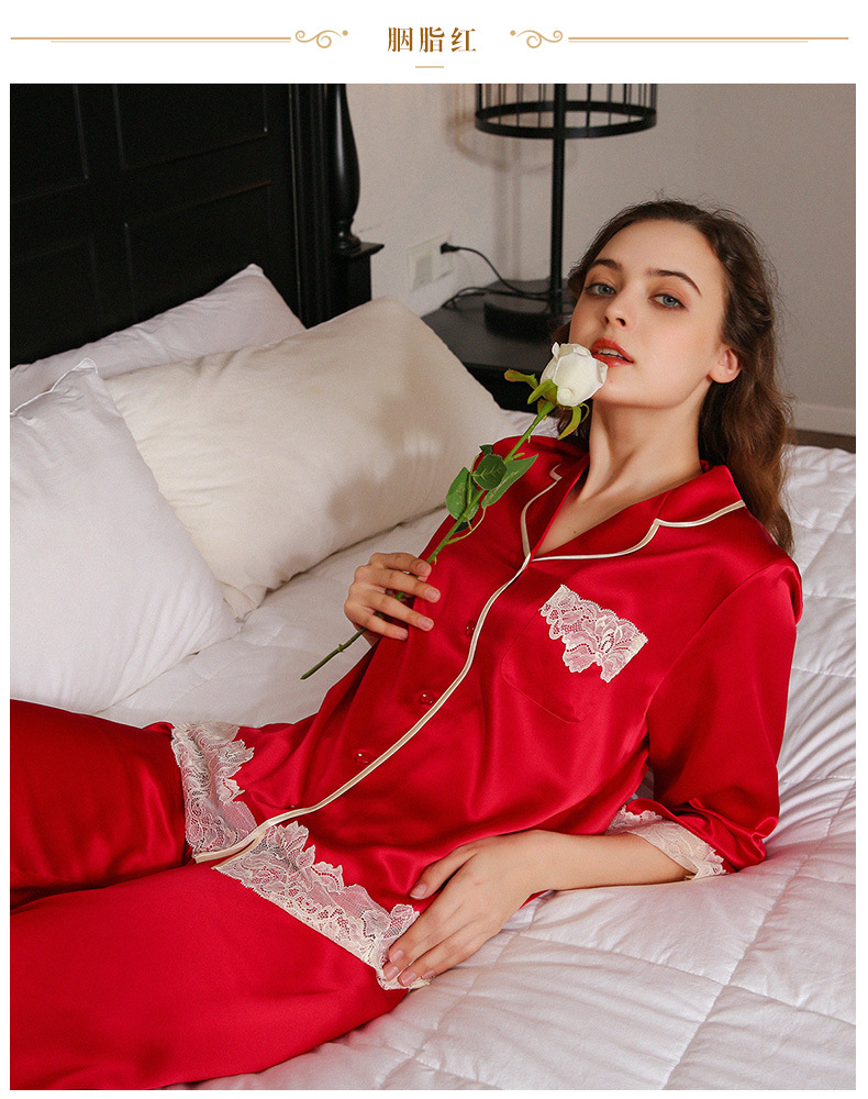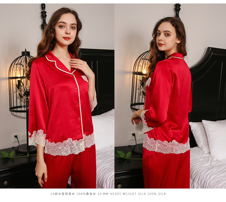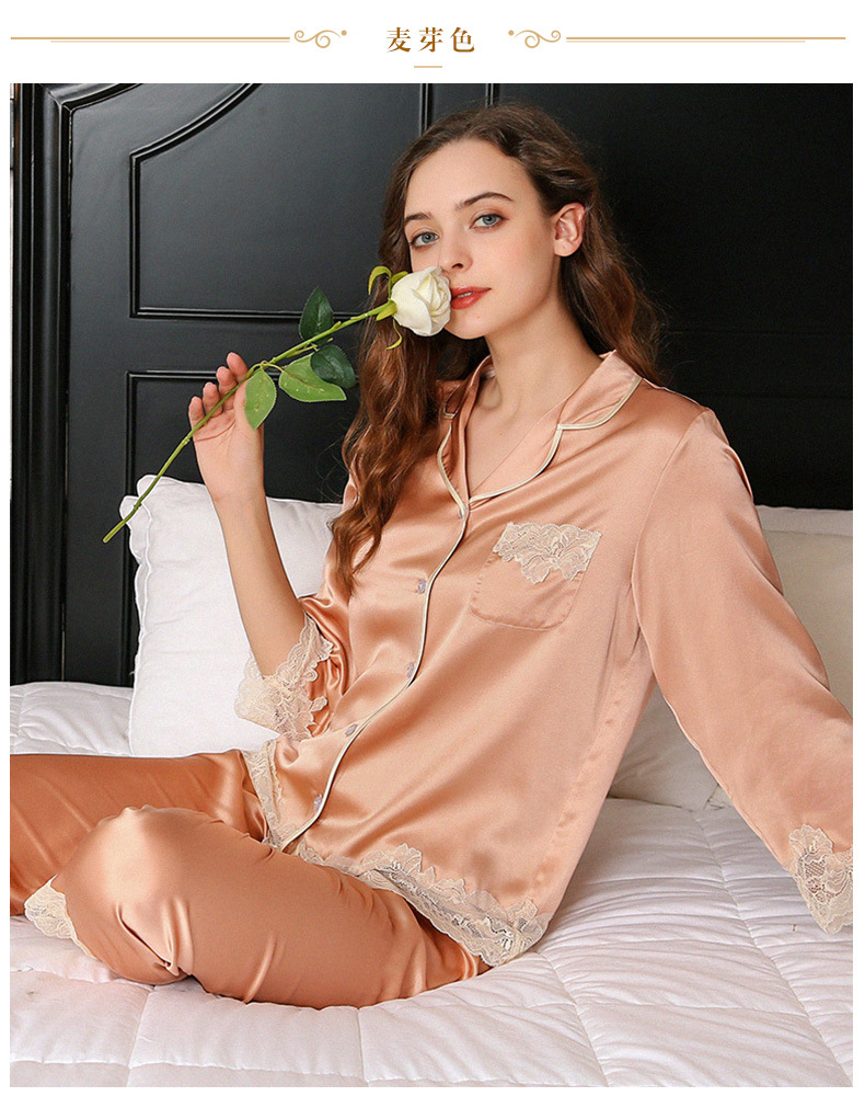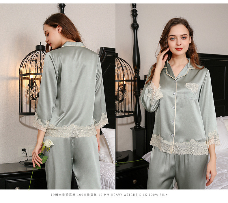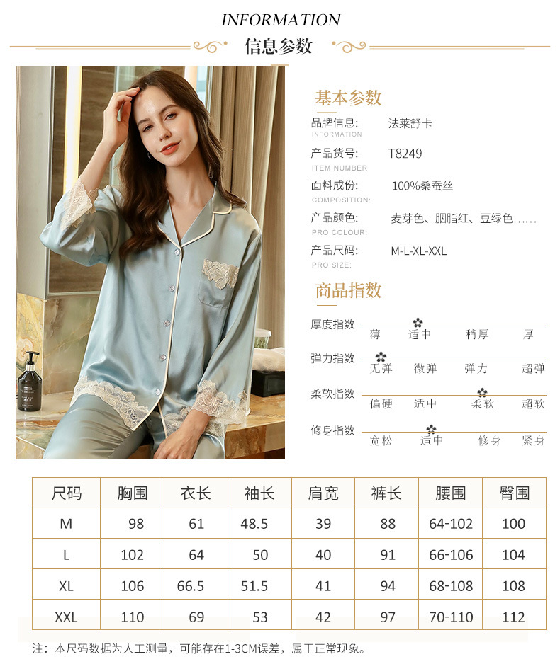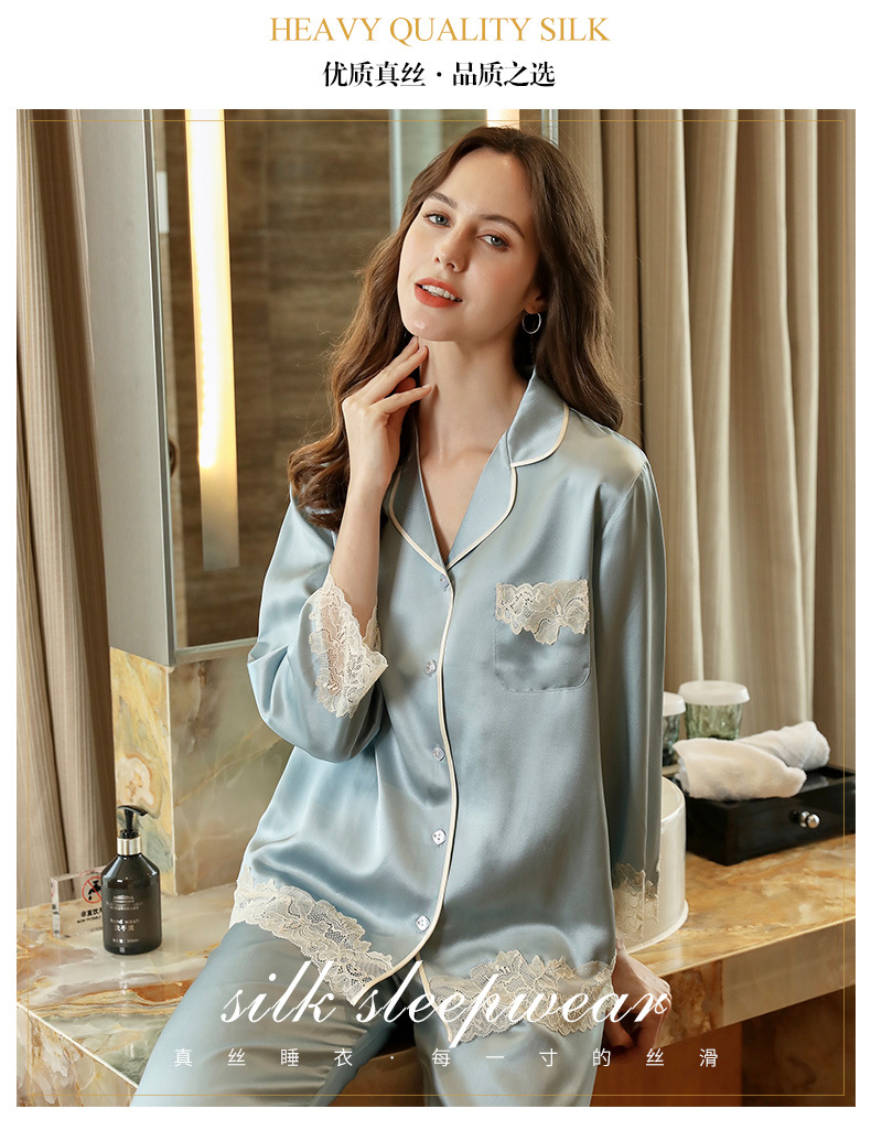 上海旗袍厂SK-T8249重磅真丝睡衣女春秋夏桑蚕丝绸长袖蕾丝家居服套装可外穿 T8249