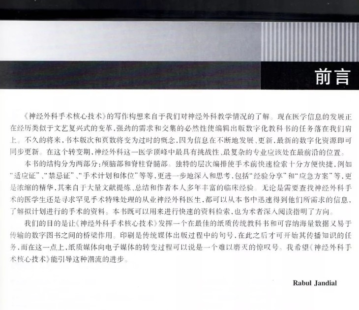 《神经外科手术核心技术(翻译版)》既可以用来进行快速的资料检索,也为术者深入阅读指明了方向。本书分为两部分:颅脑部和脊柱脊髓部分。独特的层次编排使手术前快速检索十分方便快捷,例如“适应证”、“禁忌证”、“手术计划和体位”等等,更进一步地深入和思考,包括“经验分享”和“应急方案”等,更是浓缩的精华,其来自于大量文献提炼、总结和作者本人多年丰富的临床经验。无论是需要查找神经外科手术的医学生还是寻求罕见手术特殊处理的从业神经外科医生,都可以从《神经外科手术核心技术(翻译版)》中迅速得到他们所需求的信息,了解拟计划进行的手术的资料。《神经外科手术核心技术(翻译版)》既可以用来进行快速的资料检索,也为术者深入阅读指明了方向。