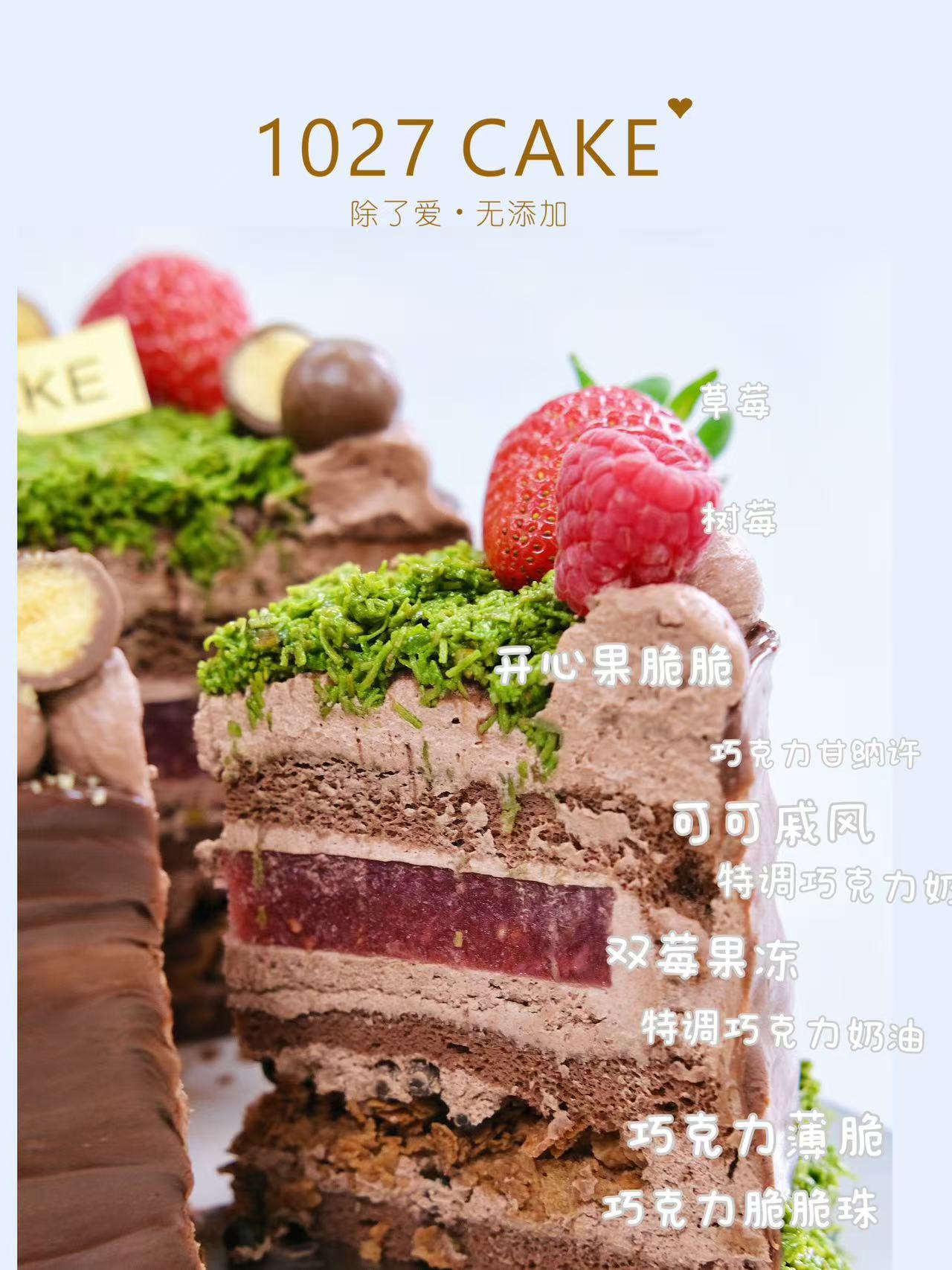 - 1027CAKE创立于2015年,一路以来,秉承除了爱,无添加的初心,甄选食材,专注研发,坚持最初的那颗心,只想让甜蜜蔓延。