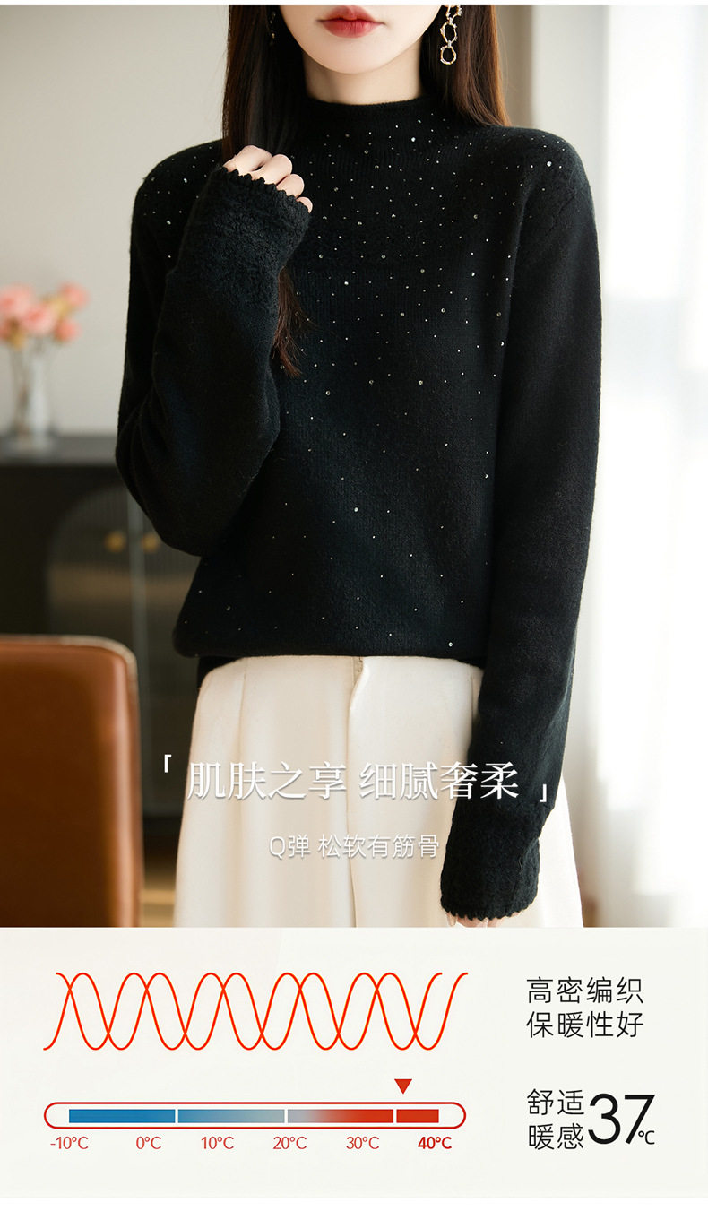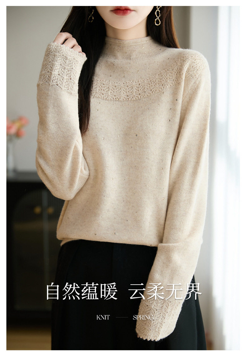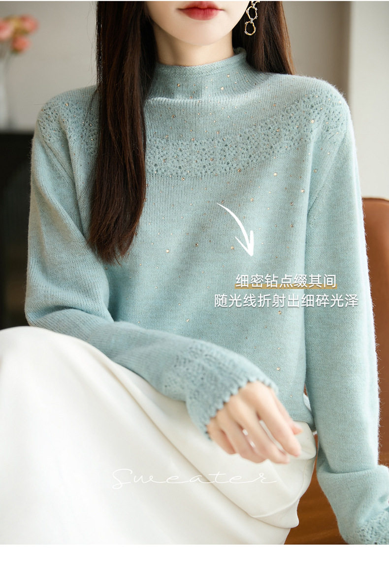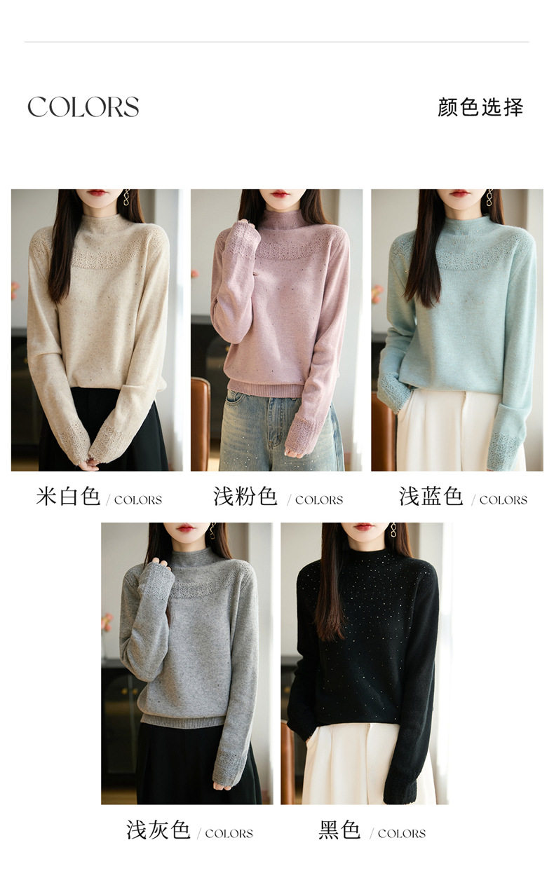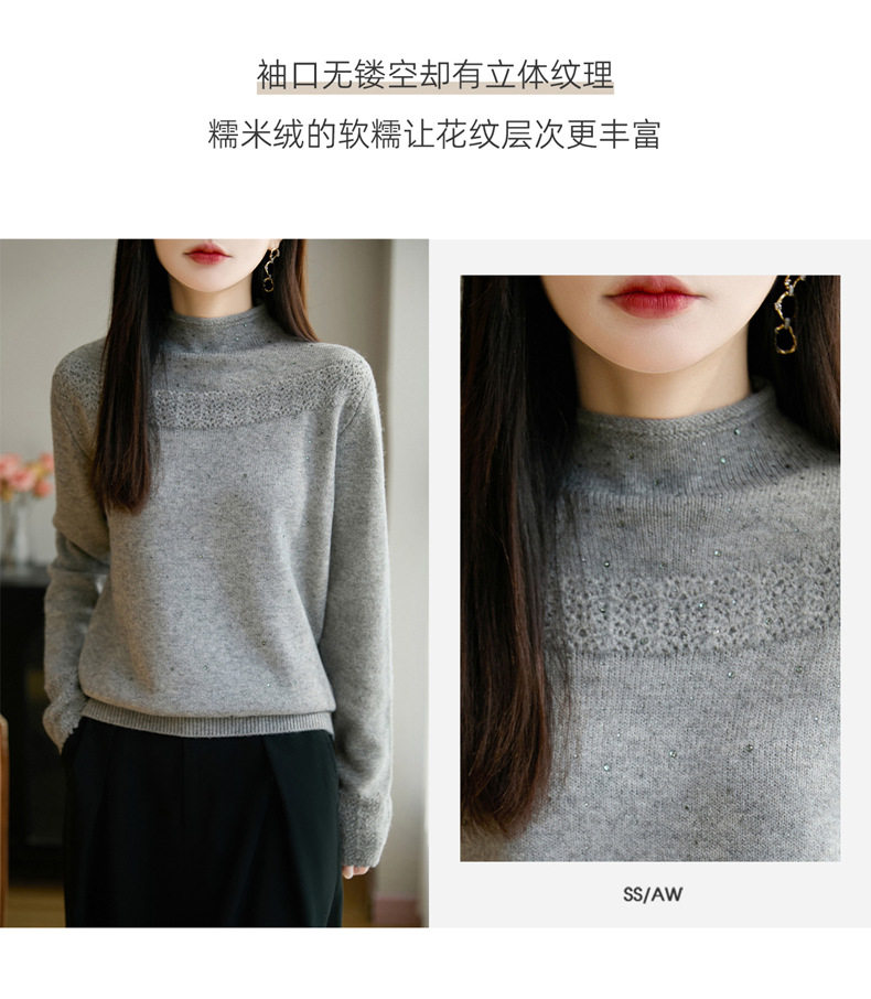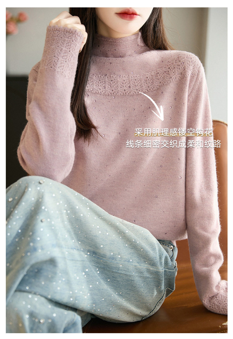 「自」全新升级【铂金会员128/天猫169/差价41】(10811)洛诗琳时髦半高领钩花毛衣2026新款气质烫钻保暖针织打底衫