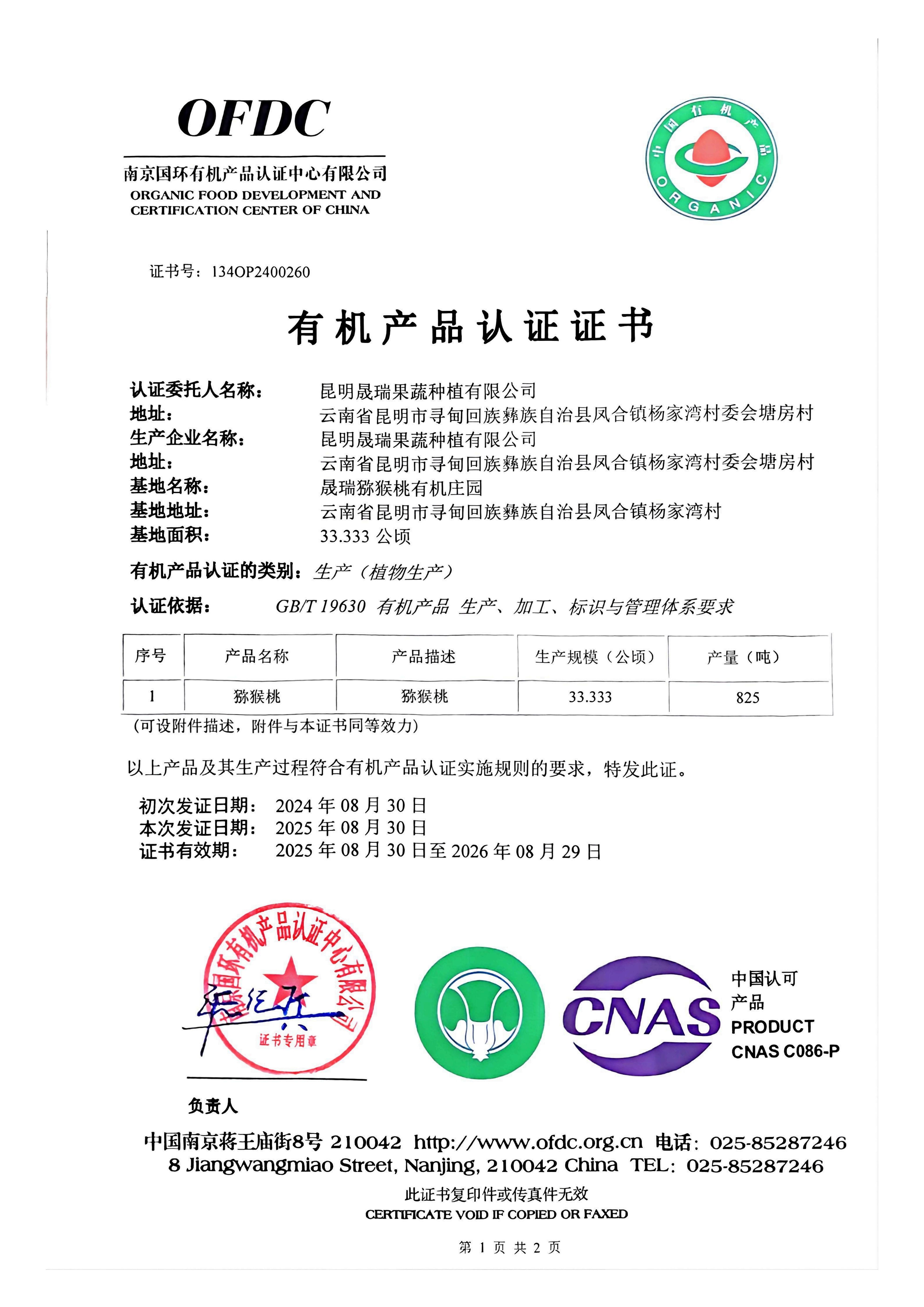 【商品名称】:云南高原有机猕猴桃