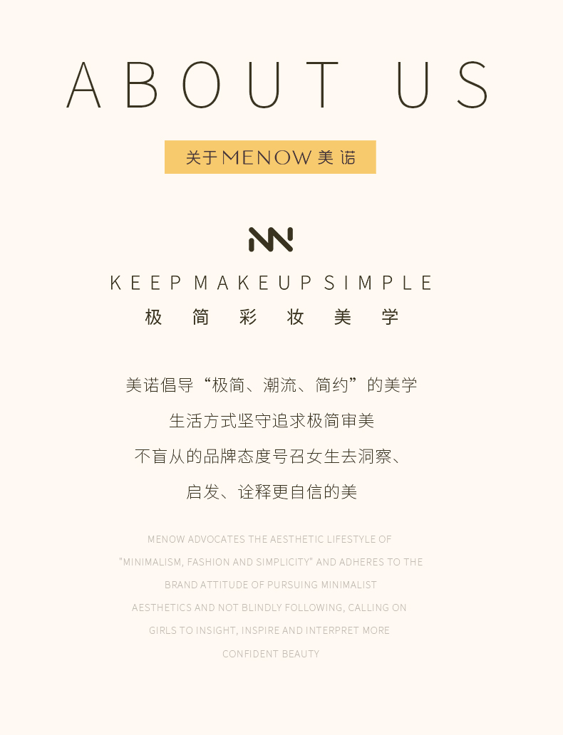- 全球性彩妆品牌,专注开发高品质的适用性美妆产品。拥有20多年美妆经验,产品远销欧美等80多个国家。美诺彩妆致力于给用户带来“爱与美,年轻,不一样的品质彩妆体验”。