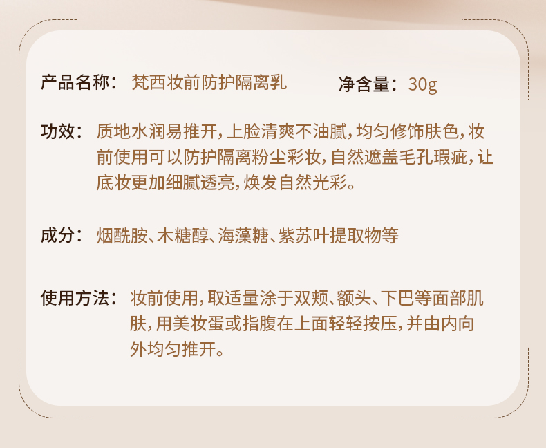 【梵西新品 119元任选3件】梵西妆前防护隔离霜妆前乳保湿提亮素颜霜粉底遮瑕隔离女官方正品 30g/支